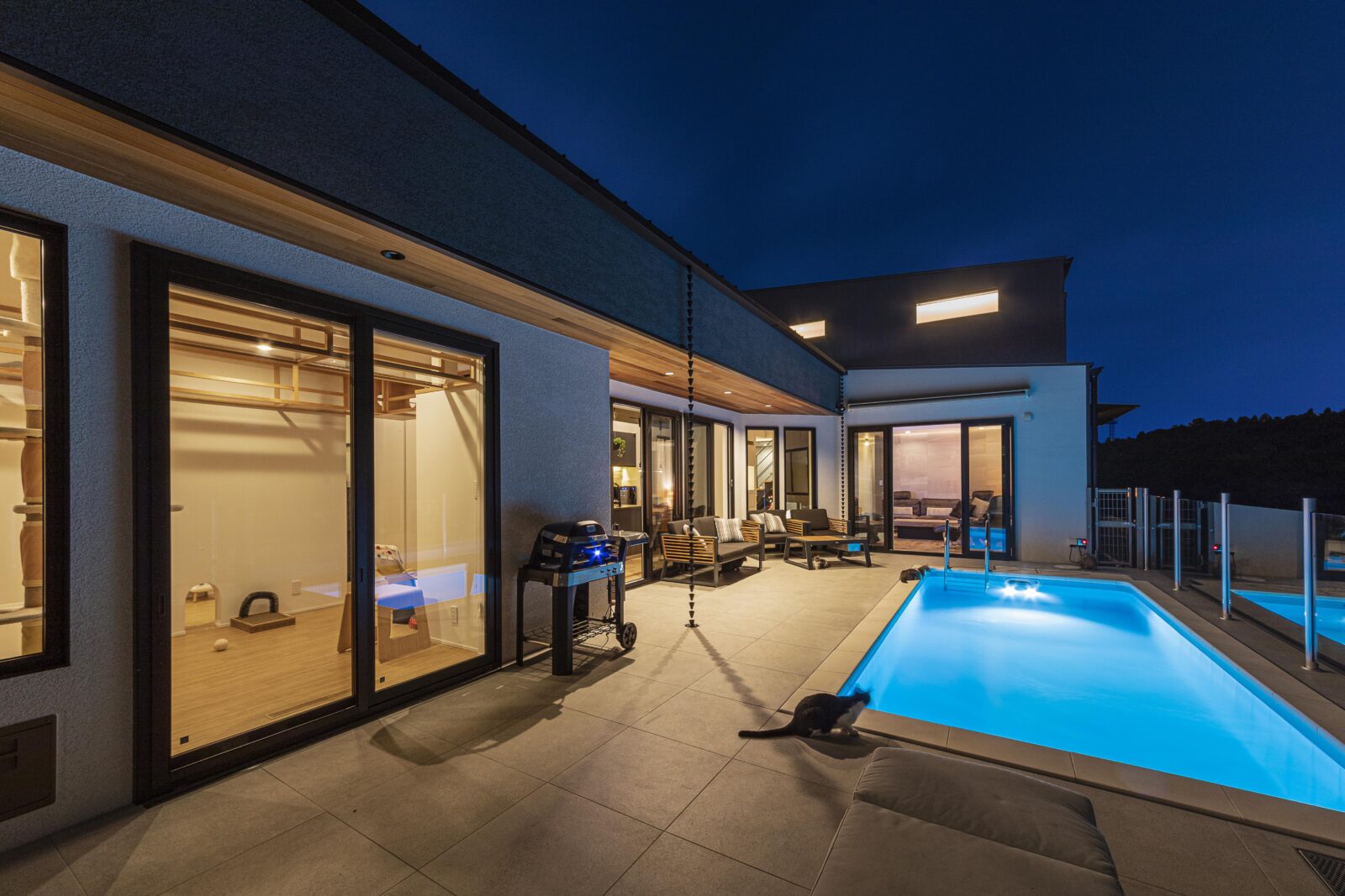 MOMO 建築エリア 千葉県 建築年 2022 敷地面積 290.96m² 延床面積 183.41m² 高台で南側に森が広がるロケーションを生かした、南国のリゾート地にいるような非日常空間の住宅。 北側のファサードは水平基調で塗り壁をベースに、木と花ブロックでアクセントをつけ重厚感を演出。 植栽はお施主様自ら作業しており、道路側の床はガレージ内まで同タイル仕上げています。 敷地に入るところから、内部までシークエンスにこだわり、空間を構成。 タイル床が際立つ白い玄関ホールのガラス戸の向こうに暖炉が現れ、LDKに入ると絶景が飛び込んできます。 暖炉上のタイル張りの壁は両面に大画面テレビを埋込み、リビングとダイニングでそれぞれくつろげる様に。 キッチンとダイニングテーブルの上部の、タイル張りの下がり天井は間接照明を仕込み光の広がりに美しさを感じられます。 書斎は落ち着いて作業ができるように黒を基調に構成し、デスクに座った際に目線の先に森が広がる位置に開口を設置。 猫専用の遊び部屋と食事部屋をキッチンの奥に設置。キャットウォークは大工が細部にまでこだわり製作しました。 お施主様が細部にまでこだわり、いかに美しく、いかにかっこよくを考え、選定し造られた住宅になりました。