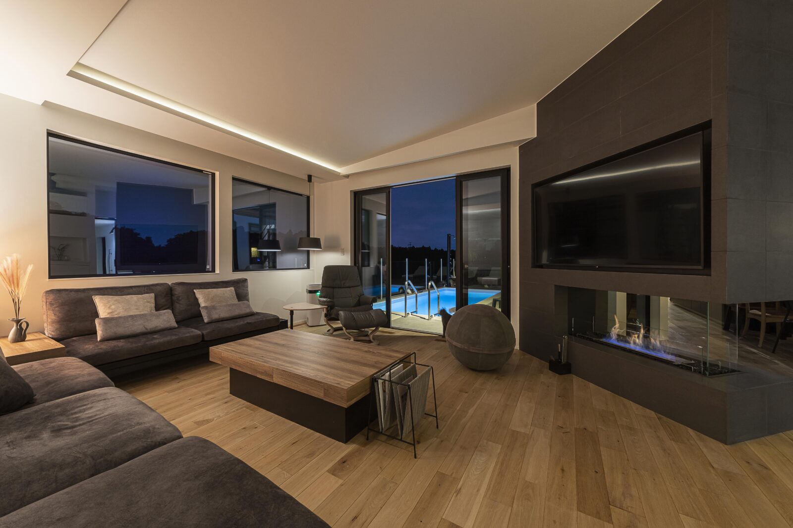 暖炉上のタイル張りの壁は両面に大画面テレビを埋込み、リビングとダイニングでそれぞれくつろげる様に。