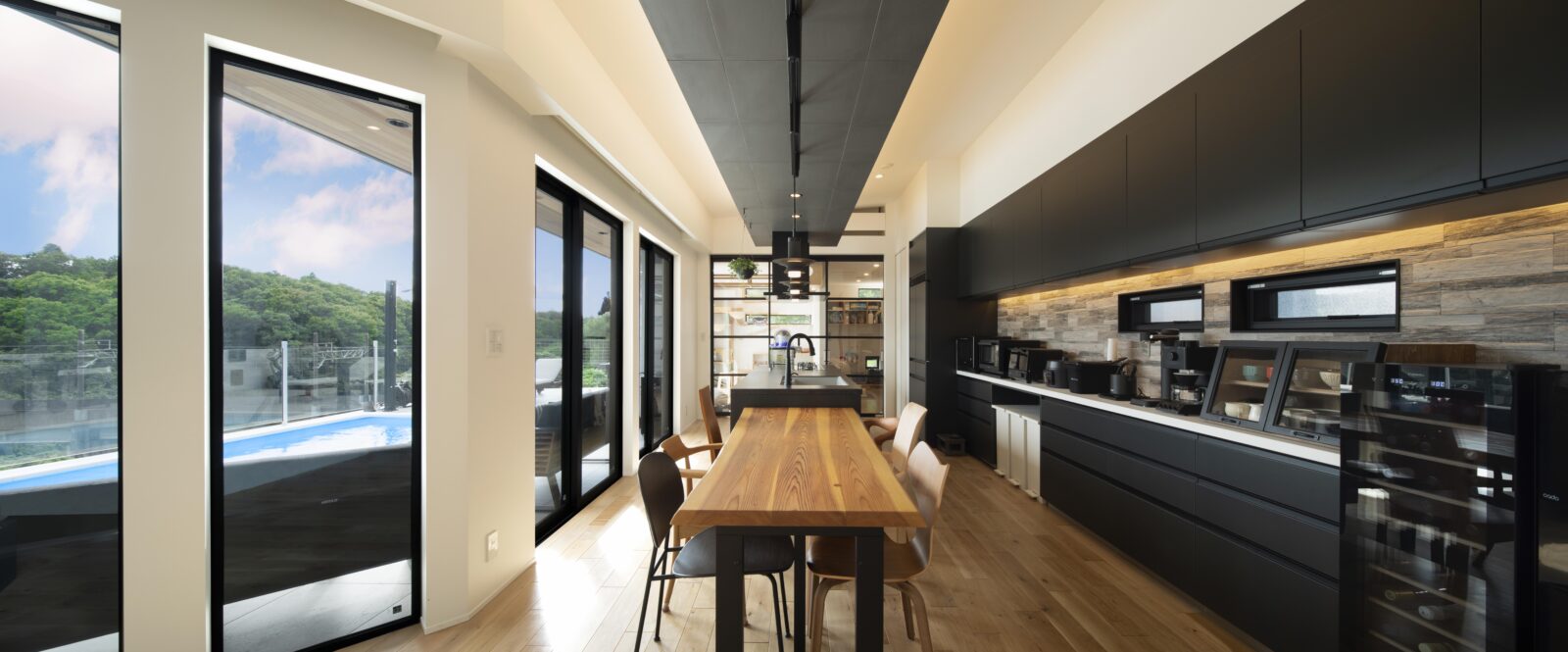 キッチンとダイニングテーブルの上部の、タイル張りの下がり天井は間接照明を仕込み光の広がりに美しさを感じられます。