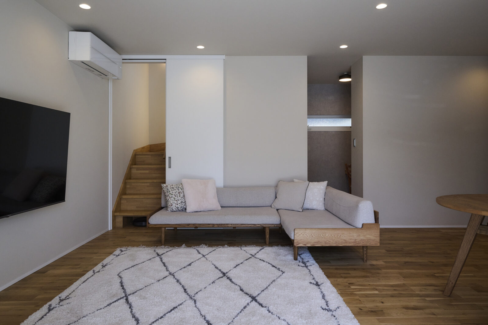 LDKから2階へ続く階段には扉を設け、1段目下部は掃除ロボットの収納庫とし、家事効率と空調効率を考慮した計画としました。