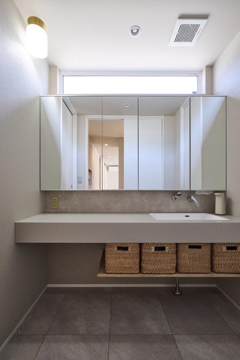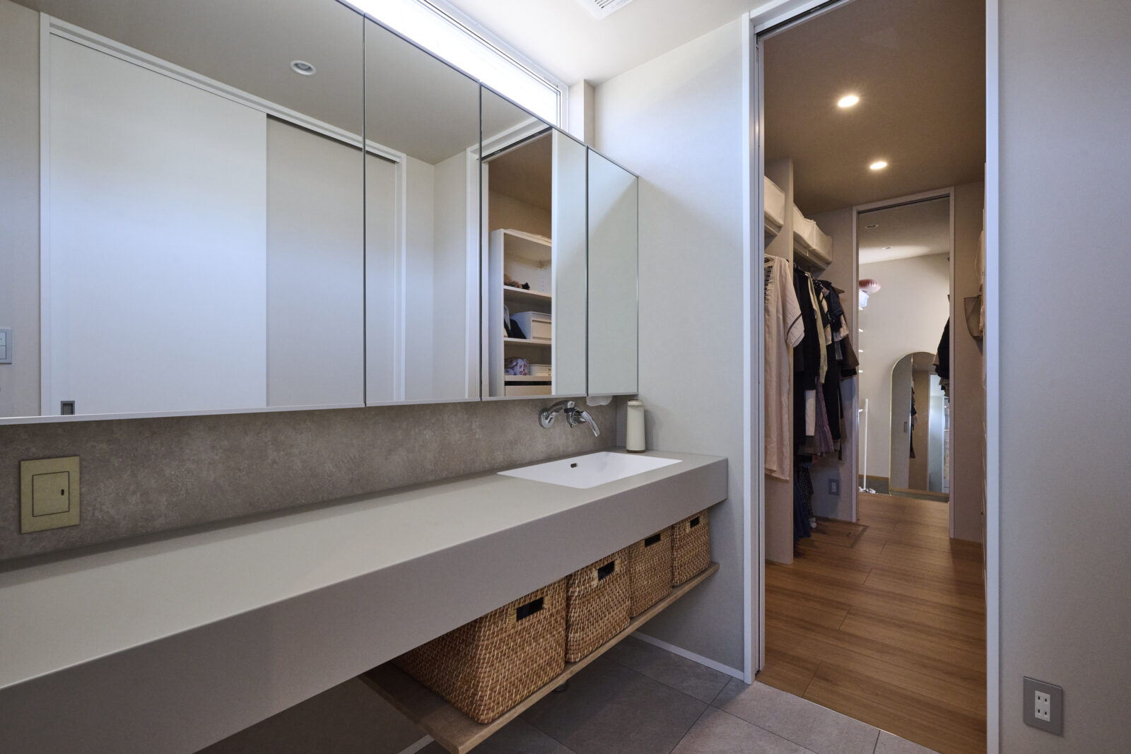 お施主様との打ち合わせを重ね、壁面タイルや照明器具、玄関収納上には洗面ボウルを配置し、衛生面に配慮しながらも美しさを両立させた空間となりました。