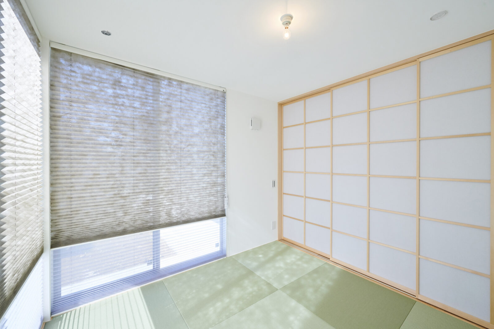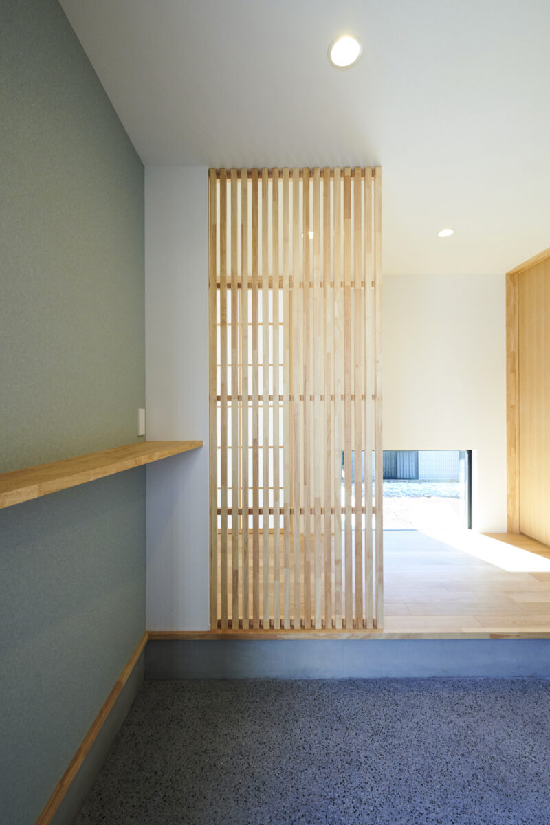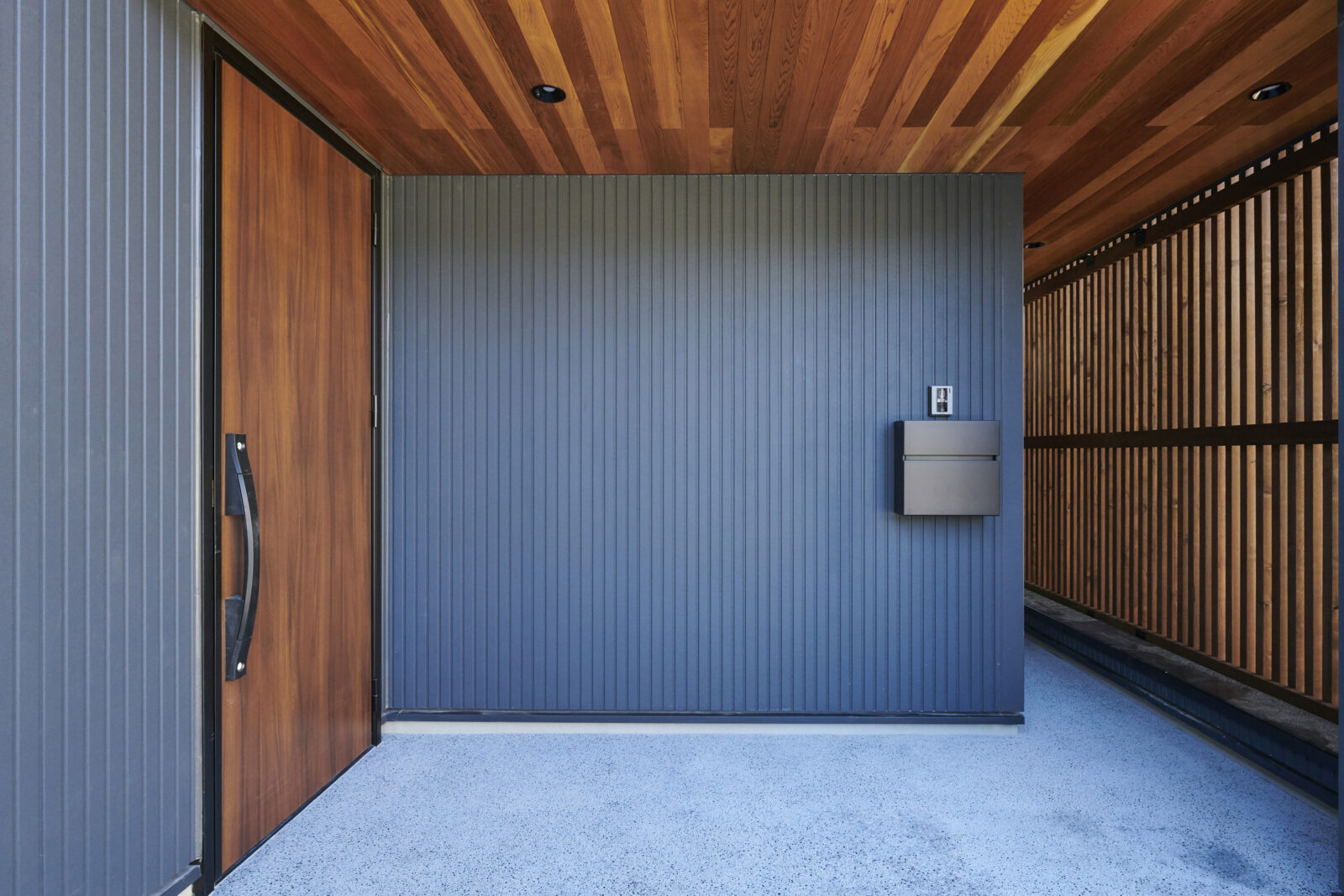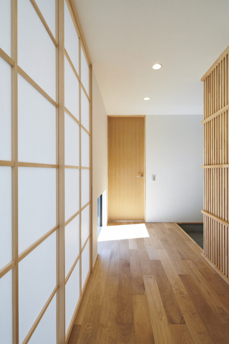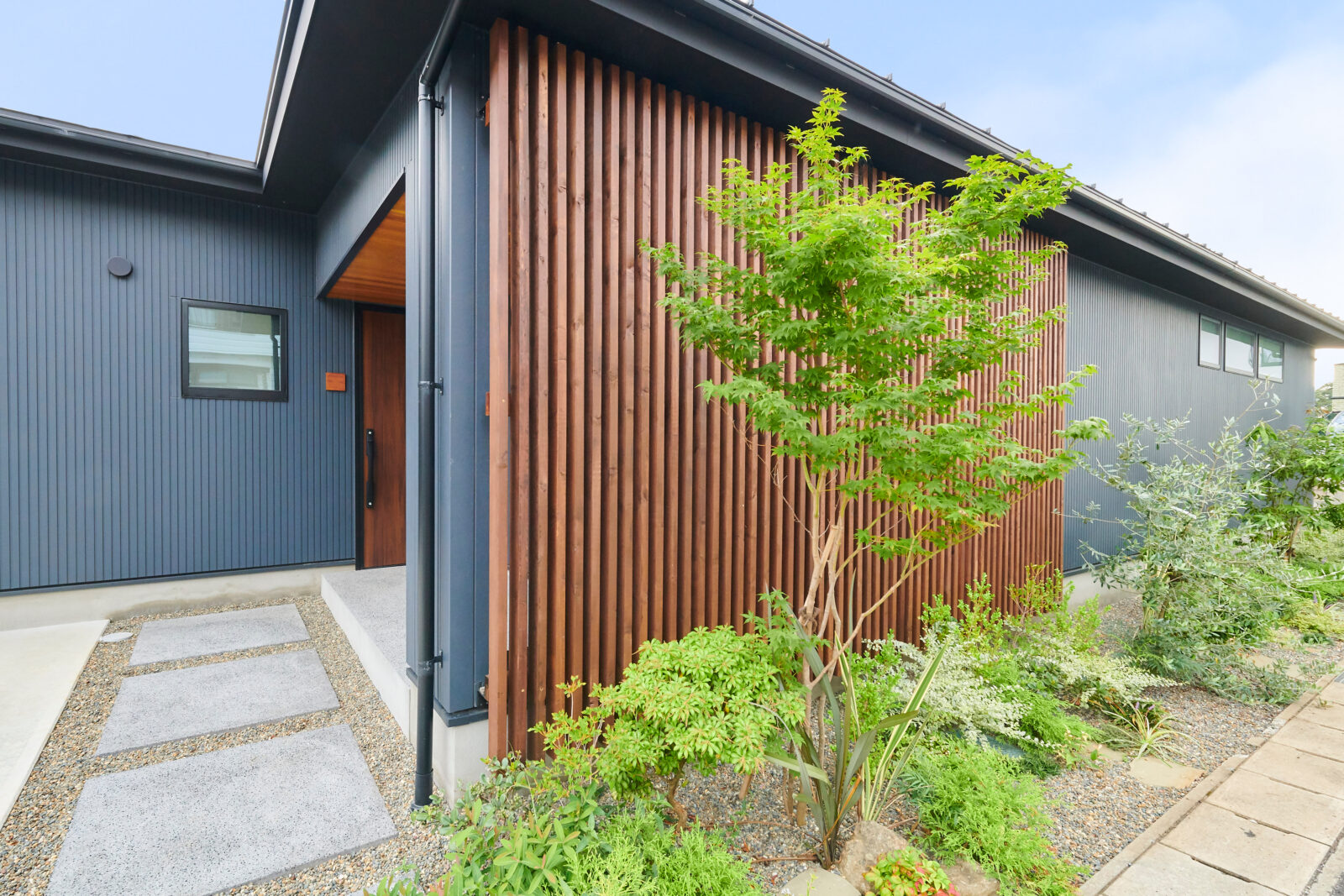 線の平屋 建築エリア 千葉県 建築年 2019 敷地面積 269.03m² 延床面積 109.72m² 水平方向に広がる伸びやかな黒い外観に、縦格子がアクセントの平屋。 玄関をくぐるとクールな黒い外観から一転、 上品な色使いと和心を感じる素材が柔らかな雰囲気を醸し出します。 内部は様々な動線を意識してプランニング。 玄関→SIC→食品庫→キッチン(勝手口)へと流れるスムーズな家事動線と、 各居室をリビングを中心としてアクセスするようにした、自然と家族が リビングに集まる生活動線となっています。 リビングは南のお庭に対してめいいっぱい開口部を設け、 勾配天井も相まって開放感のある魅力的な空間に。 各部屋が外部土間、お庭とゆるやかなつながりを持ち、 平屋ならではの魅力がたっぷり感じられるお家となりました。