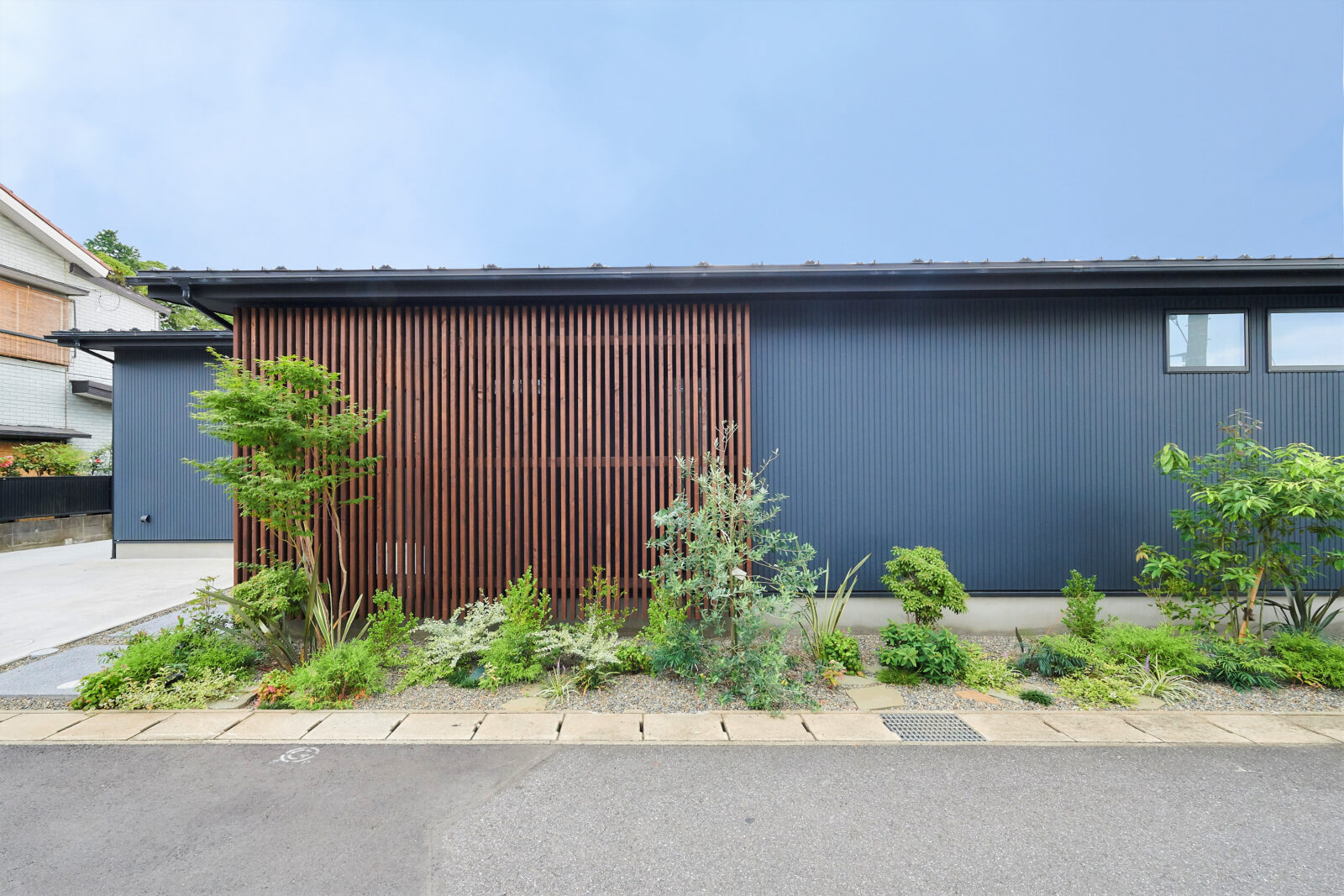 水平方向に広がる伸びやかな黒い外観に、縦格子がアクセントの平屋。