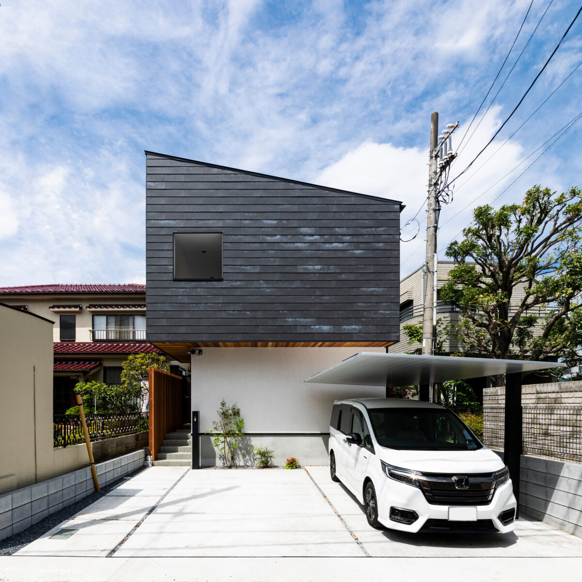 SOLID 建築エリア 千葉県 建築年 2022 敷地面積 155m² 延床面積 120m² SOLIDO×塗り壁×レッドシダーのファサード。 お施主様ご自身で選ばれました、こだわりの植栽。 玄関を入ると中庭が見える大きな窓、中庭は玄関から続く造作ルーバーで お隣からの目線を感じられにくくプライベートな空間として使っていただけます。 Ent→SC→Familyclosetと外から家に入るまでの生活動線を考えた間取りにしました。 玄関入ってすぐのリビングへつながる扉は、造作建具です。 SUN roomはお施主様のご要望で南側に設け、雨の日でも安心して洗濯物が干せるスペースに。 LDKの吹き抜けは南からの光が入り、気持ちのいい空間になっています。 リビング上部の吹き抜けと階段の吹き抜けの間には、まるで橋のような面白い空間の2階廊下に。 MBRは勾配天井にし、天井部分を利用したLoft収納にし、バルコニーは外が抜けている気持ちのいい場所になりました。 タイルやモールテックス、造作収納等、お施主様と一緒に決めていき、こだわりとセンスがつまった空間になりました。