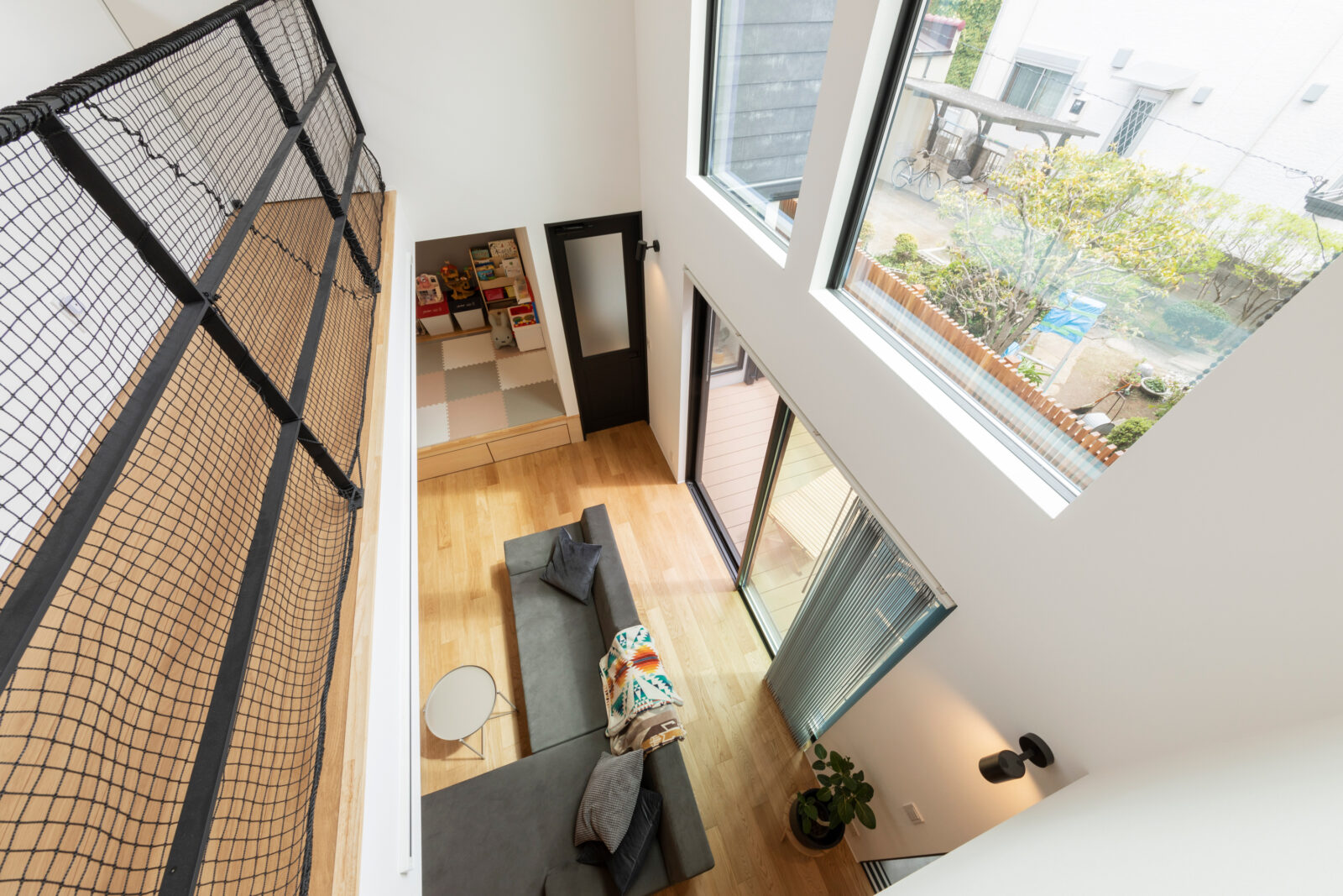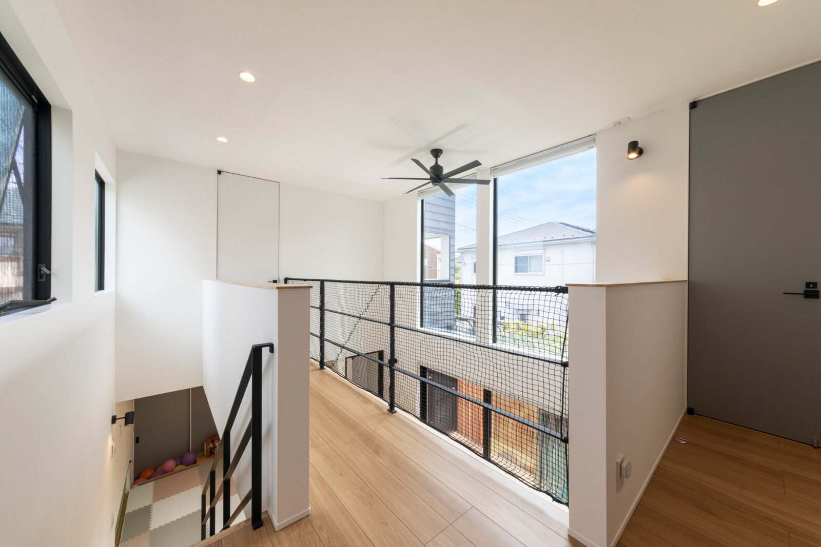 リビング上部の吹き抜けと階段の吹き抜けの間には、まるで橋のような面白い空間の2階廊下に。