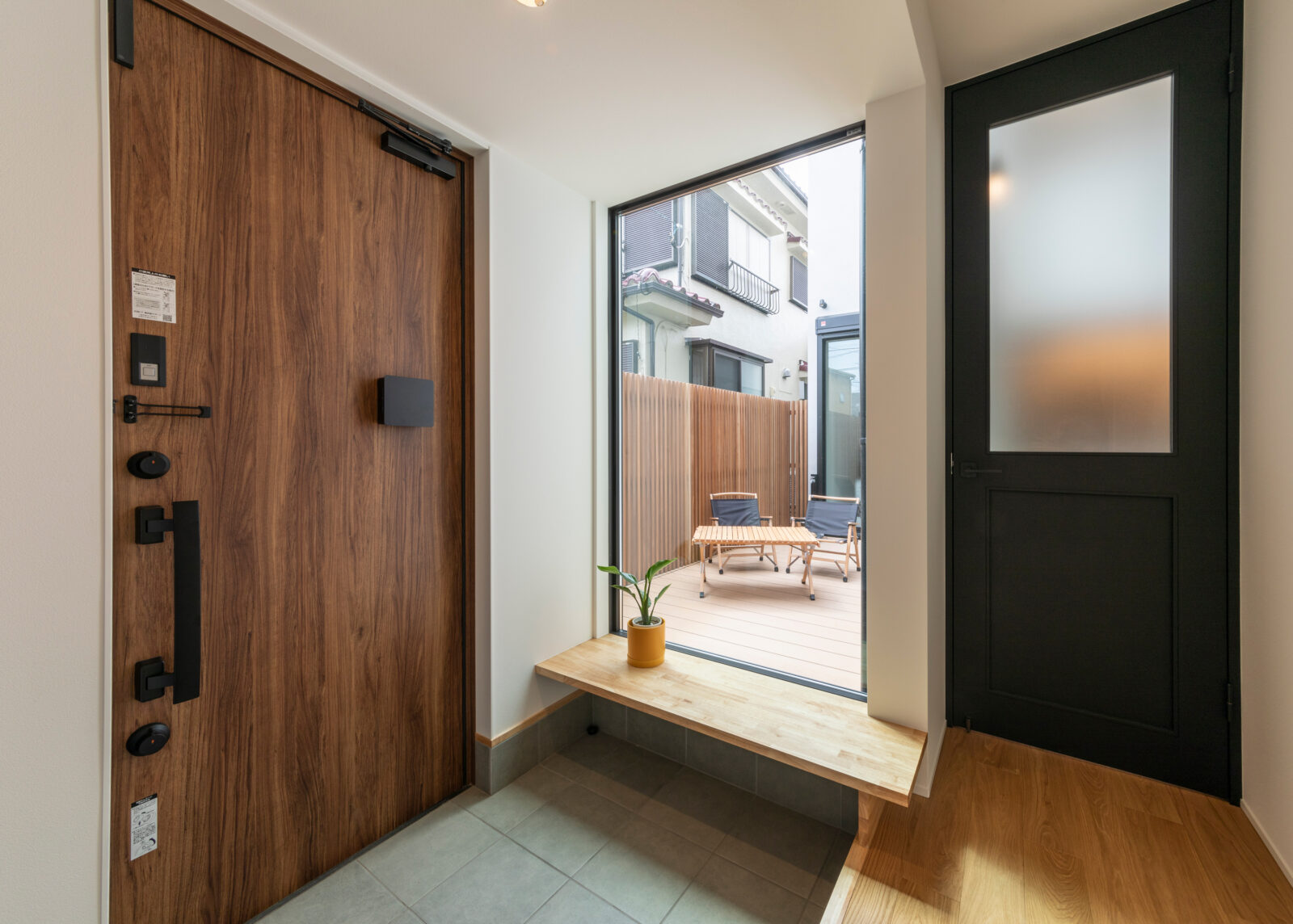 玄関を入ると中庭が見える大きな窓、中庭は玄関から続く造作ルーバーで