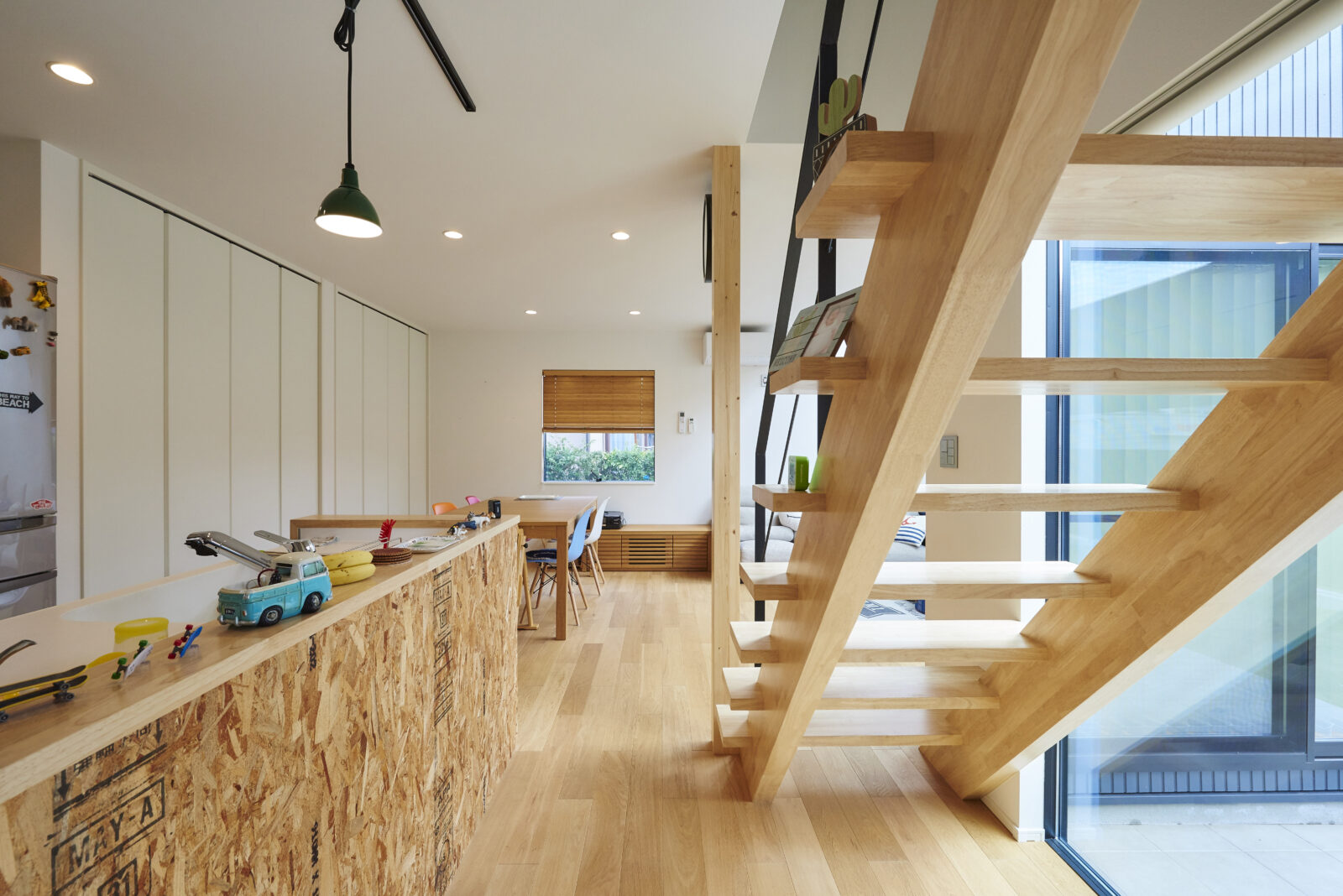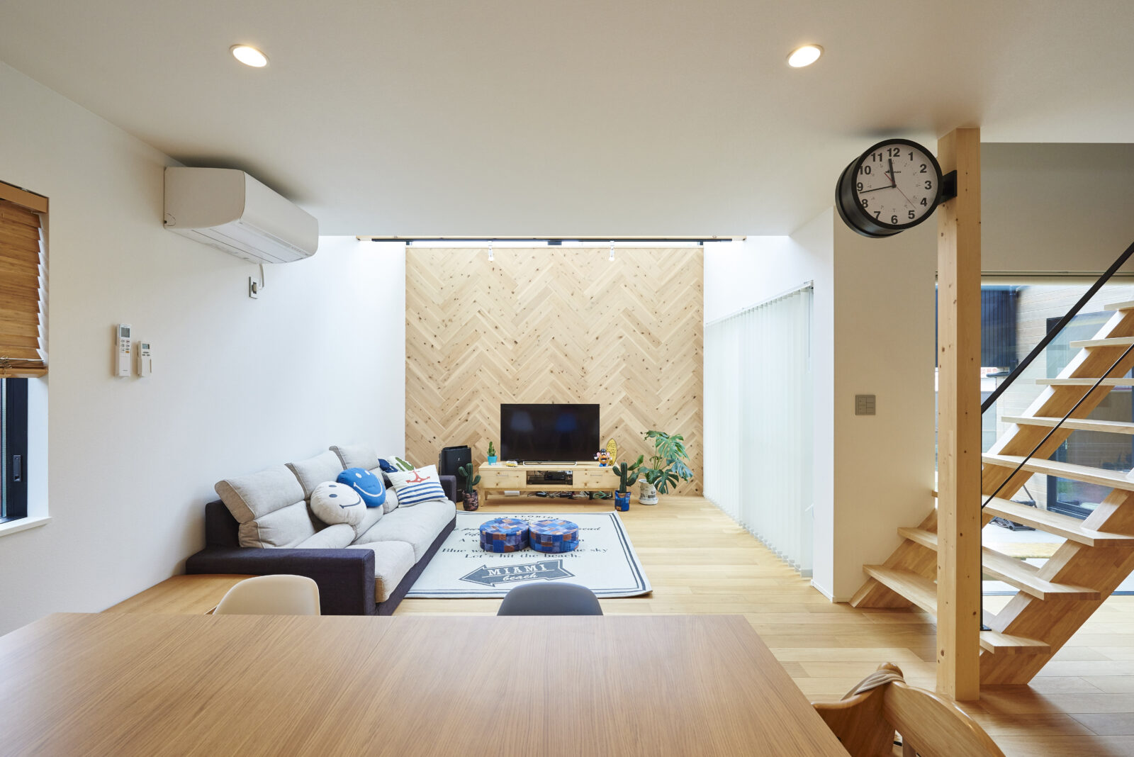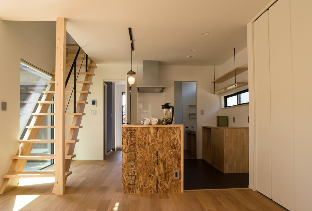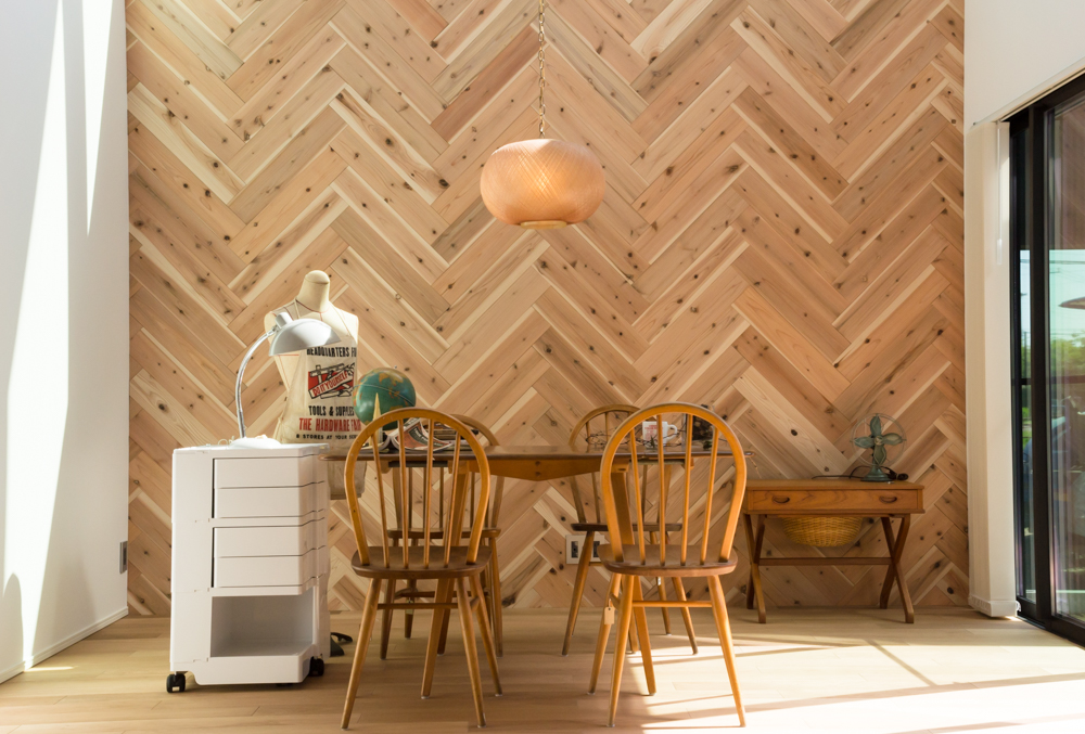 仕上げにはカリフォルニアを彷彿とさせるヘリンボーン張りの壁面と構造材をあらわしにしたキッチン、木製階段とスチール手摺の組み合わせや造作の洗面など。