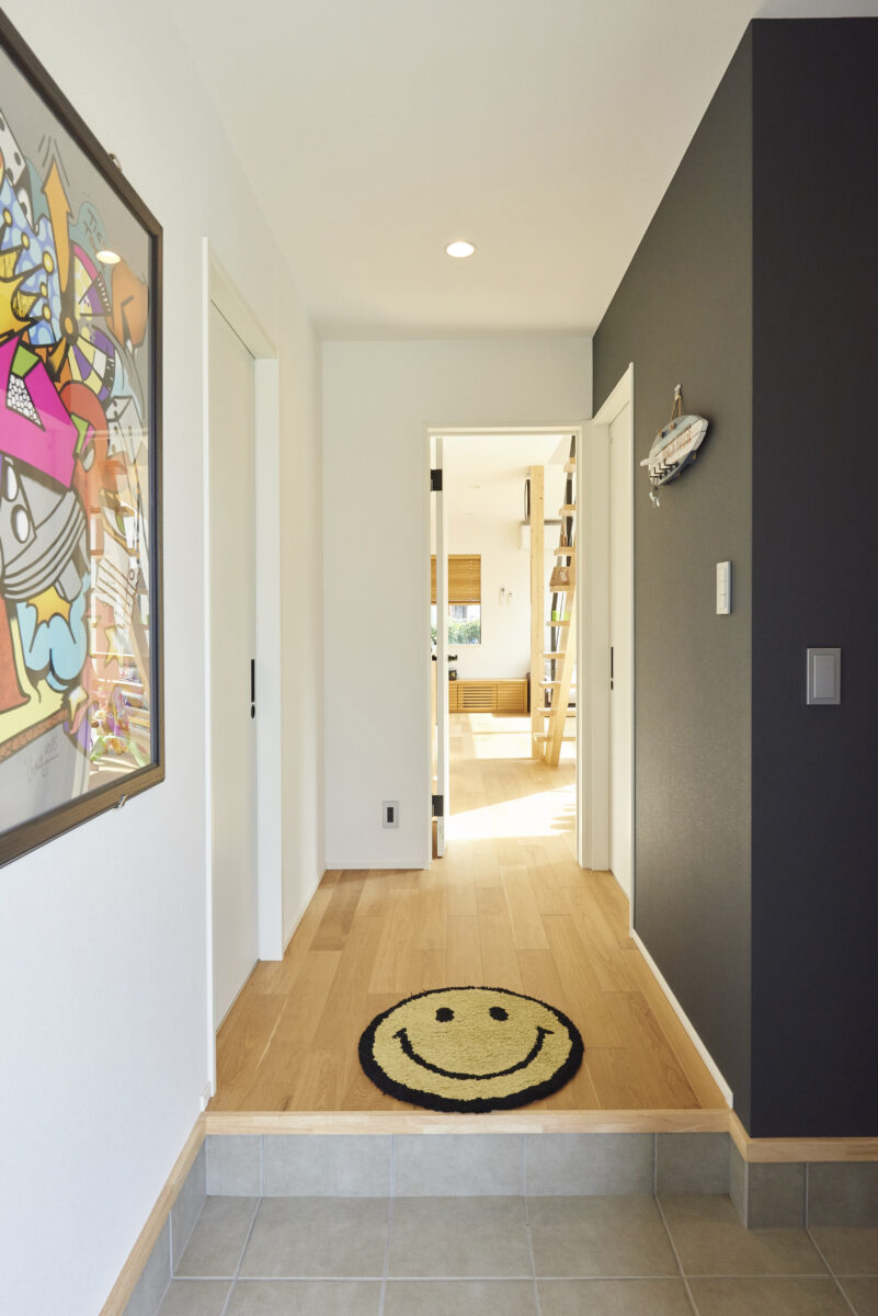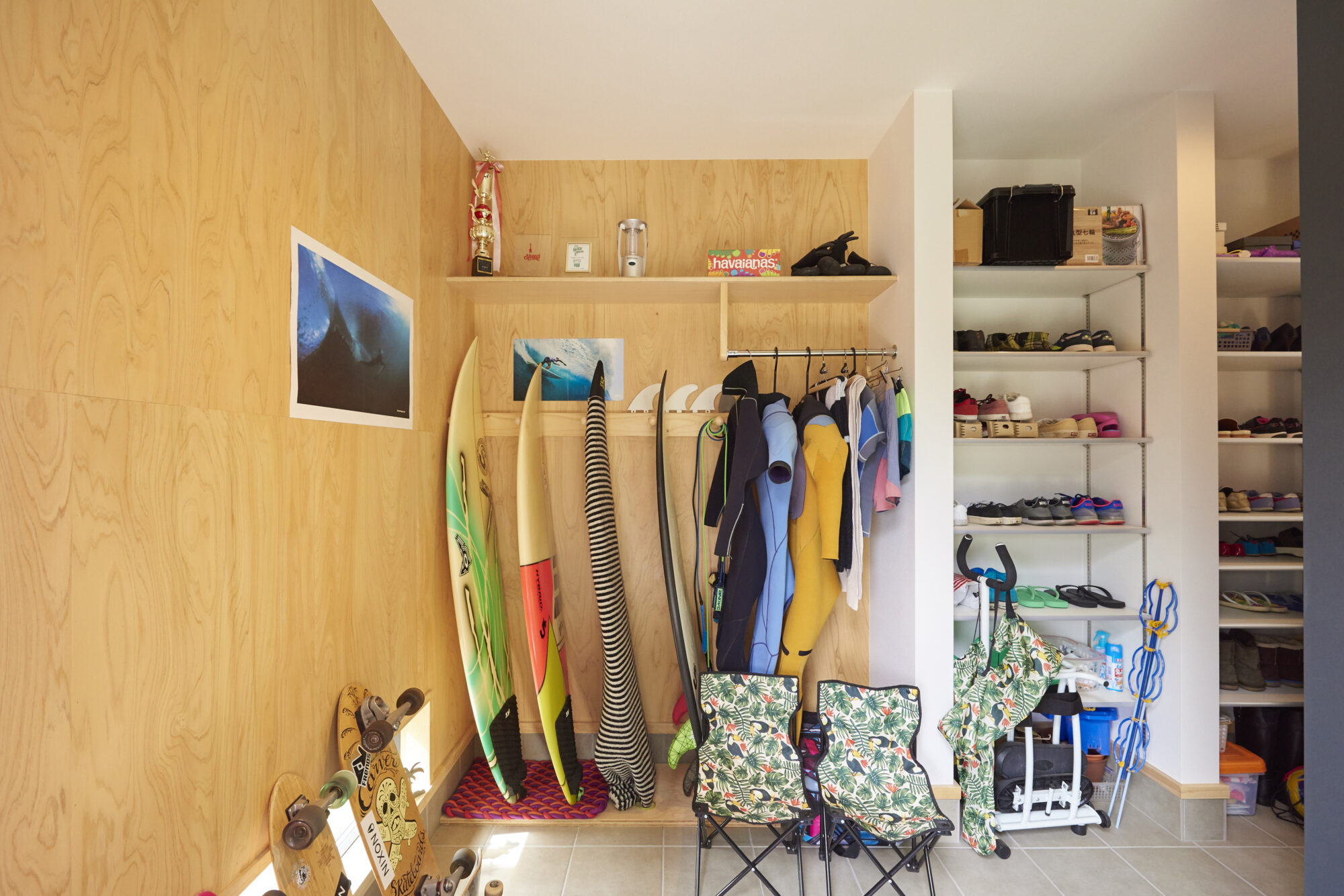 中庭を中心にしてリビングとドマのつながりを持たせることで、趣味のサーフィングッズのメンテも暮らしの一部となりました。
