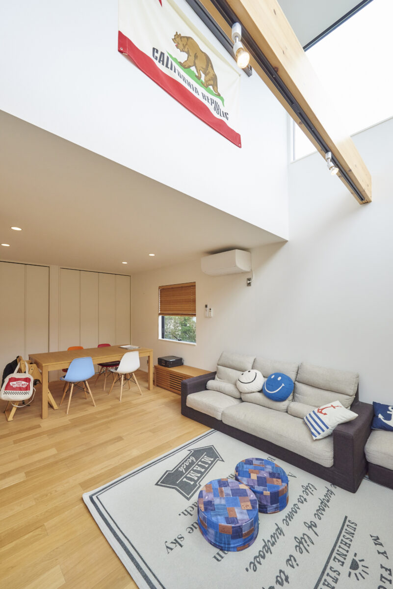 開放感のあるLDKのリビングに設けた吹き抜けからは大マドを通して一日中陽のヒカリが降りそそぐ気持ちの良い空間に。