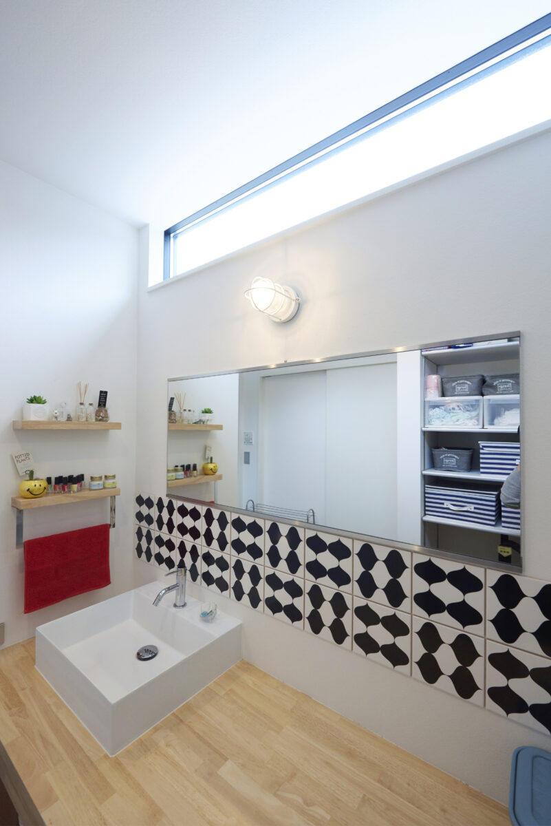 SUNNY HOUSE 建築エリア 千葉県 建築年 2013 敷地面積 246.76m² 延床面積 99.15m² マドのないシンプルなファサードにつめこんだのはカリフォルニア。 開放感のあるLDKのリビングに設けた吹き抜けからは大マドを通して一日中陽のヒカリが降りそそぐ気持ちの良い空間に。 中庭を中心にしてリビングとドマのつながりを持たせることで、趣味のサーフィングッズのメンテも暮らしの一部となりました。 仕上げにはカリフォルニアを彷彿とさせるヘリンボーン張りの壁面と構造材をあらわしにしたキッチン、木製階段とスチール手摺の組み合わせや造作の洗面など。 素材感と原色を効果的に用いた、底抜けに明るいご家族に似合うヒカリが降りそそぐ住宅です。