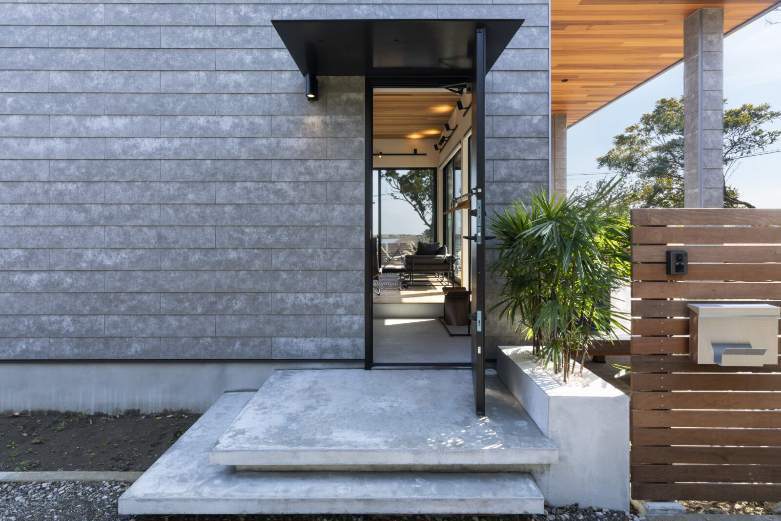 大きな窓から景色を最大限に取り込むリビングとは対比で、落ち着いて滞在ができるように、外部からの視線を遮るような外構計画を行いました。