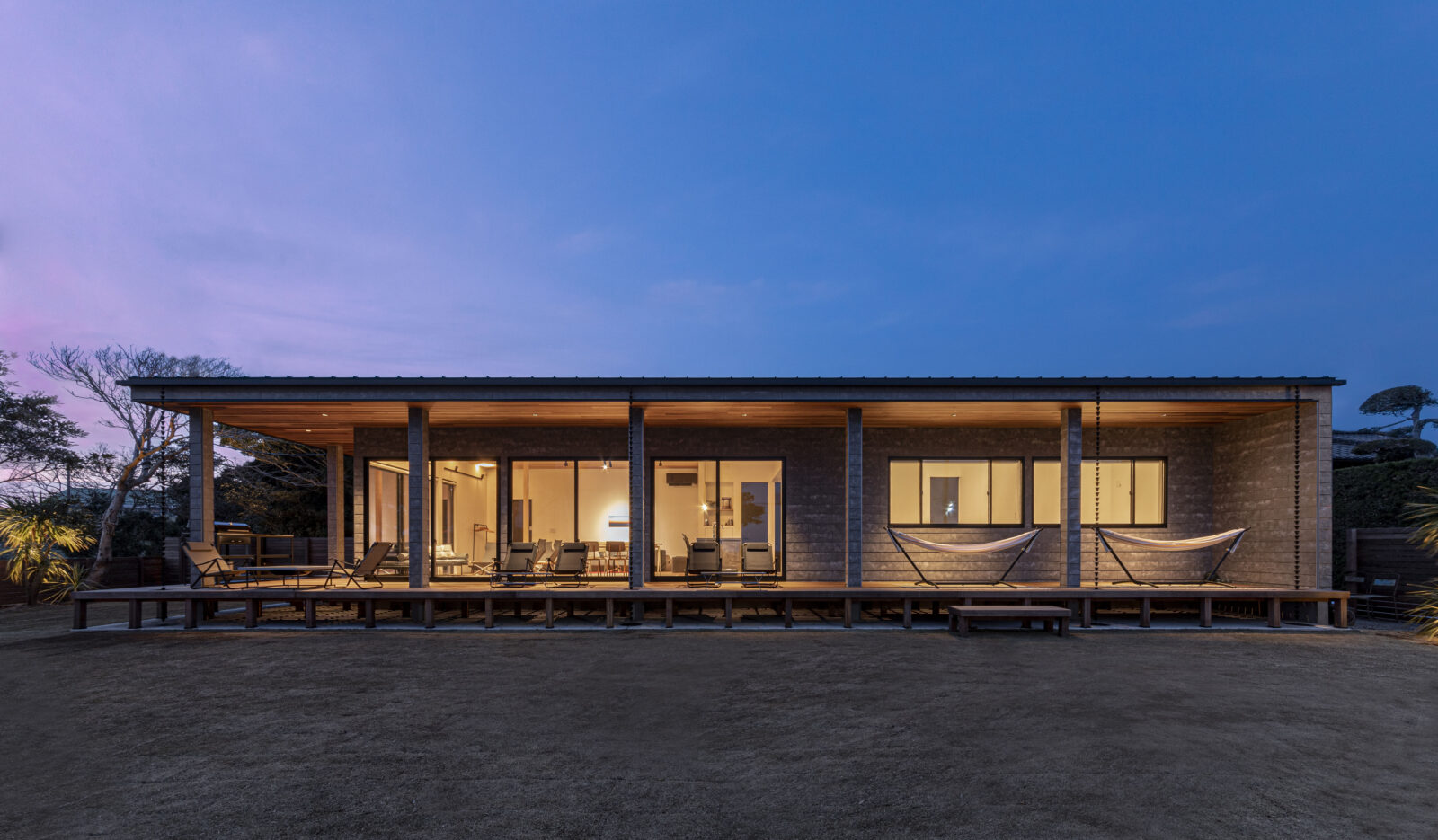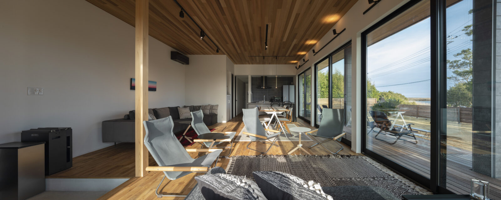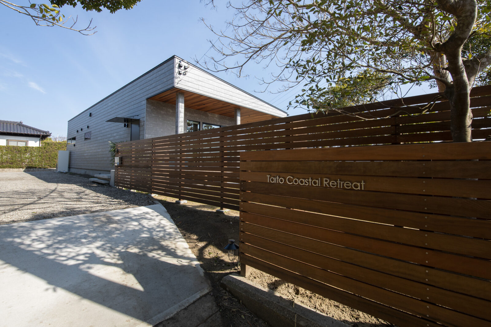 Taito Coastal Retreat 建築エリア 千葉県 建築年 2022 敷地面積 539.57m² 延床面積 89.43m² 波と風の音が聞こえるLagoon(潟湖)沿いに面した、非日常空間を味わえる平屋。 外壁全面をSOLIDOで覆った、まるで「ひとつの塊」のようなファサードです。 浮遊感のあるフロート階段を上がり、玄関扉を開けた先に景色が広がります。 LDKの天井からウッドデッキの軒天までレッドシダーで仕上げることで、内と外がフラットにつながる開放的な空間に。 リビングの照明をスポットライトで統一。 明かりの濃淡が生まれ立体感を演出し、落ち着いた雰囲気を創り出しています。 キッチン背面の壁にはアクセントで大判タイルを使用し、LDKの空間をグッと引き締めエレガントな印象を与えてくれます。 大きな窓から景色を最大限に取り込むリビングとは対比で、落ち着いて滞在ができるように、外部からの視線を遮るような外構計画を行いました。 訪れた人に感動を与えられるように、入口から室内へと続く動線と景色を最大限演出できる空間構成を行ったお施主様こだわりのお住まいです。 一棟貸しの民泊施設としてOPEN。楽しいひと時と非日常空間での感動をご体感いただけます。 □ Instagram https://www.instagram.com/taito_coastal_retreat □ airbnb https://air.tl/MEjvgDXo
