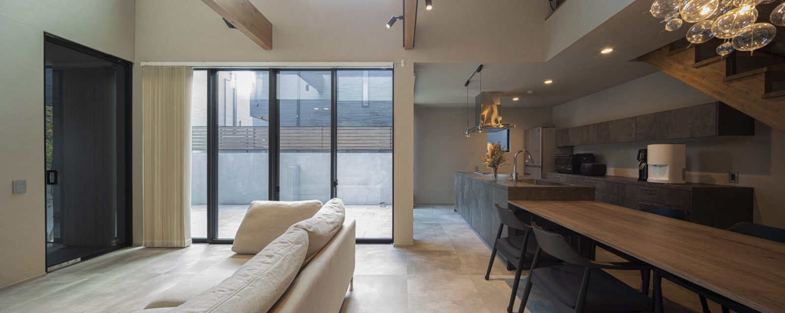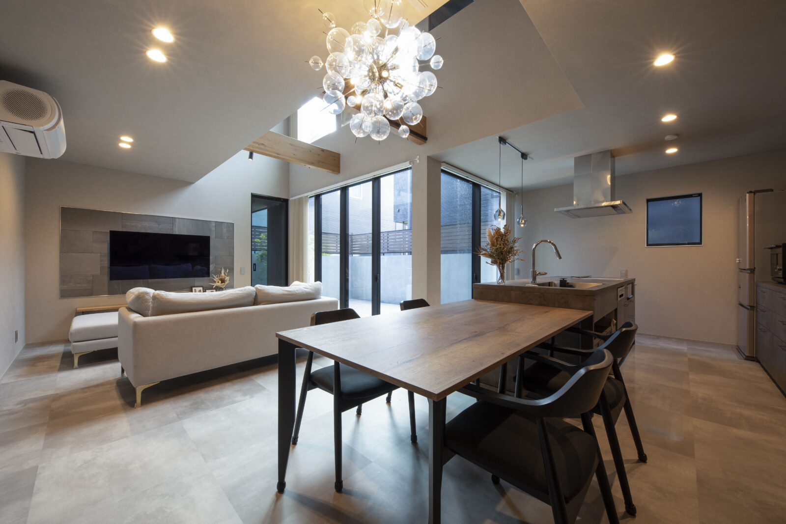 玄関と中庭は磁器タイル、LDKは同色調のフロアタイルで仕上げることで、視覚的な連続性を持たせた広がりのある空間に。