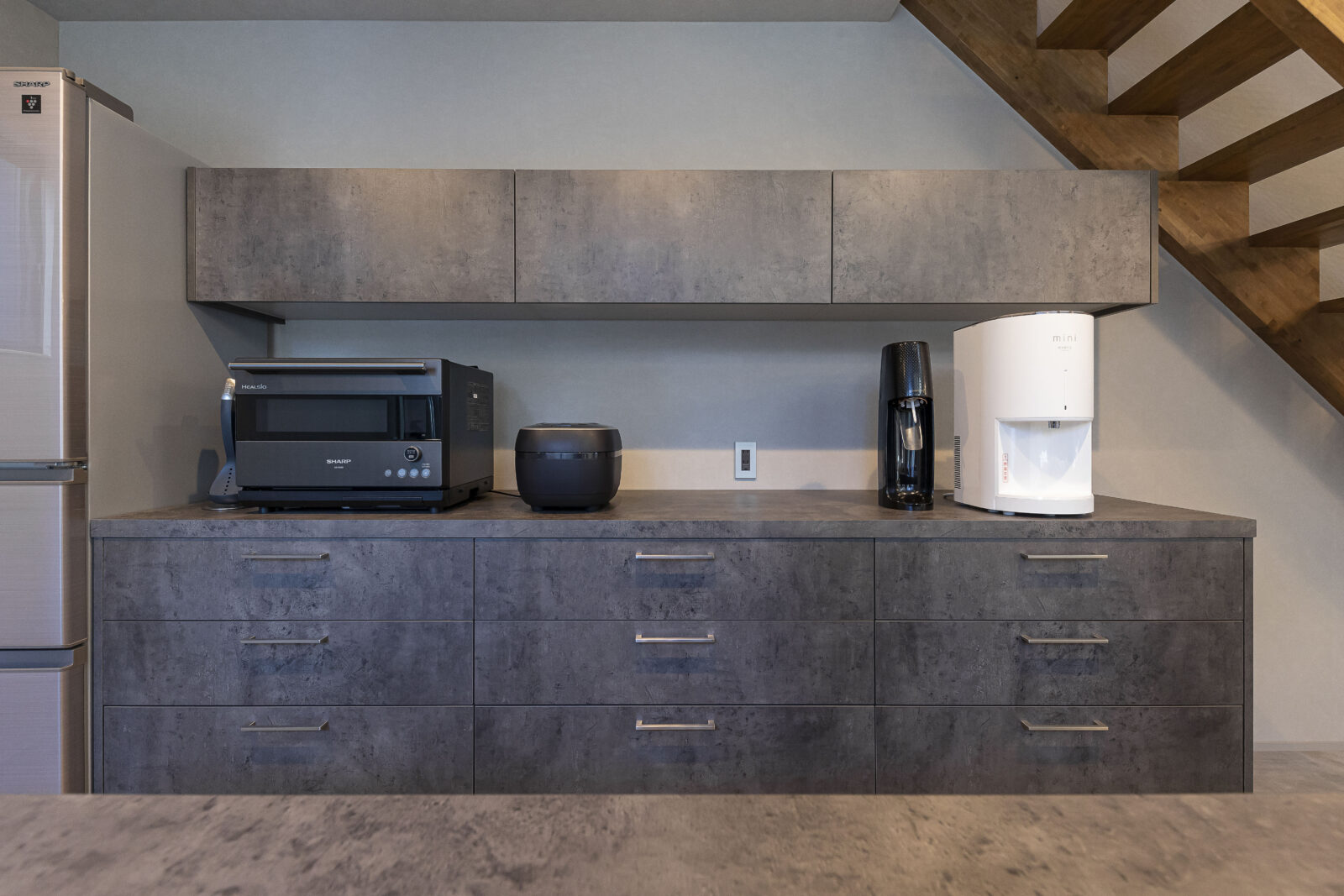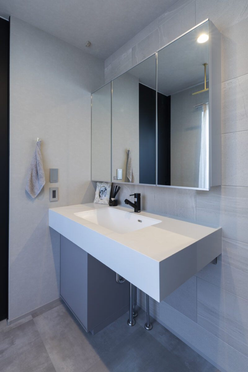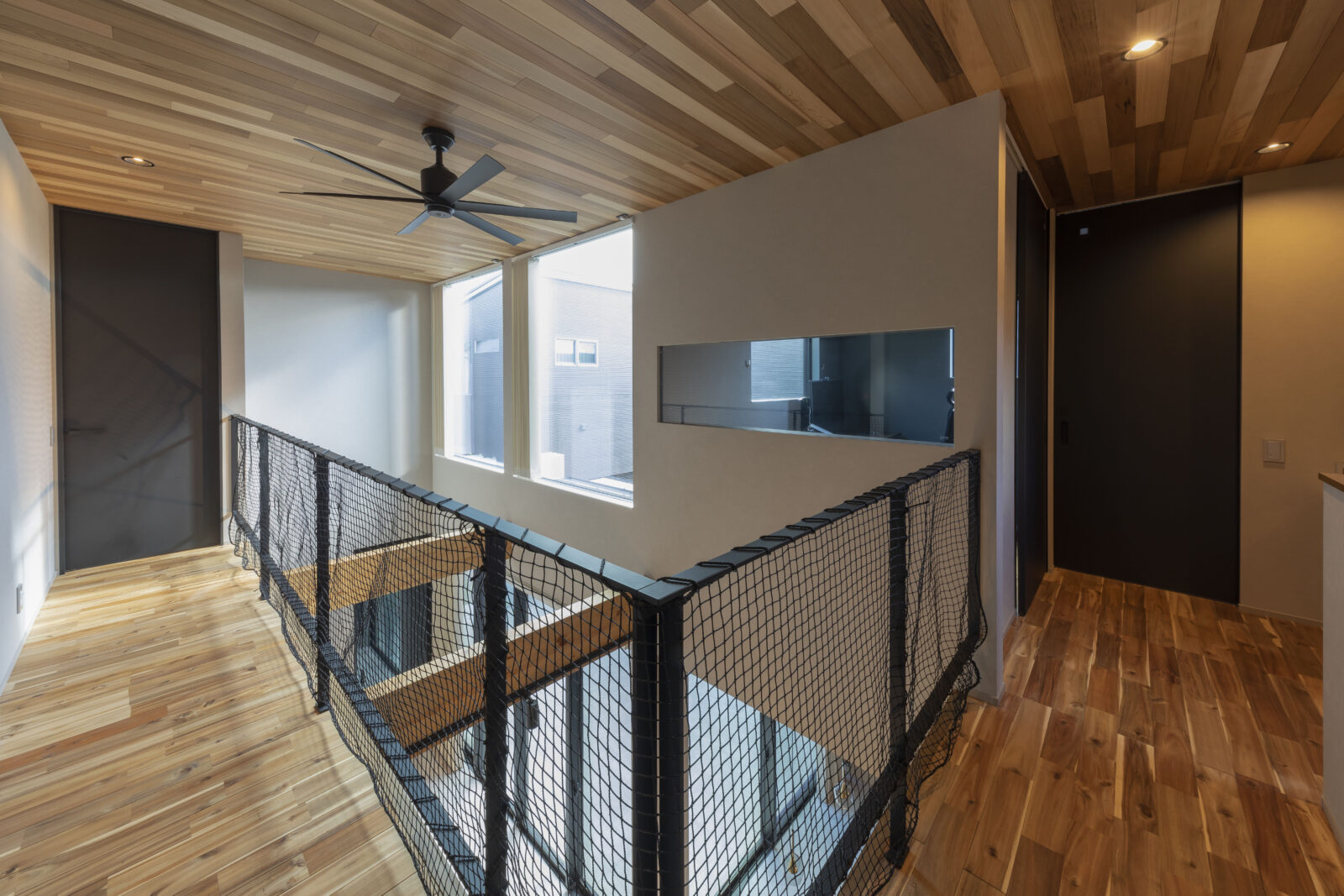 グレートーンで洗練された空間の中に、吹抜のレッドシダーや無垢のアカシアなど、木の温かみを感じられる素材をバランスよくレイアウトし、落ち着いた心地よいインテリアに仕上げています。