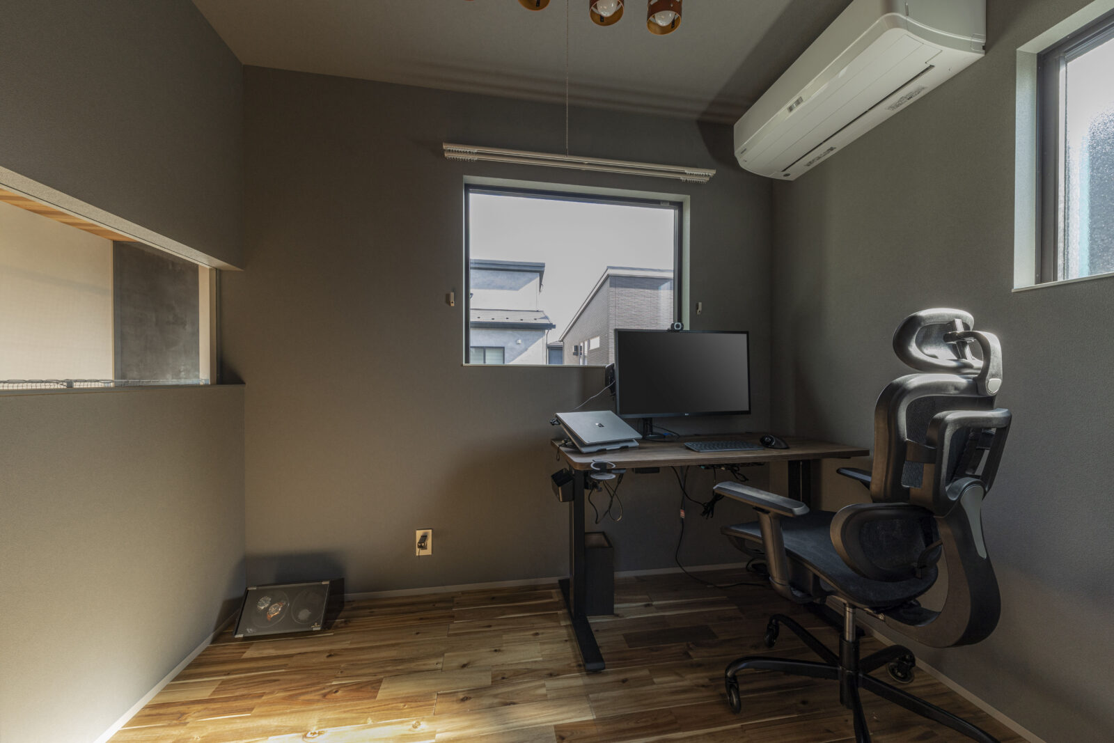 Tile 建築エリア 千葉県 建築年 2023 敷地面積 165.3m² 延床面積 110.95m² 黒い外壁にアプローチをレッドシダーで覆った、内部へ引き込まれるような印象のファサード。 ポストと宅配ボックスを埋め込んだ左官仕上の塀を背景に、割栗石と植栽が引き立つエクステリアにしました。 玄関と中庭は磁器タイル、LDKは同色調のフロアタイルで仕上げることで、視覚的な連続性を持たせた広がりのある空間に。 グレートーンで洗練された空間の中に、吹抜のレッドシダーや無垢のアカシアなど、木の温かみを感じられる素材をバランスよくレイアウトし、落ち着いた心地よいインテリアに仕上げています。 大きな窓越しから差し込む光や影、モミジの木は季節ごとに表情が移り変わり、豊かな風景を紡ぐ家族が安らげる住まいとなりました。