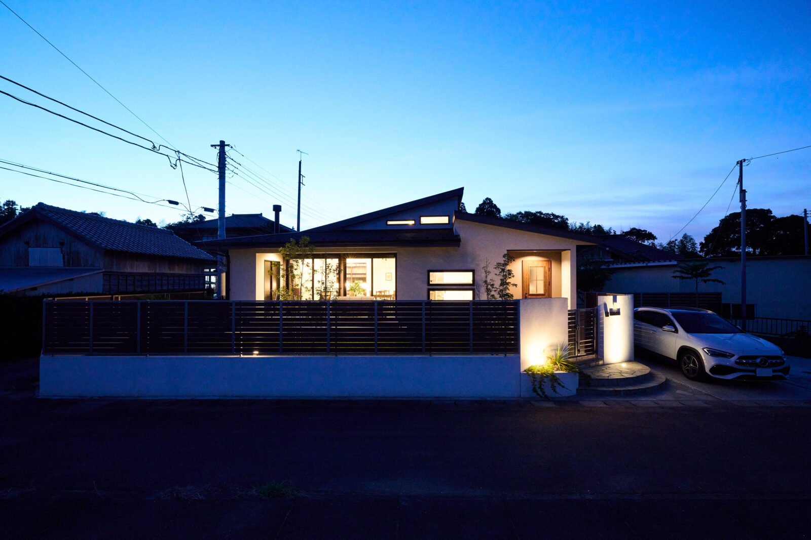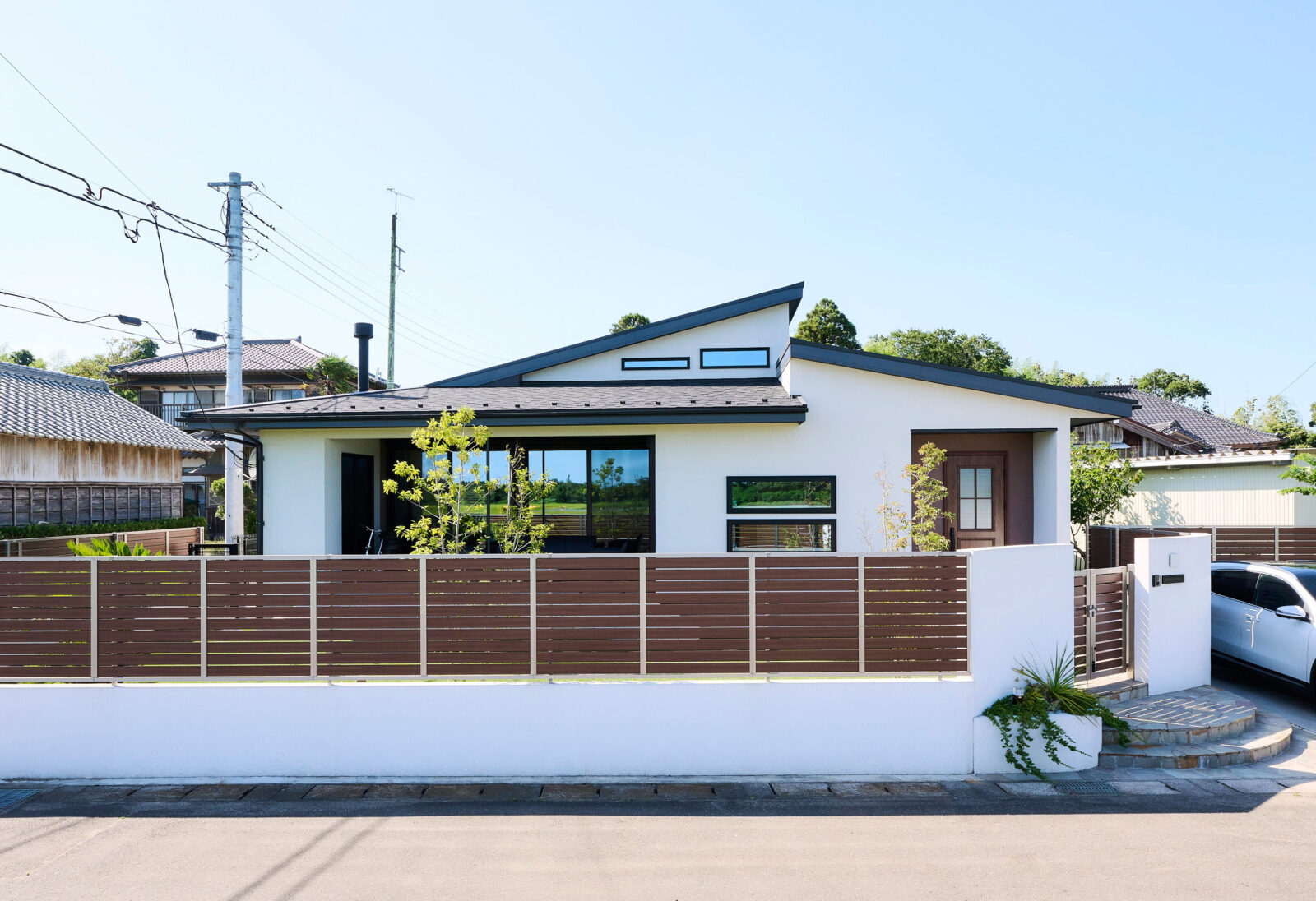 海風がそよぐ田園風景に計画された、入母屋と片流れの大屋根で仕上げた和モダンな平屋。