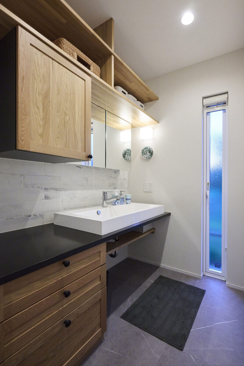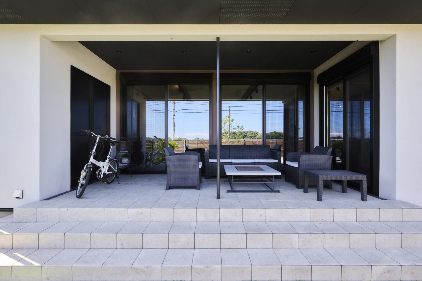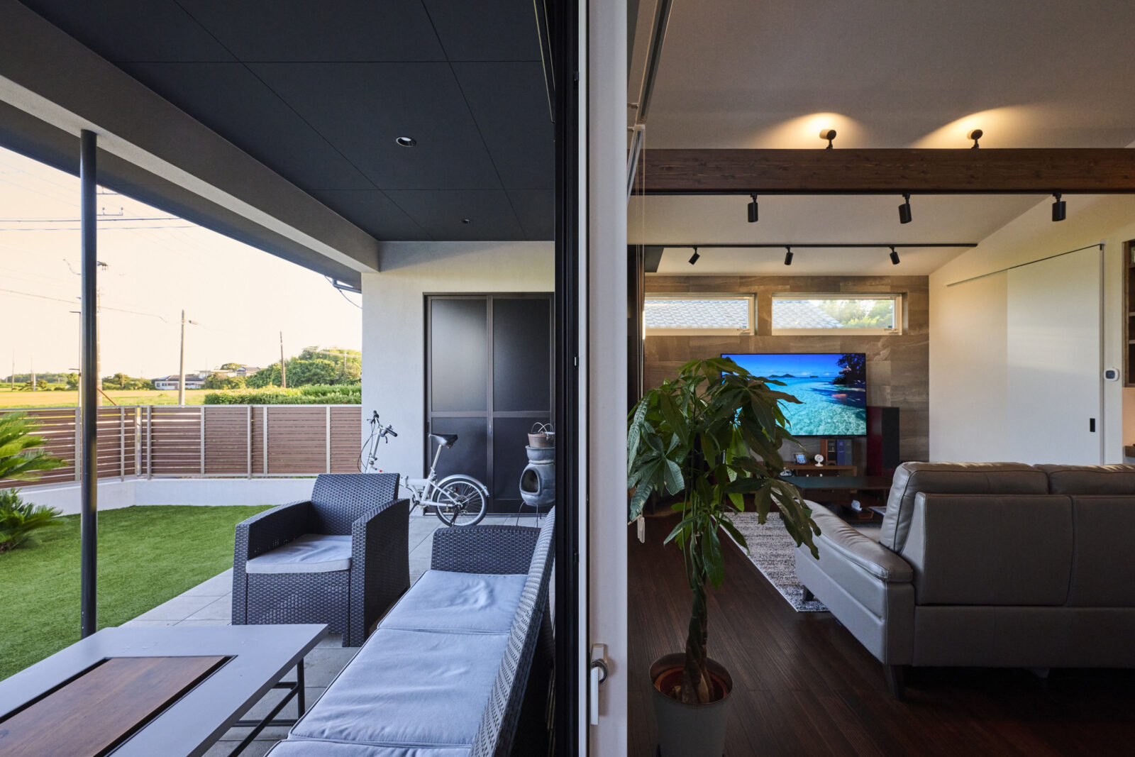 リビングからつながるタイルテラスは、プライバシー性を高めるフェンスを設けながらも、気持ちの良い視線の抜けを最大限に創出した開放感のある外部空間となっています。