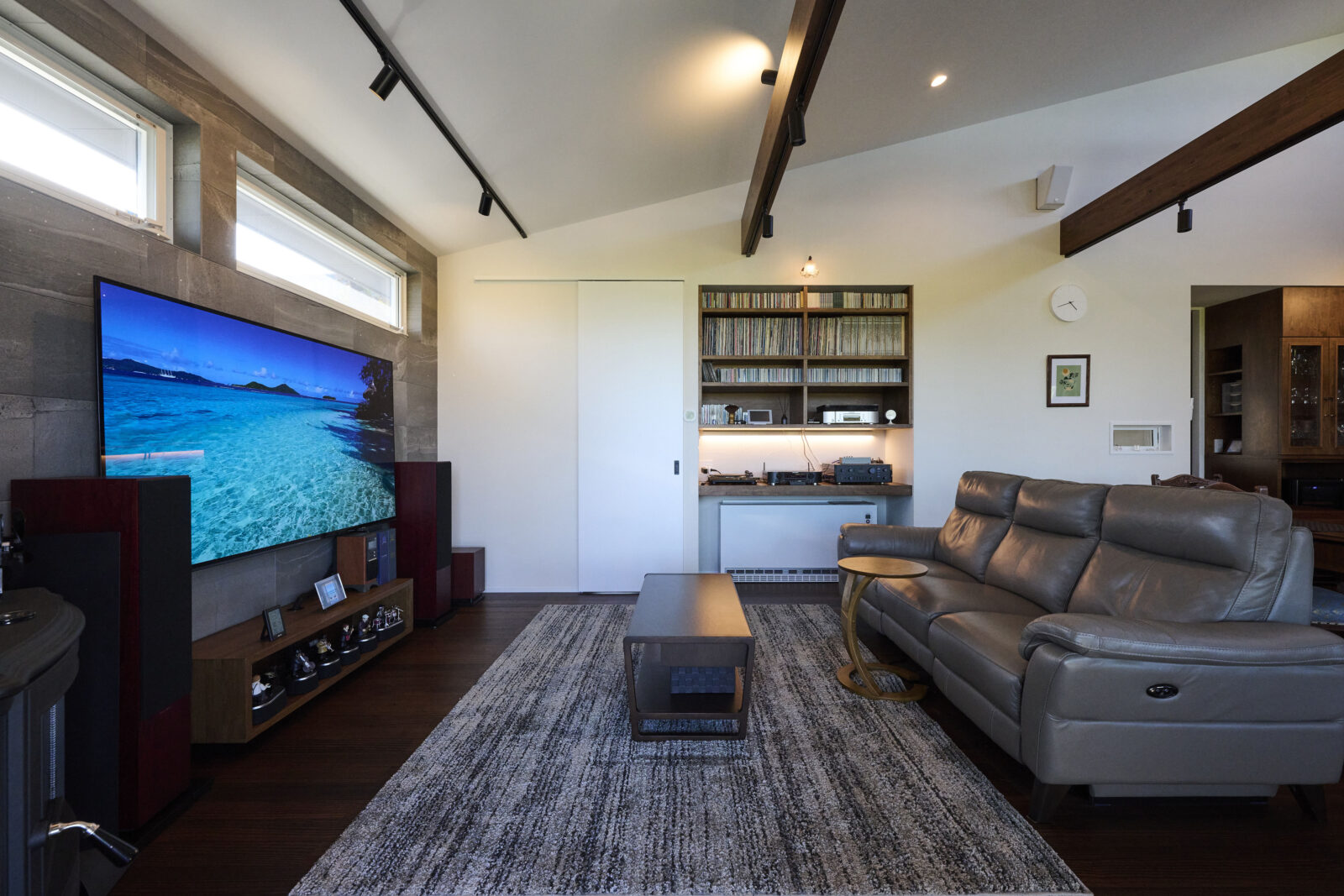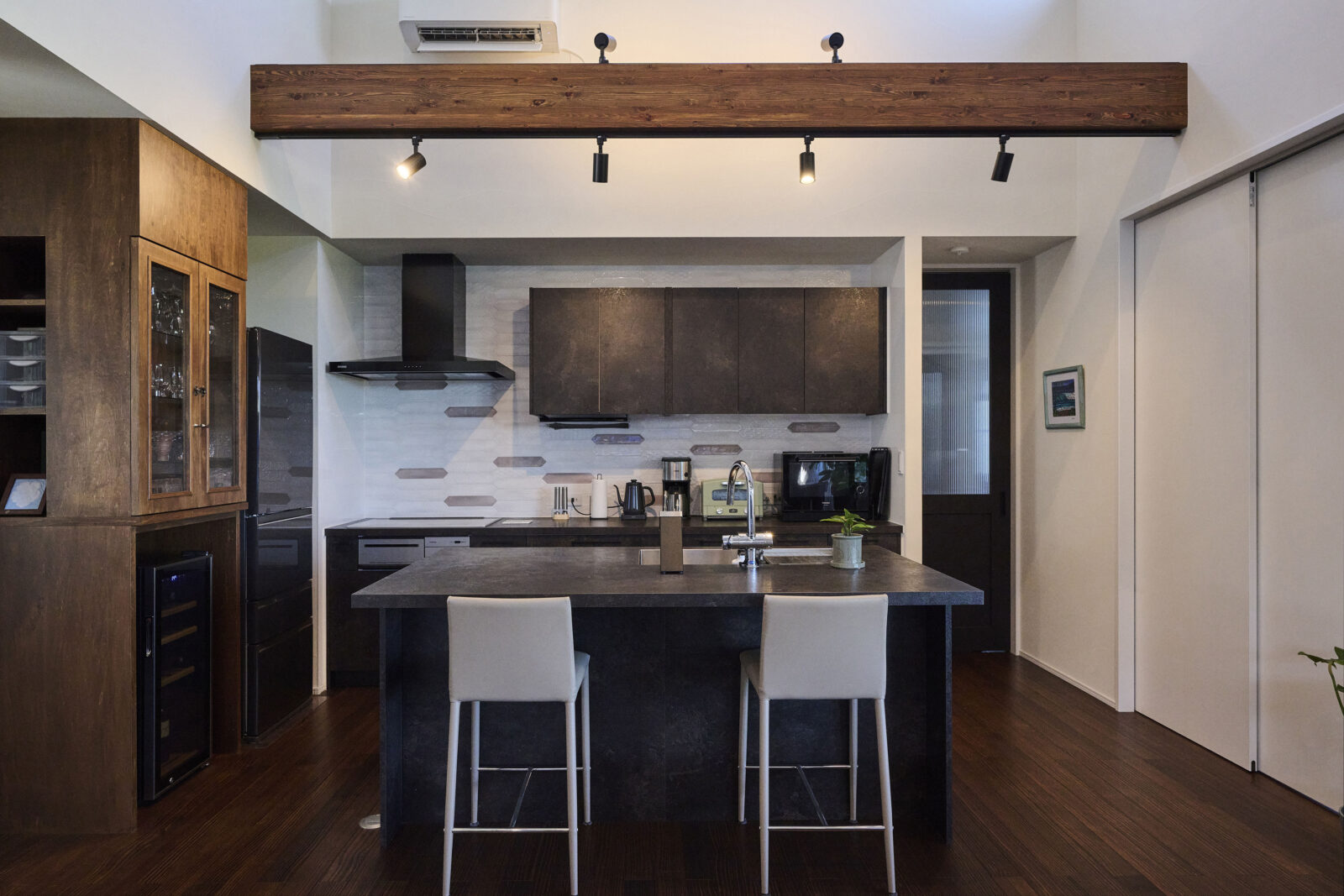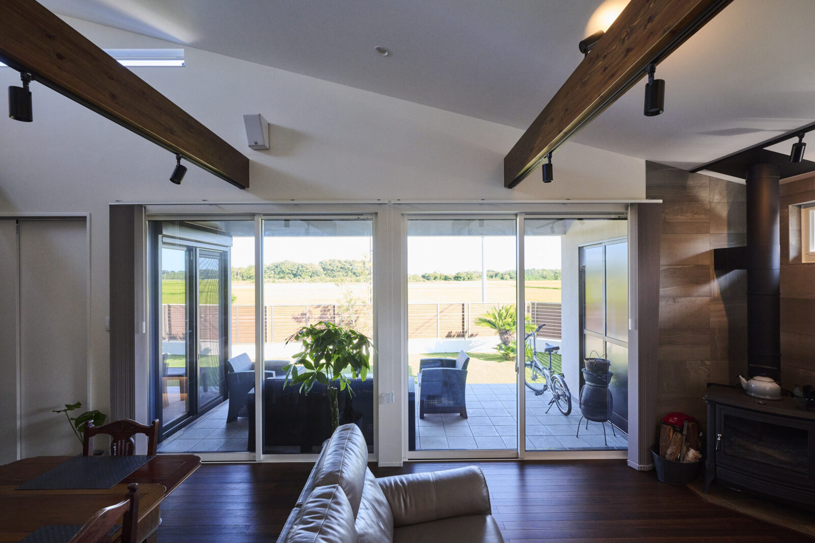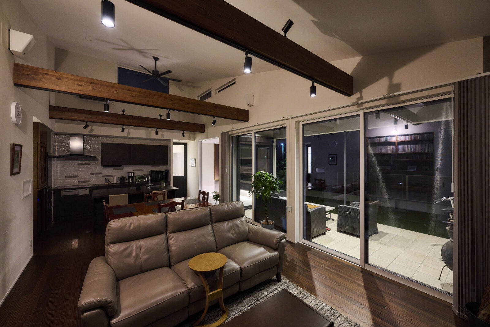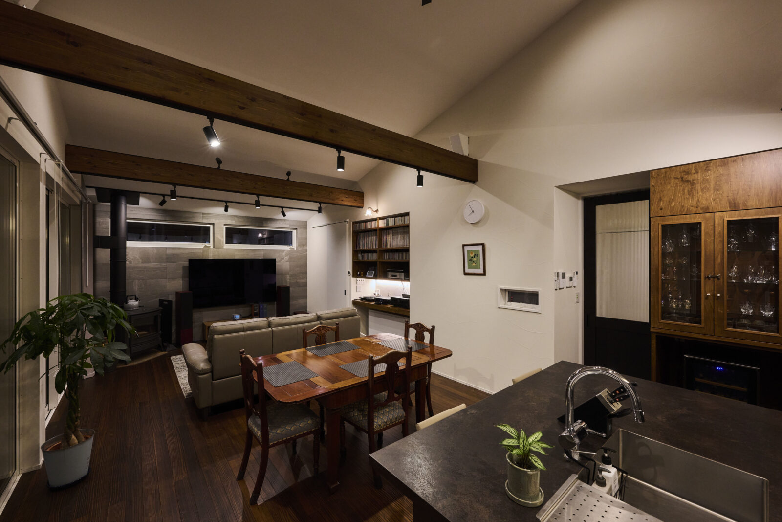 平屋の特性を生かし、ダイナミック勾配天井、重厚感のあるダークブラウンの梁を掛け、広がりと明るさを取り入れた伸びやかな空間としました。