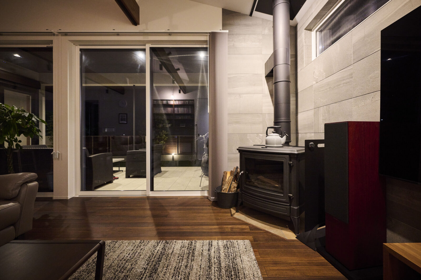 灯火 建築エリア 千葉県 建築年 2022 敷地面積 315.53m² 延床面積 105.69m² 海風がそよぐ田園風景に計画された、入母屋と片流れの大屋根で仕上げた和モダンな平屋。 平屋の特性を生かし、ダイナミック勾配天井、重厚感のあるダークブラウンの梁を掛け、広がりと明るさを取り入れた伸びやかな空間としました。 リビングからつながるタイルテラスは、プライバシー性を高めるフェンスを設けながらも、気持ちの良い視線の抜けを最大限に創出した開放感のある外部空間となっています。 レコードやCDを収納できるスペースは、住まい手に配慮しジャケットサイズにピッタリ合うよう設計しました。 夜の時間は薄明かりを楽しめる照明計画で、旅館のような落ち着いた大人の雰囲気を演出。 ソファーに腰かけ、レコードをゆっくりと聞きながら、暖炉のゆらぐ炎を見つめる。 暮らしに癒しを添えてくれる住まいとなりました。