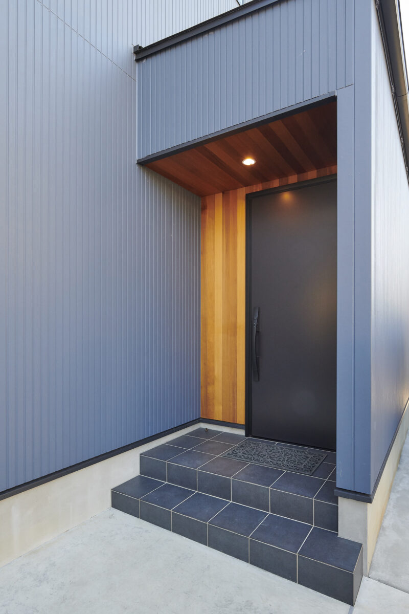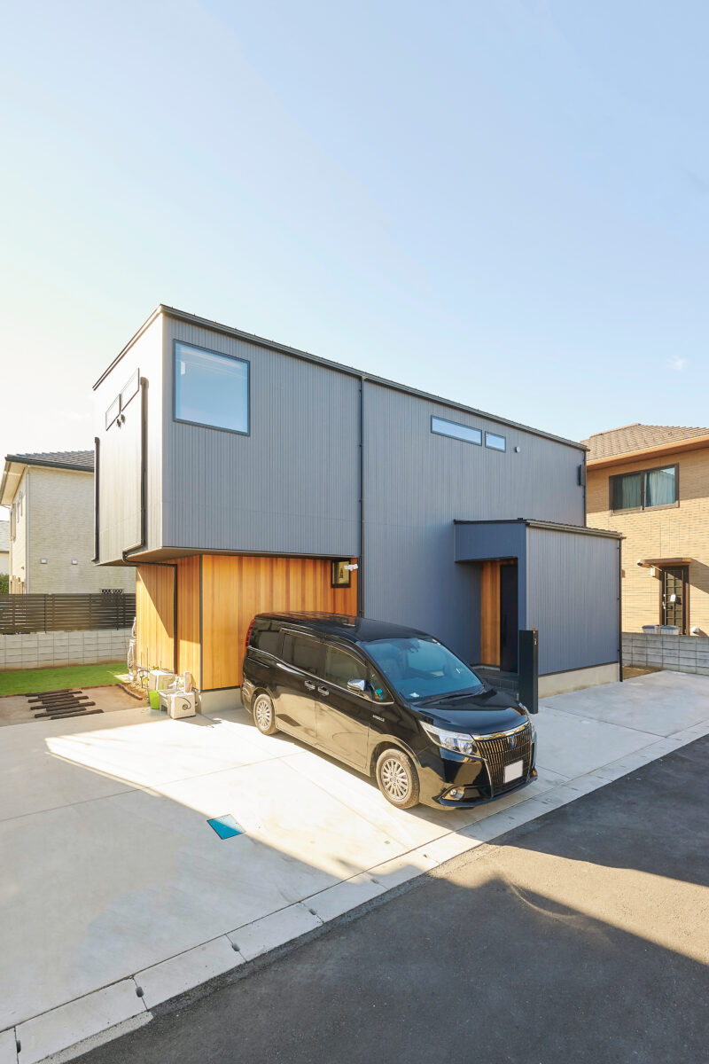 玄関ポーチと1階外壁いの一部にアクセントで板張りを施した、2階建のお住まい。