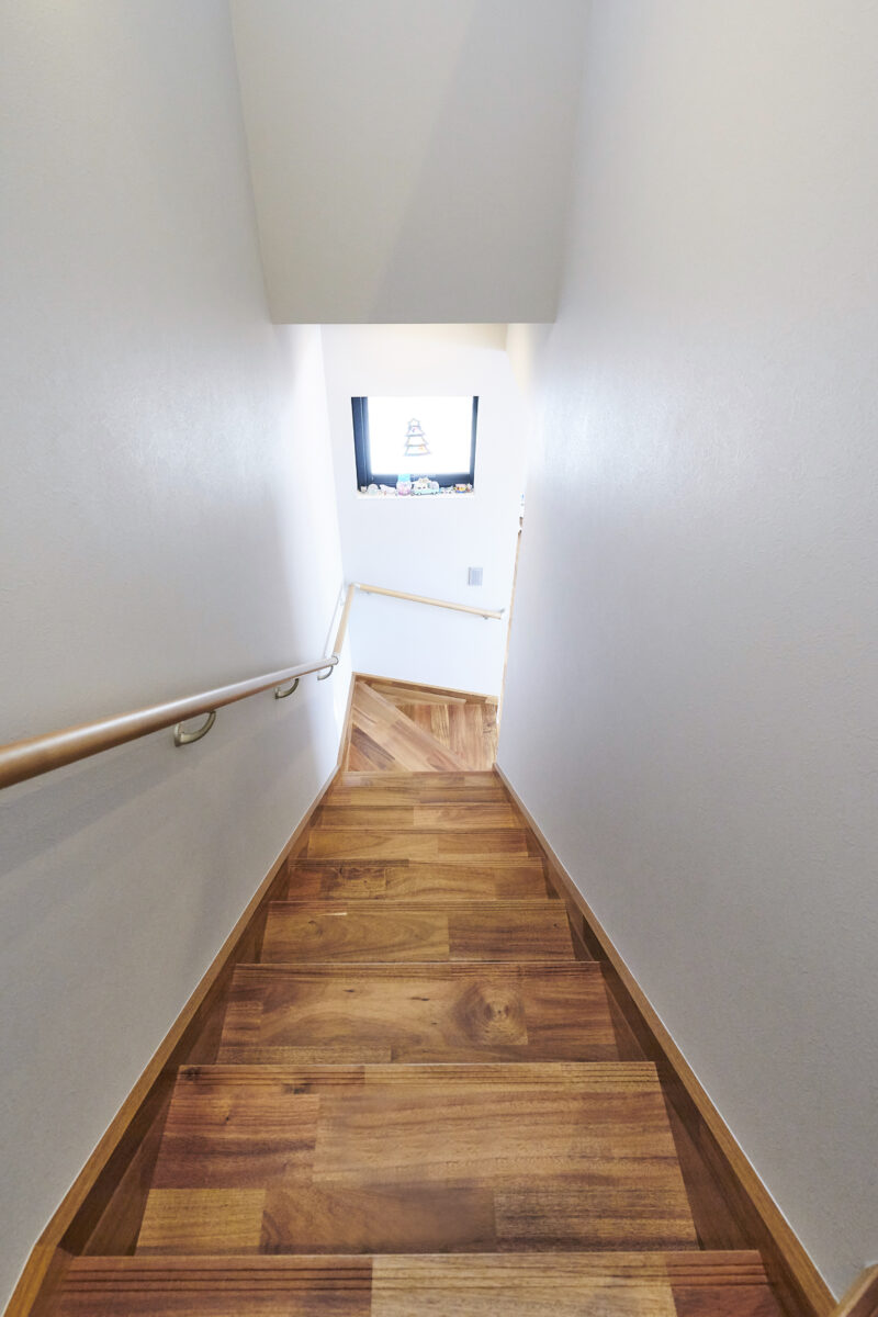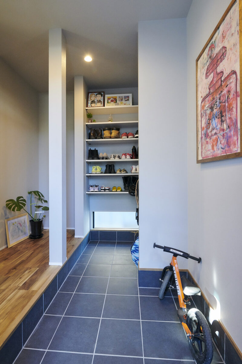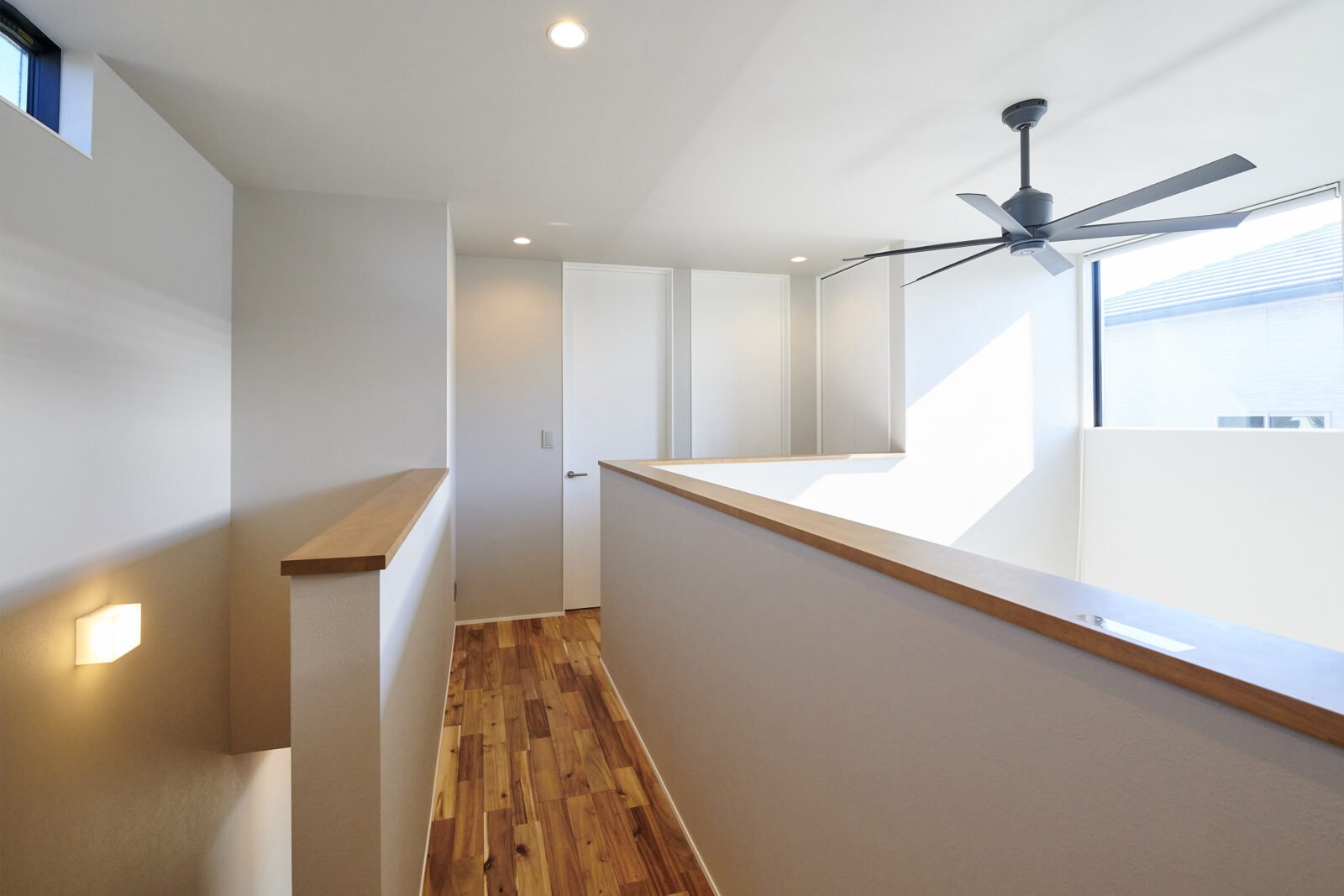 Veil 建築エリア 千葉県 建築年 2021 敷地面積 216.61m² 延床面積 109.71m² 玄関ポーチと1階外壁いの一部にアクセントで板張りを施した、2階建のお住まい。 北側道路は目線を遮るように開口を絞り、反対に南側には大きな開口を設置し、採光を確保しています。 LDKは横幅2.6mの引違サッシを2つ横並びに設置し、吹抜けには大きな窓を付けることで、 冬場でもたっぷり光が入り、家族のつながりとプライベートを両立できる空間になりました。 キッチン周辺には独立したパントリーにストレージ、ダイニング脇に壁面収納と充実の収納力を。 お施主様のこだわりの一つである大きな鏡が特徴の造作洗面台は、他の水回りとまとめて配置することで家事動線をコンパクトにしました。 グレーのクロスが柔らかい雰囲気を醸し出し、灯りがベールのように包み込むお住まいです。
