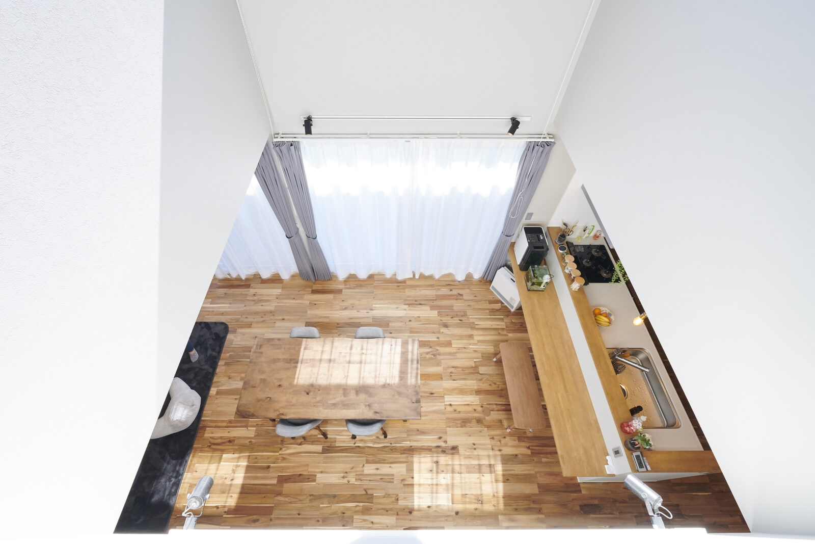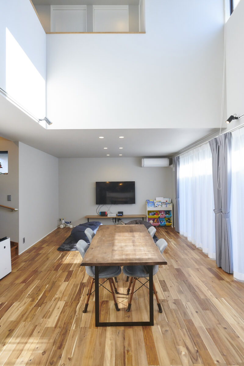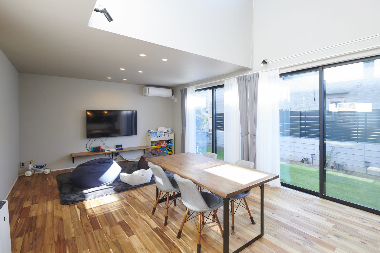 LDKは横幅2.6mの引違サッシを2つ横並びに設置し、吹抜けには大きな窓を付けることで、