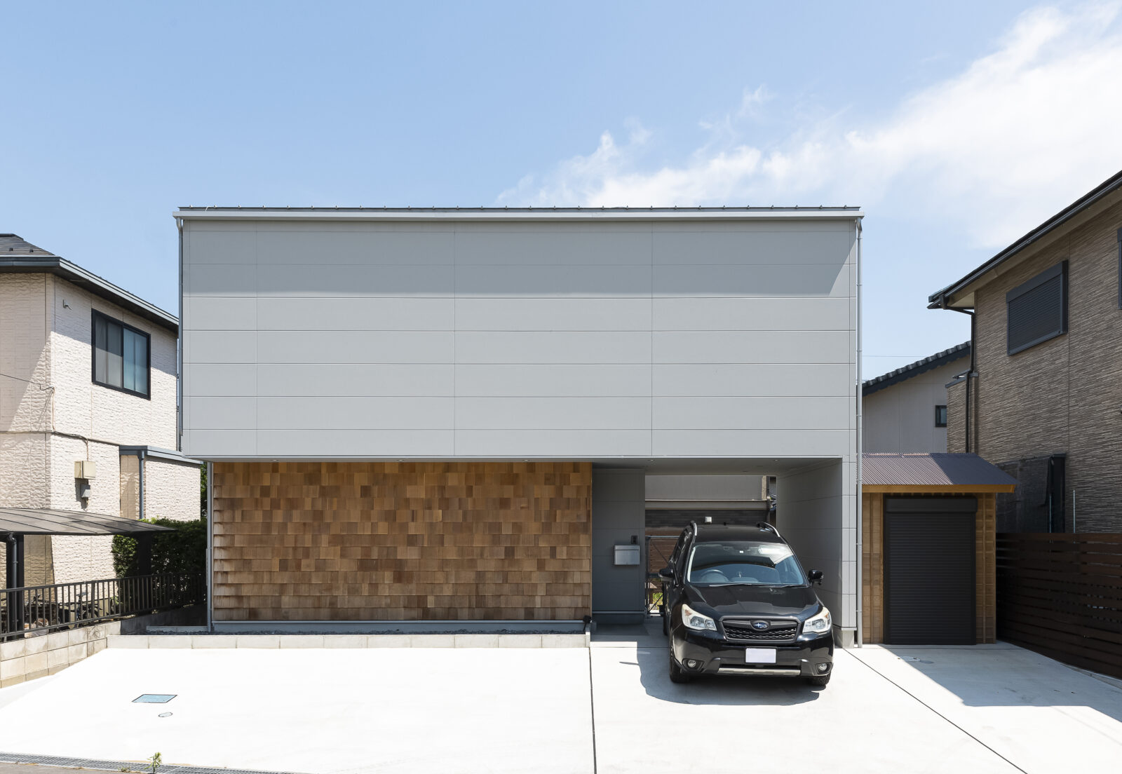 シンプルなグレーのフラットサイディングに、レッドシダーのシングルパネルがアクセントの外観。