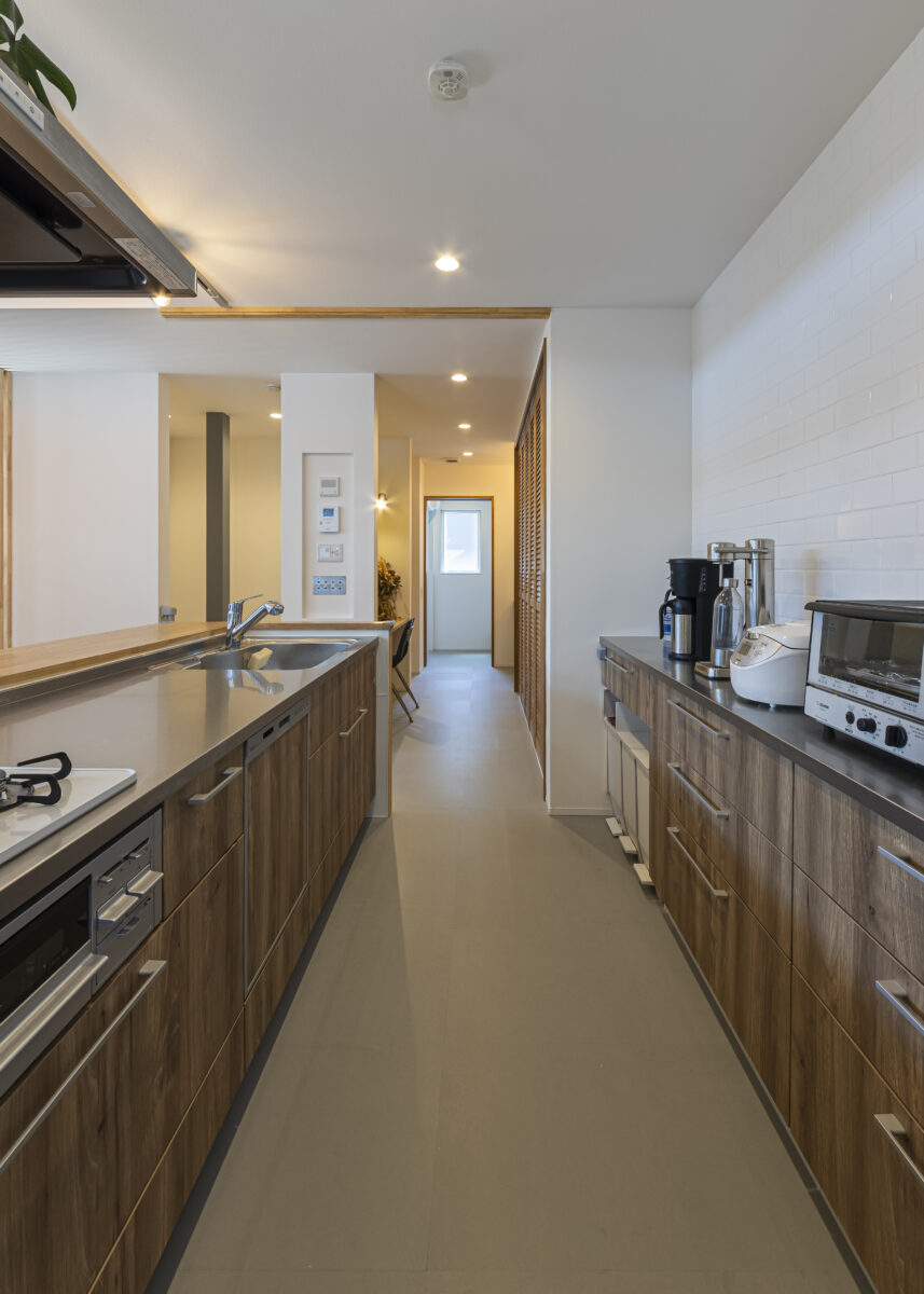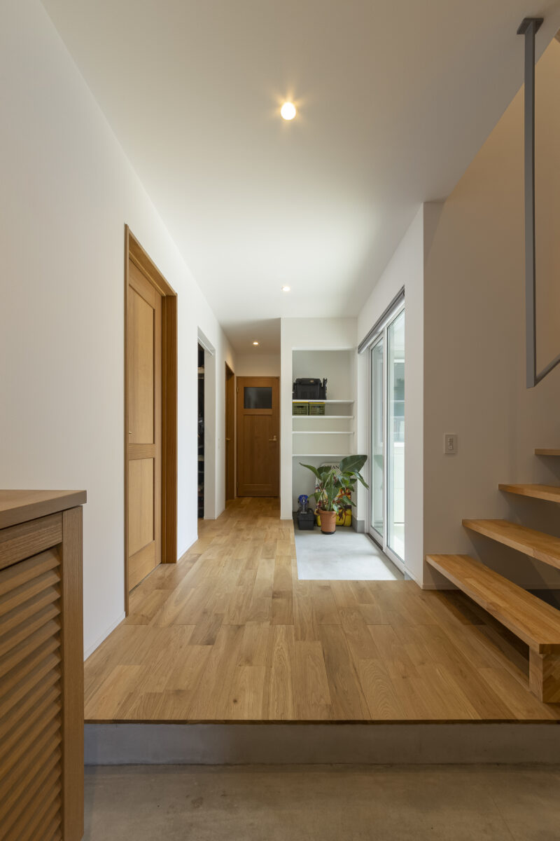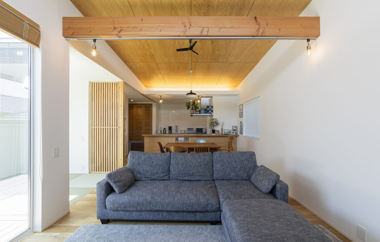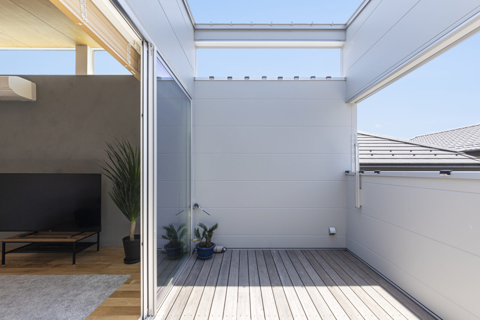 二階にリビングを設けることで、プライバシーを保ちながらも、視線が空に抜ける心地の良い広がりを持つ空間に。
