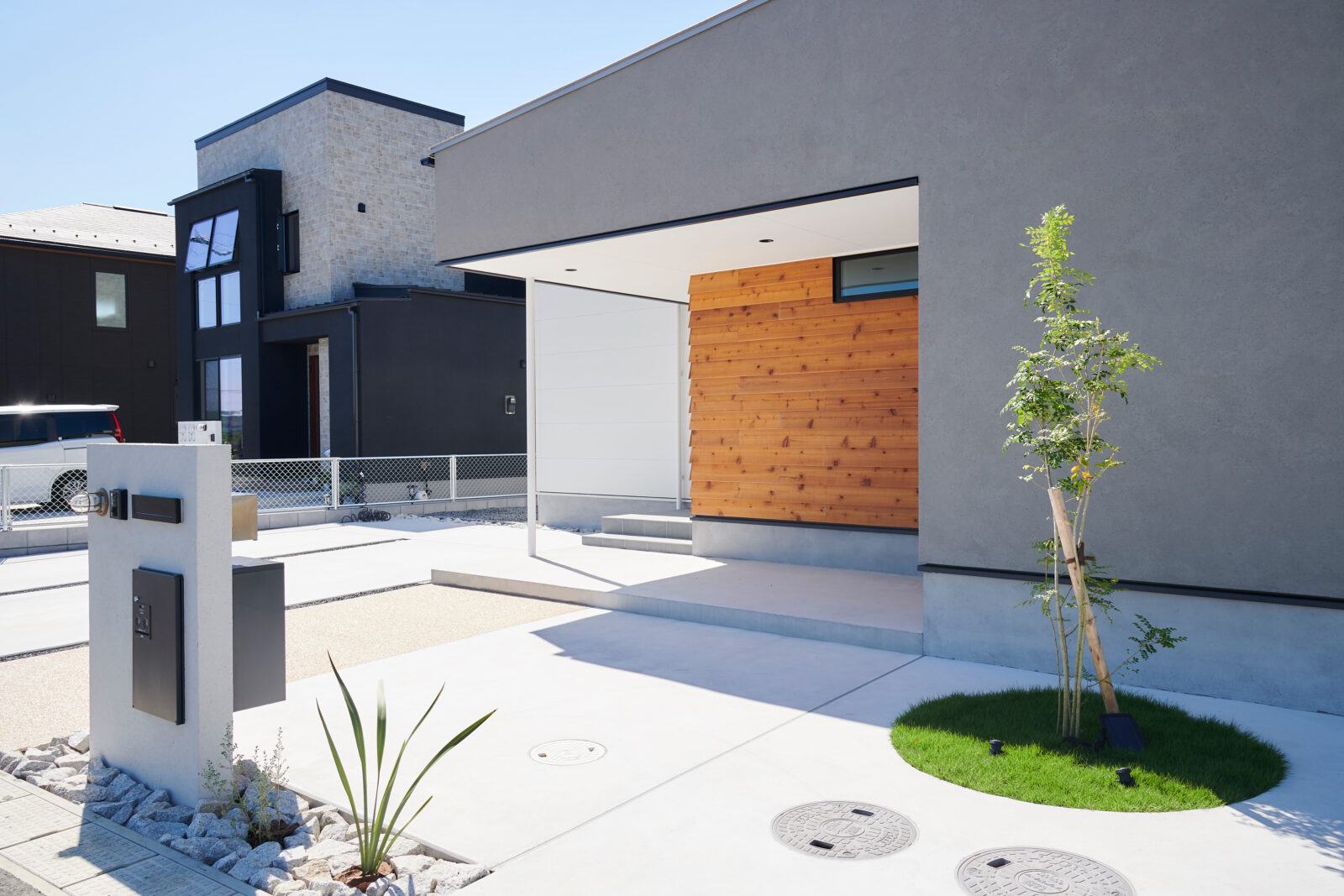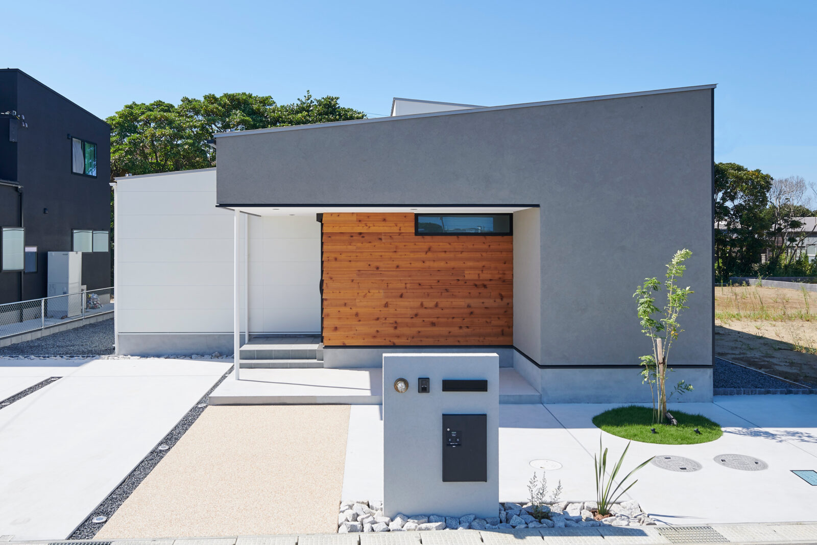 白い外壁をベースに、グレーの塗装と木製外壁がアクセントになった、片流れ屋根の平屋のお住まい。