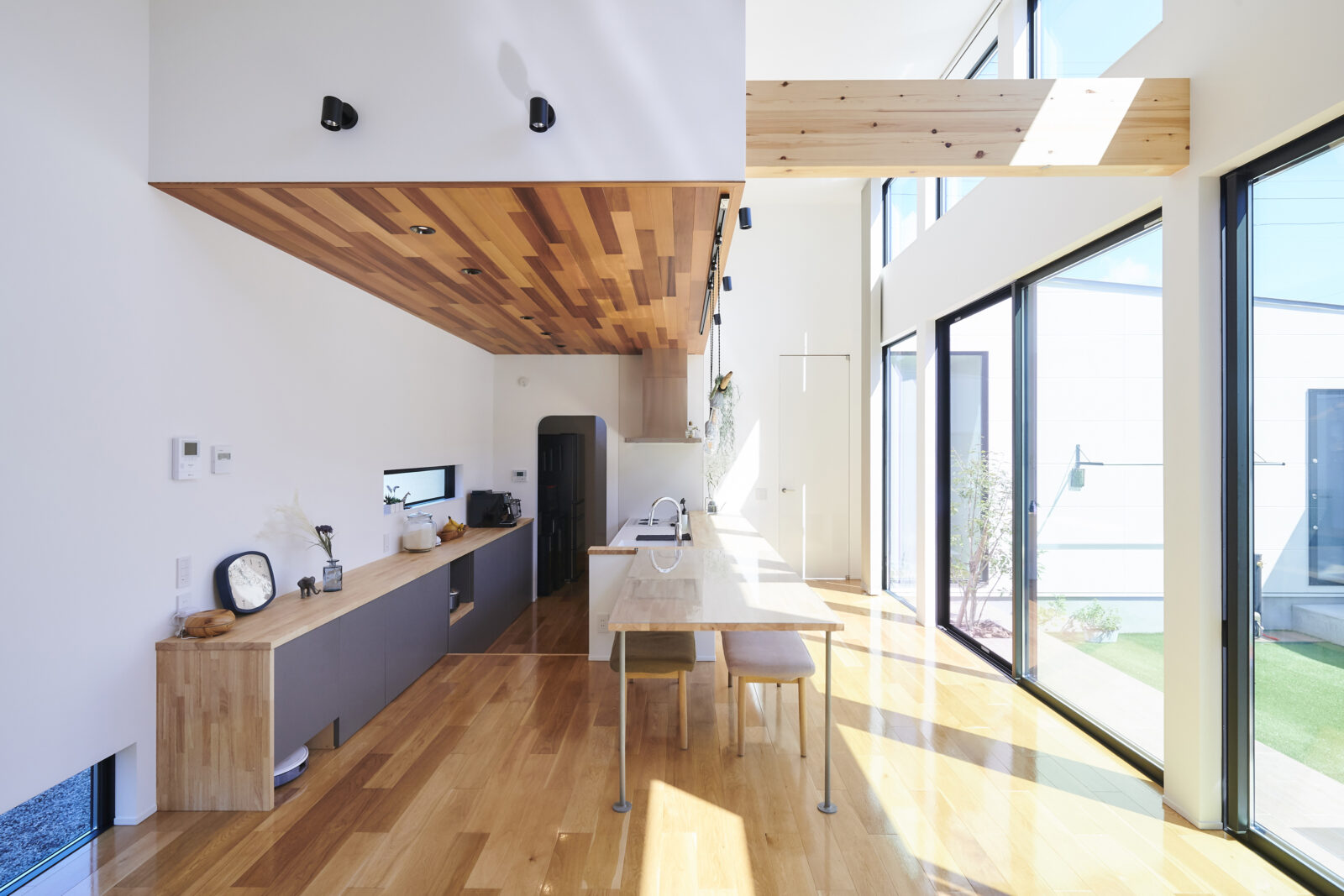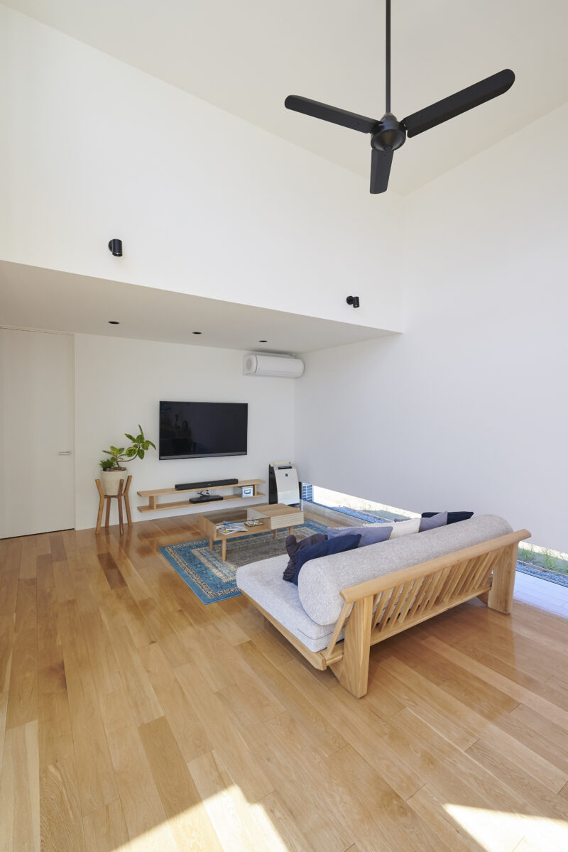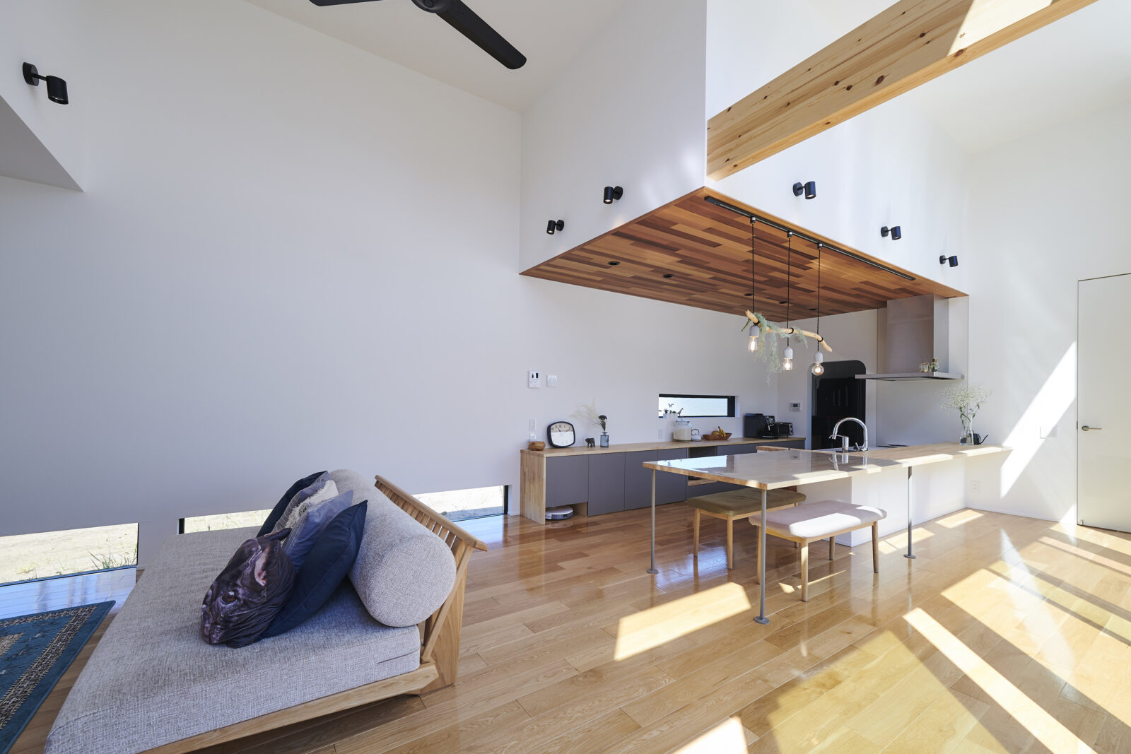開放感あふれる高天井のLDKは、上部の窓からもたっぷりと光が差し込み、明るく穏やかな空間を演出。