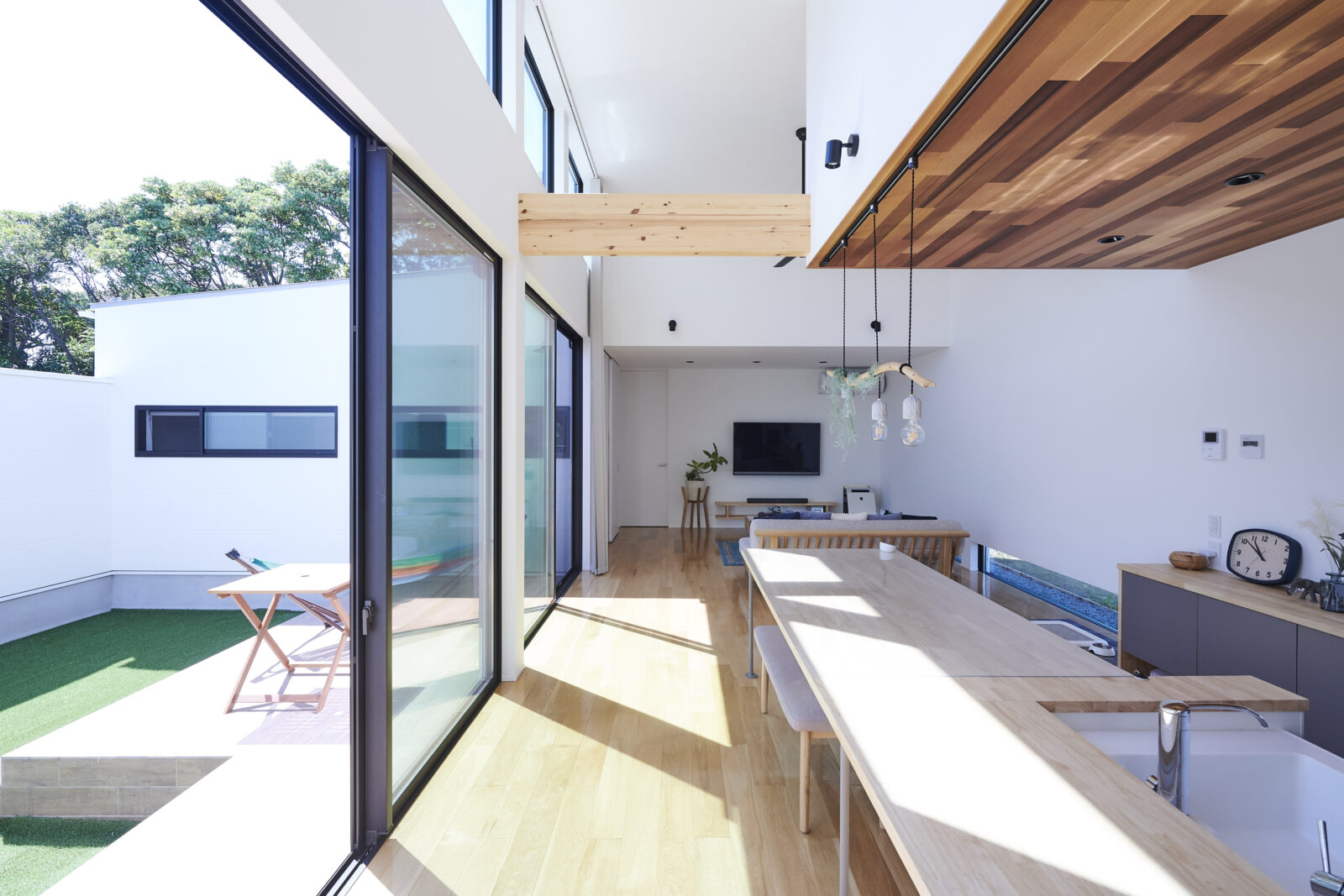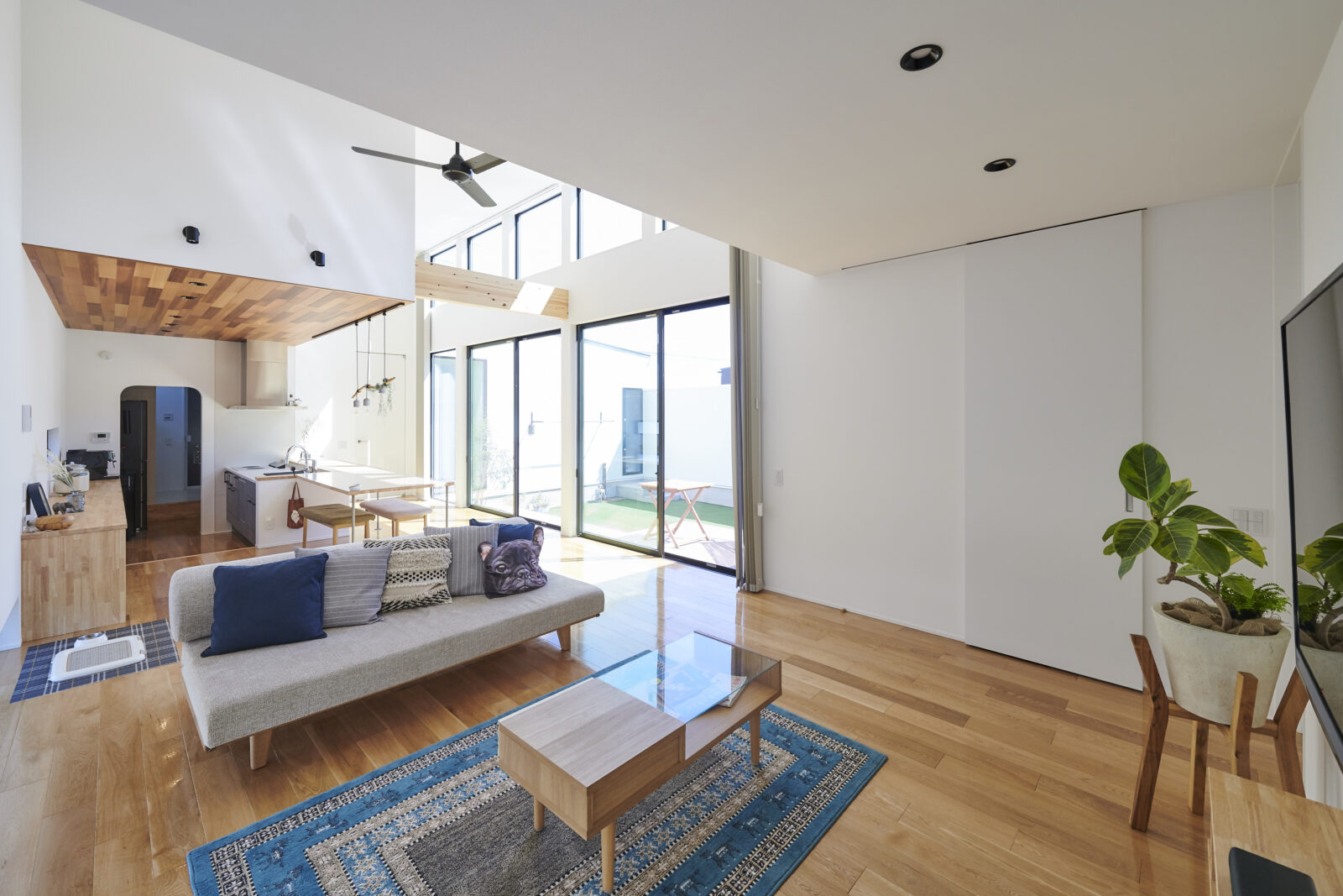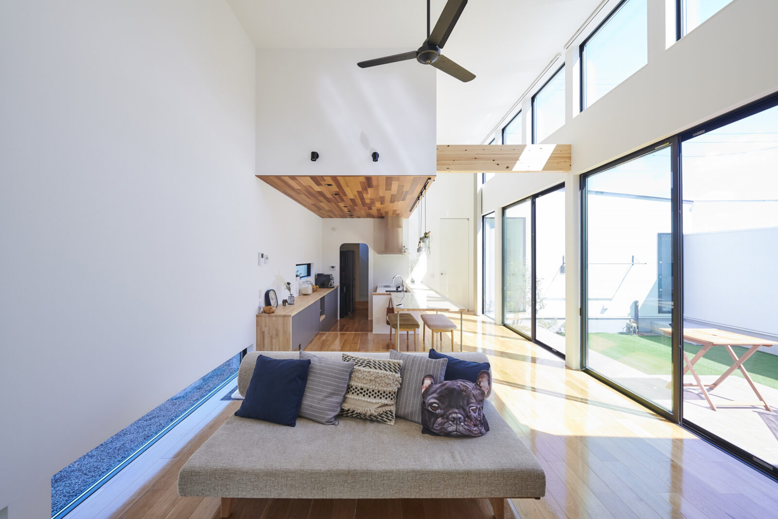 開放感あふれる高天井のLDKは、上部の窓からもたっぷりと光が差し込み、明るく穏やかな空間を演出。