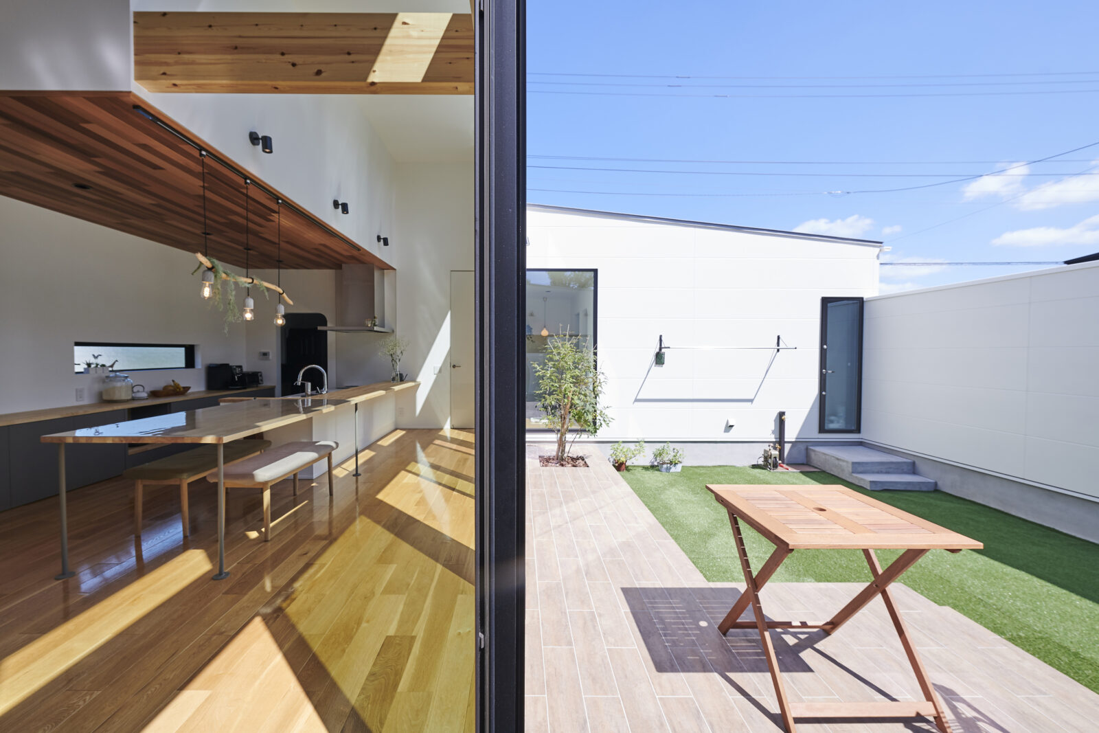 囲む平屋 建築エリア 千葉県 建築年 2021 敷地面積 345.74m² 延床面積 105.37m² 白い外壁をベースに、グレーの塗装と木製外壁がアクセントになった、片流れ屋根の平屋のお住まい。 軒を大きく張り出し、自転車などの駐車スペースとしても使えるようにしています。 玄関を入るとガラス張りになっており、目の前に中庭が広がります。 中庭は口の字型に囲まれたプライベートな大空間で、いつでもワンちゃんがのびのびと走り回ることが出来ます。 開放感あふれる高天井のLDKは、上部の窓からもたっぷりと光が差し込み、明るく穏やかな空間を演出。 天井のレッドシダーがアクセントになっているキッチンは、フロアから一段下げることで 造作テーブルとキッチンカウンターをフラットにしたことがお施主様のごだわりの一つです。 フローリングはワンちゃんが歩きやすいようにコーティングを施し、家族全員がのびのびと暮らせるお住まいになりました。