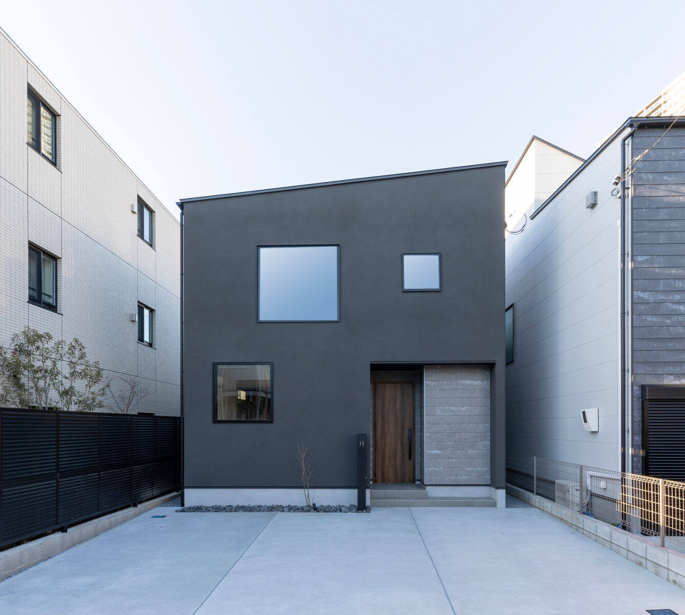 グレーの塗り壁を基調にアクセントとしてSOLIDOを取り入れた、シンプルで洗練された箱型の形状のファサード。