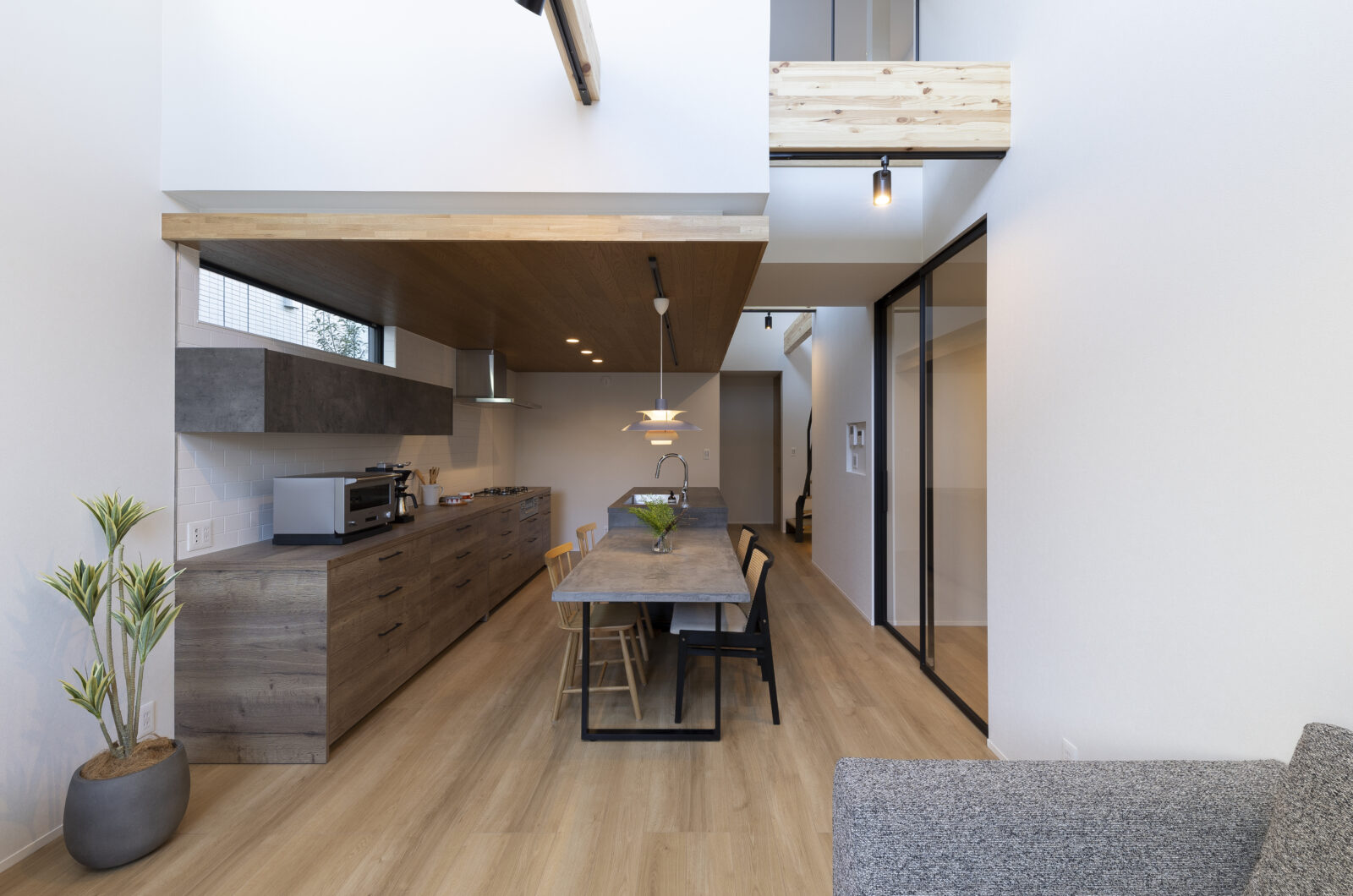 キッチンの上部にはオーク材の下がり天井が温かみを加え、リビングから廊下を越えて上部にかけての吹き抜け空間が開放感を演出しています。