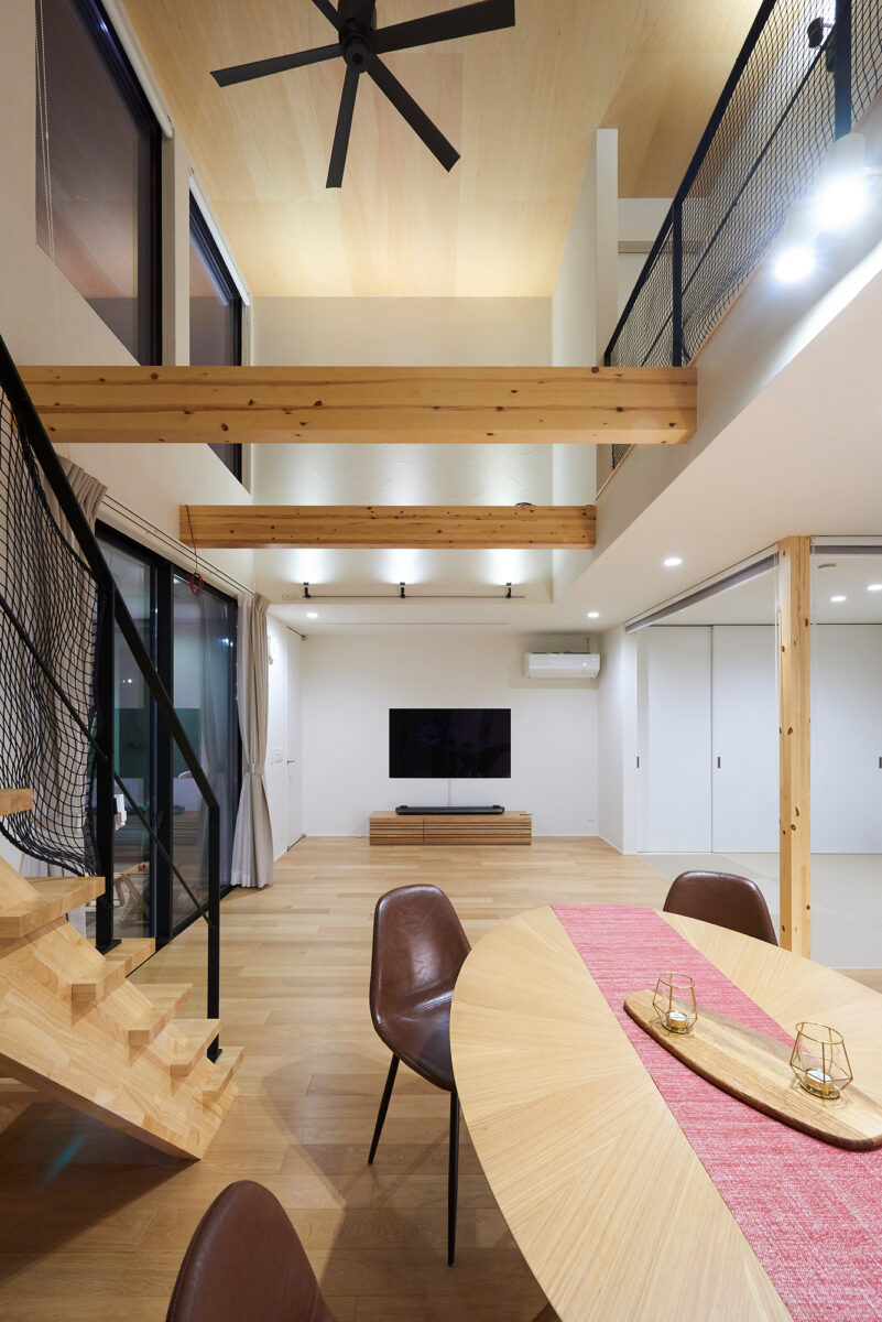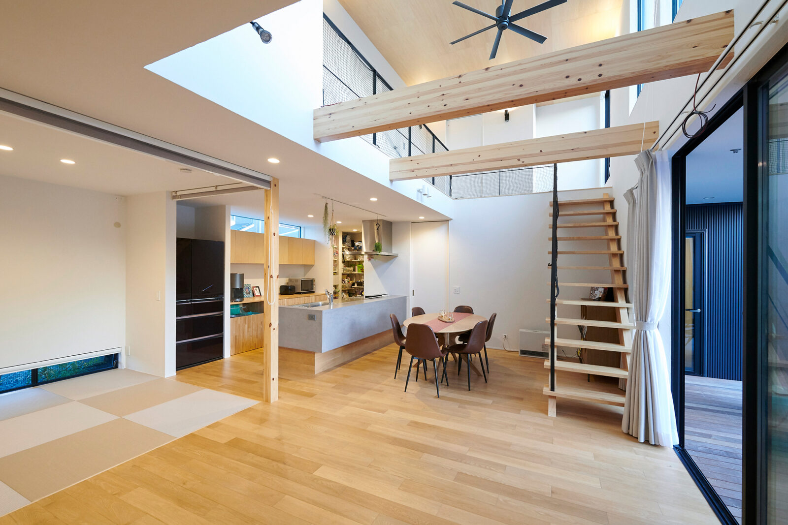 庭に開いた設計や吹抜けによる縦空間の広がりで、明るく開放的な雰囲気があります。