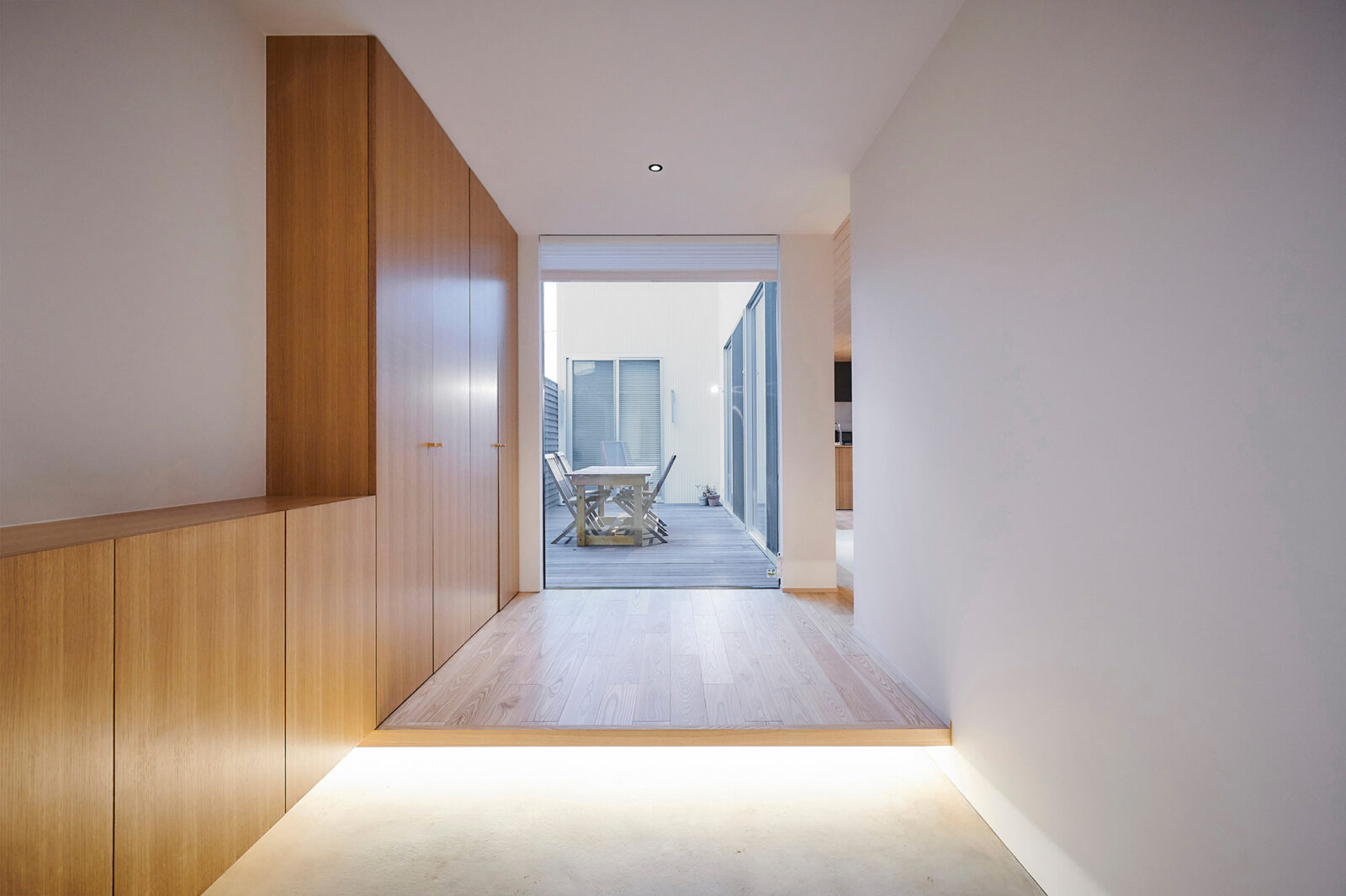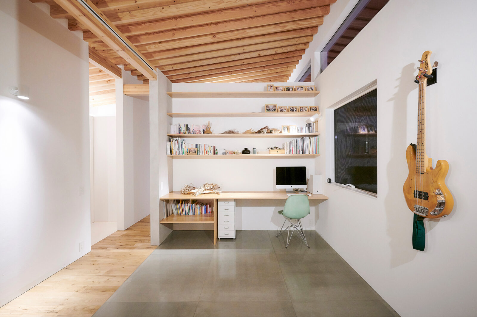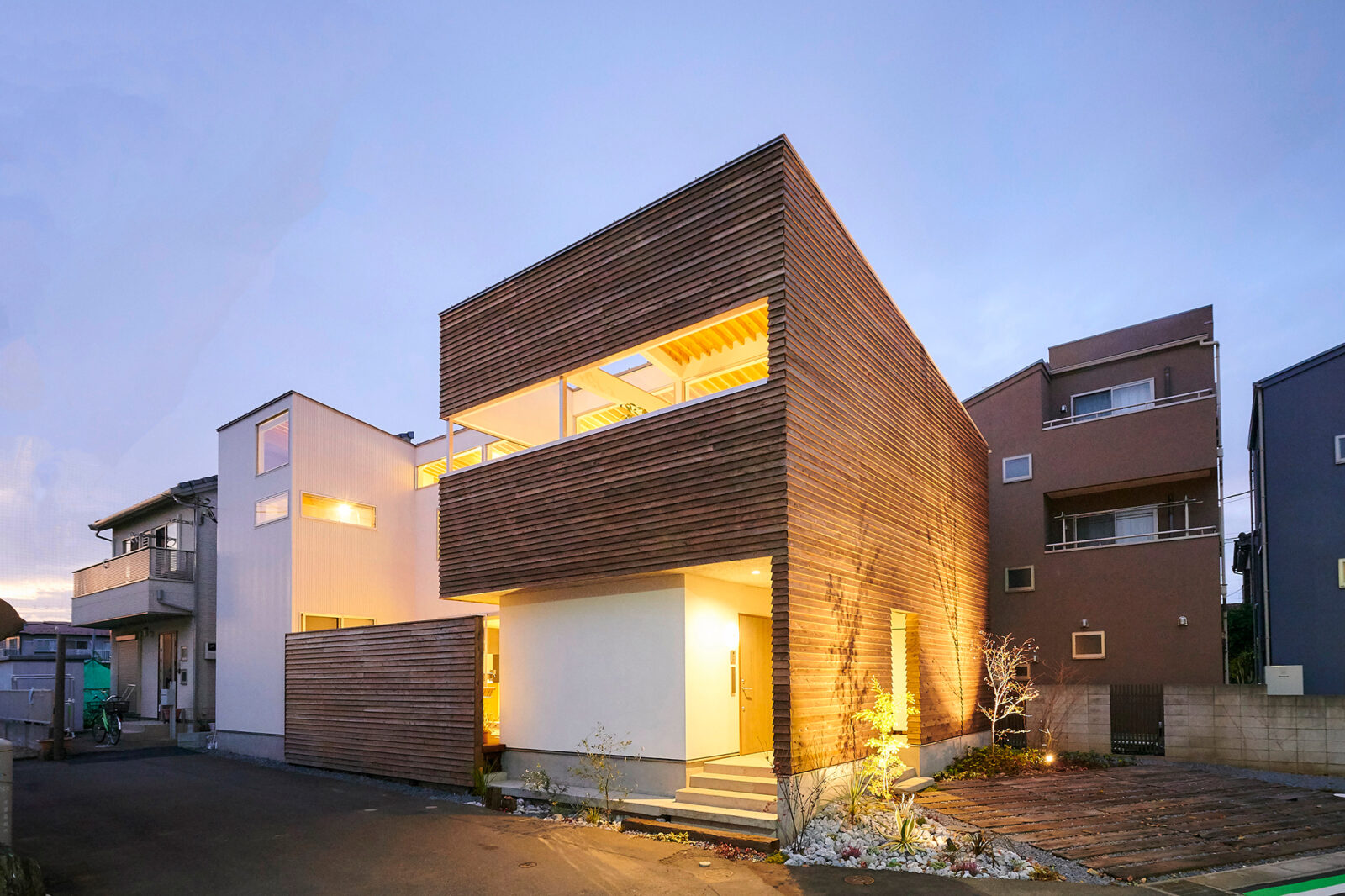くぬぎ山のいえ 建築エリア 千葉県 建築年 2020 敷地面積 208.64m² 延床面積 180.46m² 完全分離の二世帯住宅。 それぞれ上下階で世帯を独立させたシンプルな空間構成でありながら、 お互いの居住空間に中庭を設けることで適度な独立性とソトを身近に感じる住まいを目指しました。 外壁には屋久島産の杉材を基調に、質感の異なる「白」の素材を組み合わせ立体感のある外観に。 1Fは畳敷きのリビングに桧の羽目板をあしらい、和の空間を意識した日々の暮らしに寛ぎを感じる空間に。 2Fは連続する垂木を魅せ構造を可能な限りそのままの形で現すことで、素材感と開放性もたらしました。 建物に囲まれた雑多な周辺環境ながらも、光や風を豊かに感じられる住宅となりました。