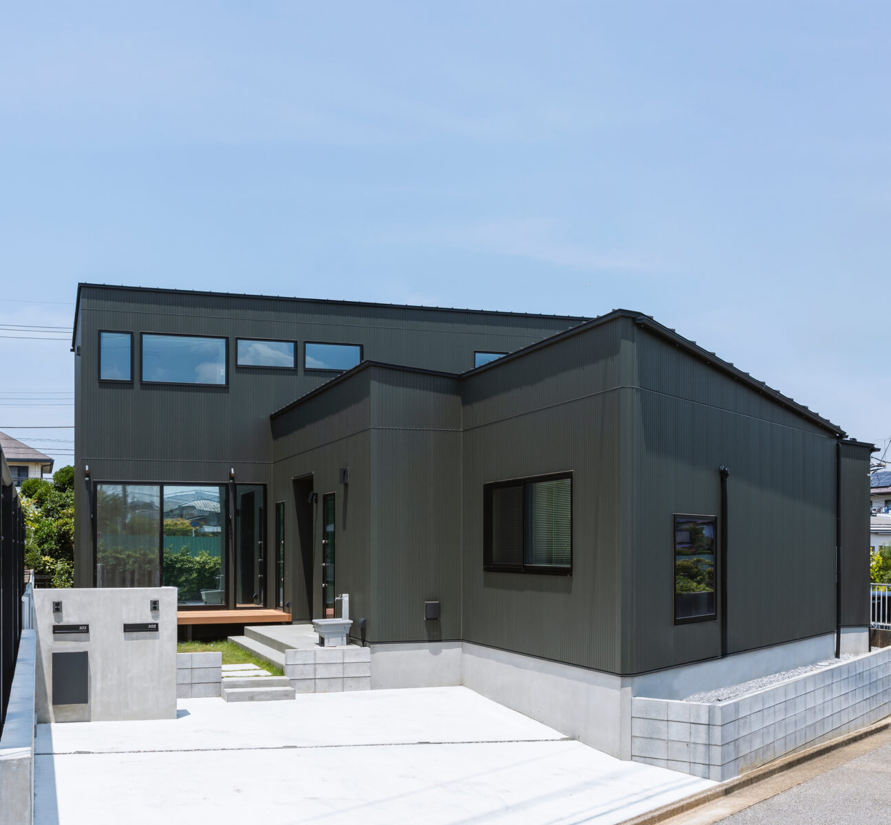 落ち着いた深緑が印象的な外観に、ブラックの窓枠やグレーの門袖をアクセントとし、街並みに馴染みながらも端正な佇まいが個性を放ちます。