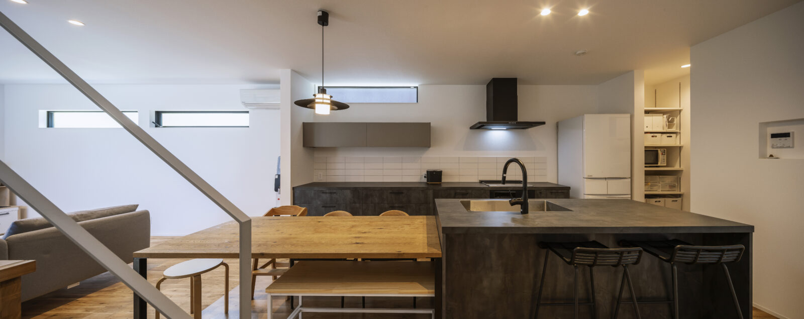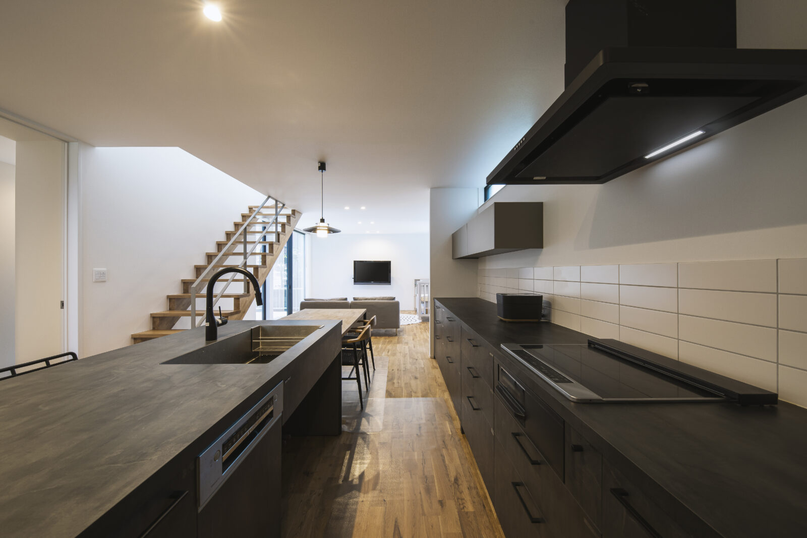 グラフテクト製のブラックトーンのアイランドキッチンは、凛とした存在感がありながらも木の床材と美しく調和し、空間に程よいやわらかさを添えます。