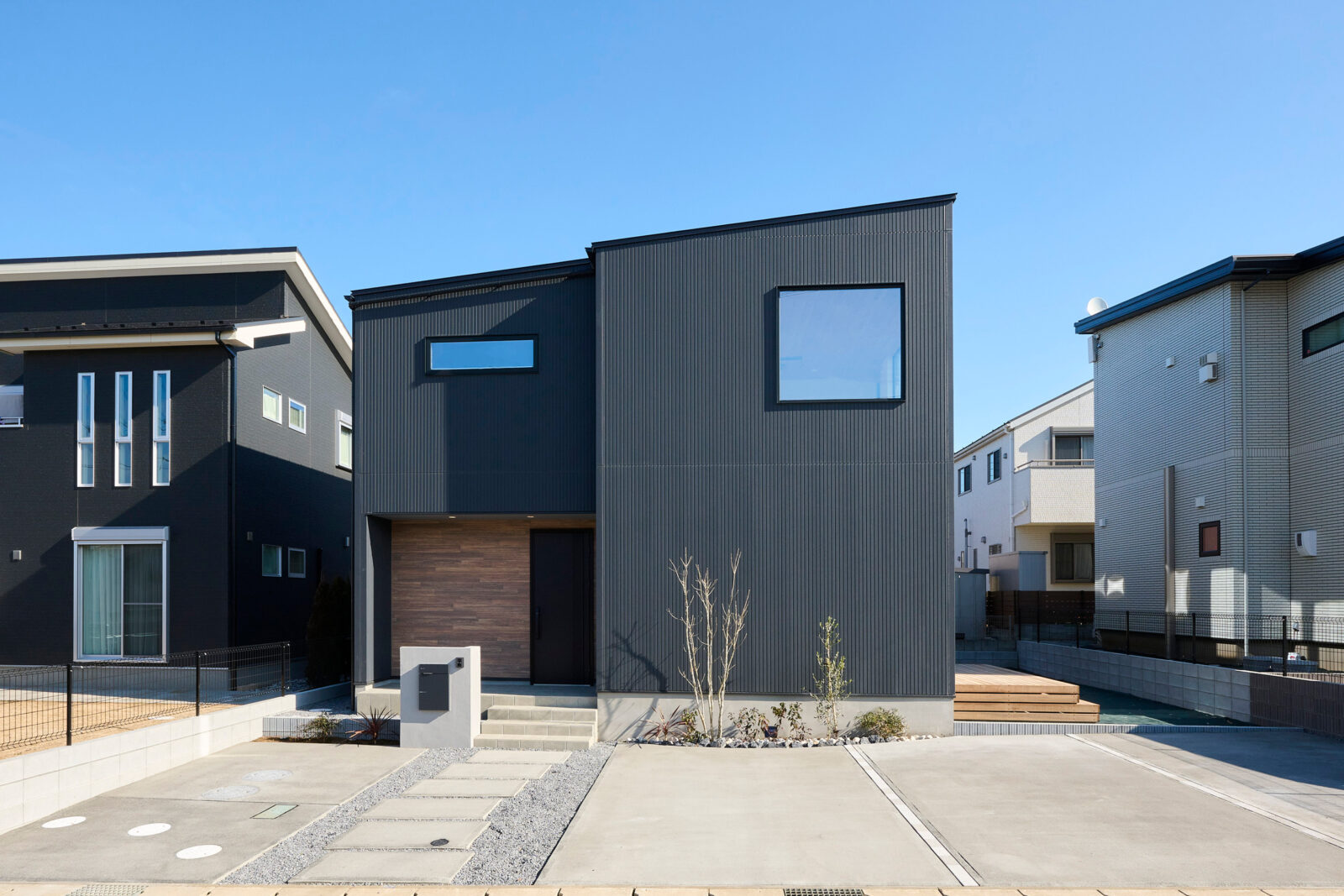 yuuhi 建築エリア 千葉県 建築年 2022 敷地面積 207m² 延床面積 107.02m² 大きな窓が特徴的なシンプルで黒い外観。 黒いファサードとは対照的に、室内は白とグレーを基調としたナチュラルな色調に統一。 リビングに設けた吹抜から、気持ちの良い自然光が差し込みます。 吹抜と隣接した2階のワークスペースからは、窓に視線を合わせると遠くの景色を一望することができ、 昼には青空、夕方には綺麗な夕焼けが見渡せる、お施主様のお気に入りのポイントとなりました。 吹抜の窓まで設けられたキャットタワーからも、猫ちゃんと一緒に景色を望めます。 また、日々の生活動線、家事動線も意識し、Sanitary→FamilyCloset→Laundry→LDKへと回遊できるように設計。 動線をコンパクトに集約させ、家族が自然とリビングに集まる豊かな暮らしをデザインしました。 住まい手の想い・センス・優しさがたくさんつまったお住まいになりました。