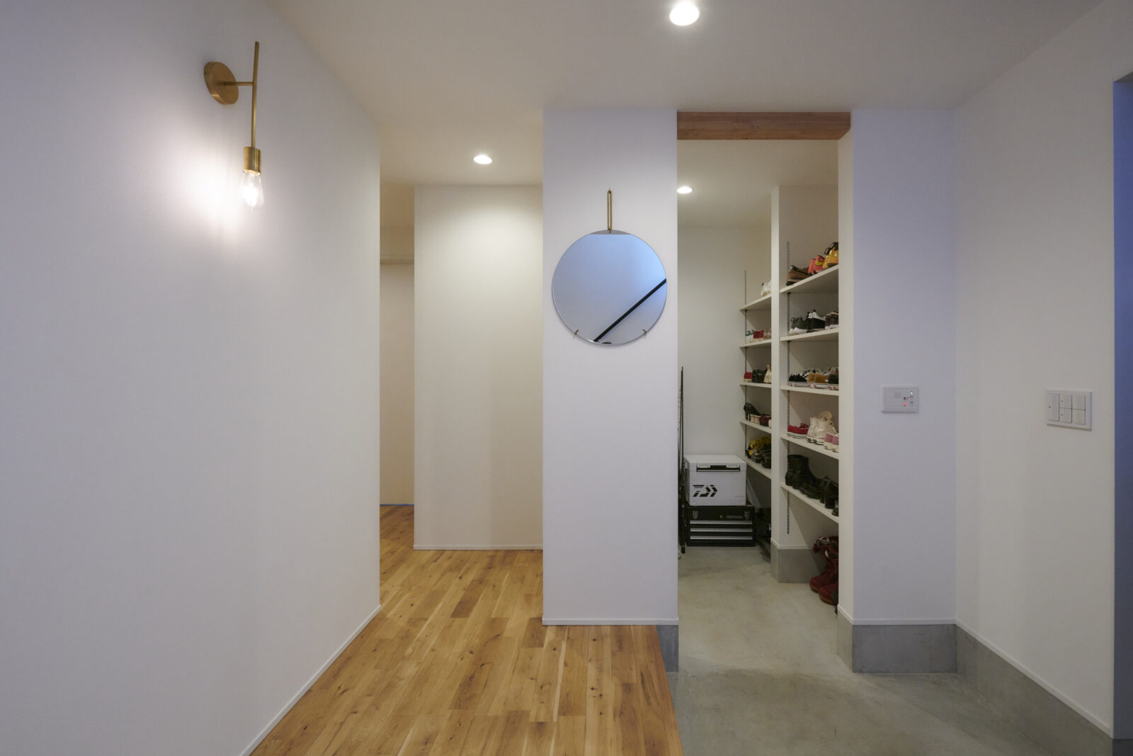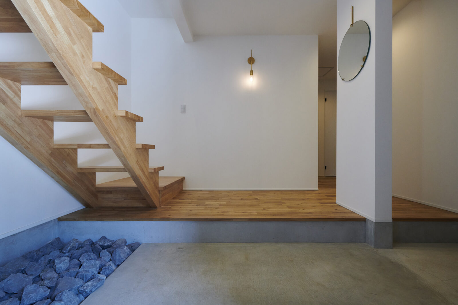 広々とした土間に階段を設け、自然と2階に誘われるよう計画。