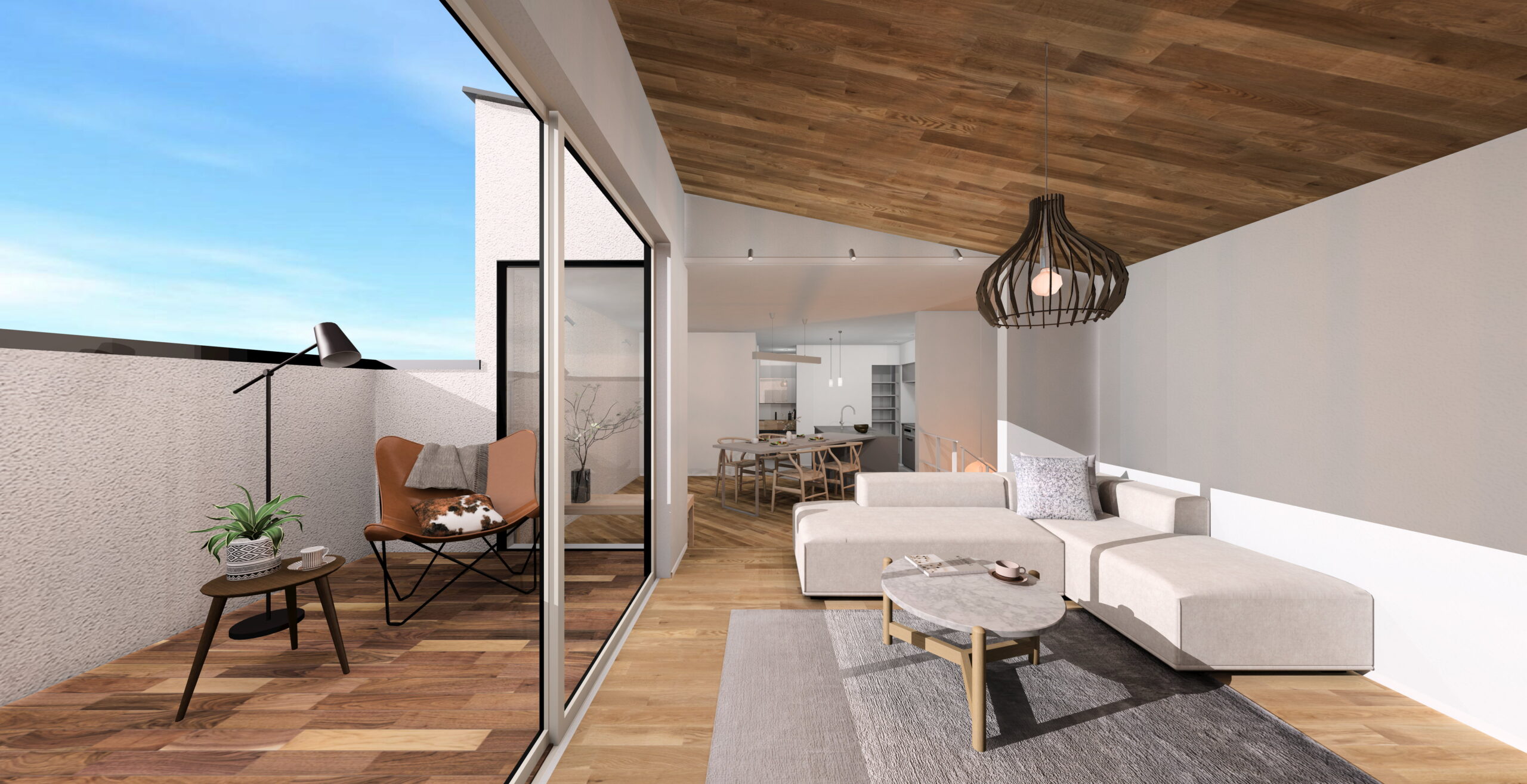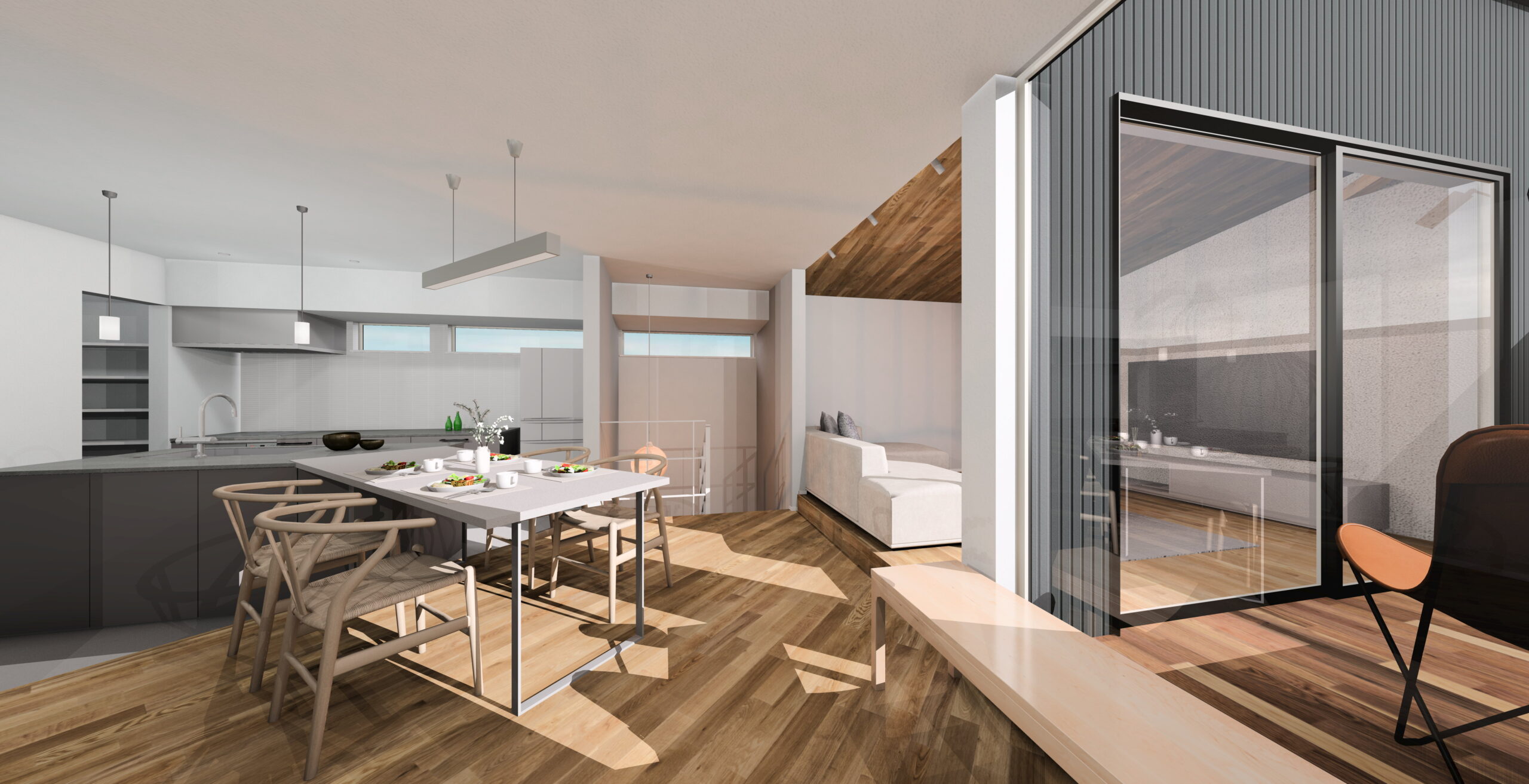 その地形が生み出す「段差」そのものを、暮らしの構成へと置き換えた設計としました。