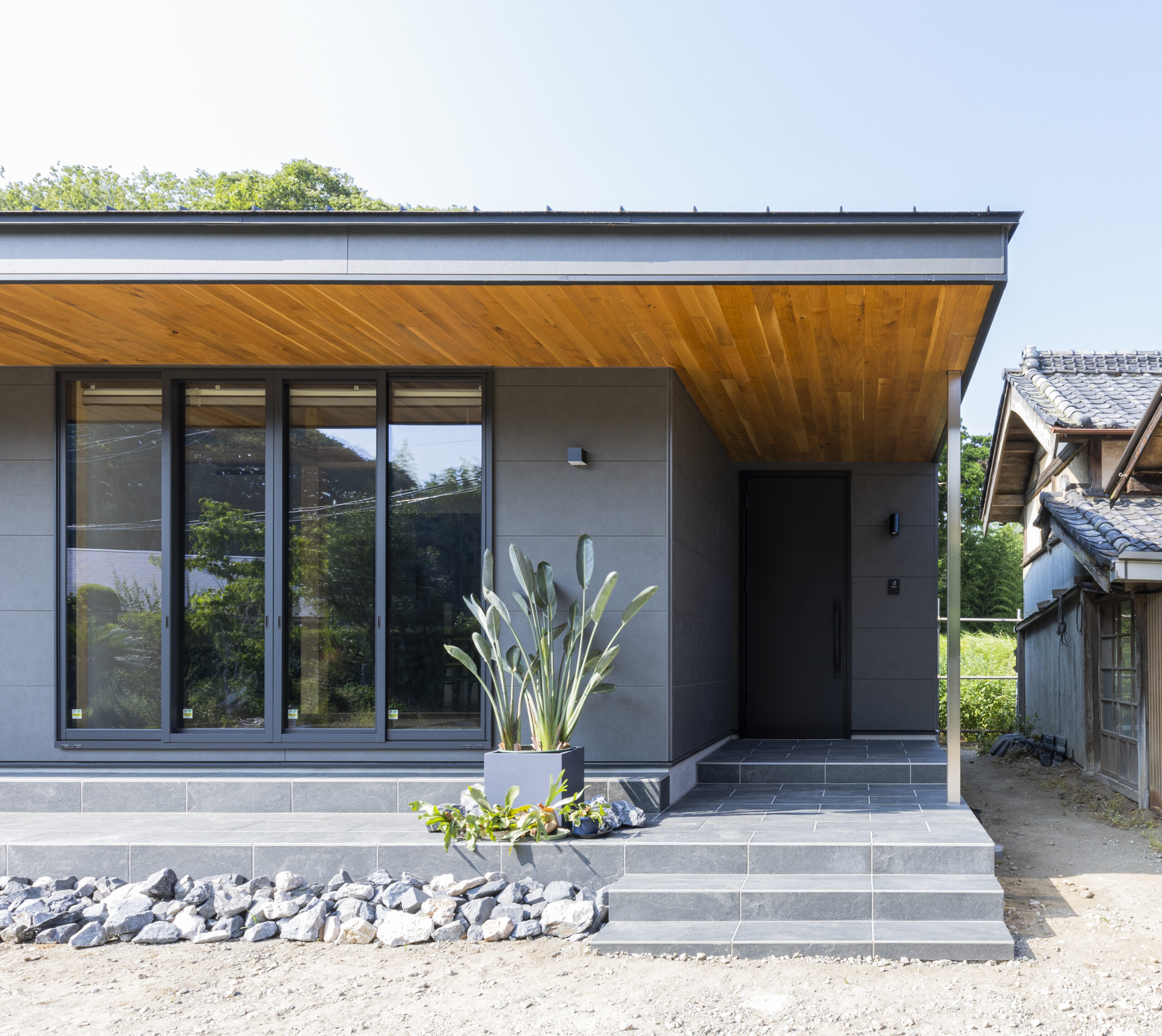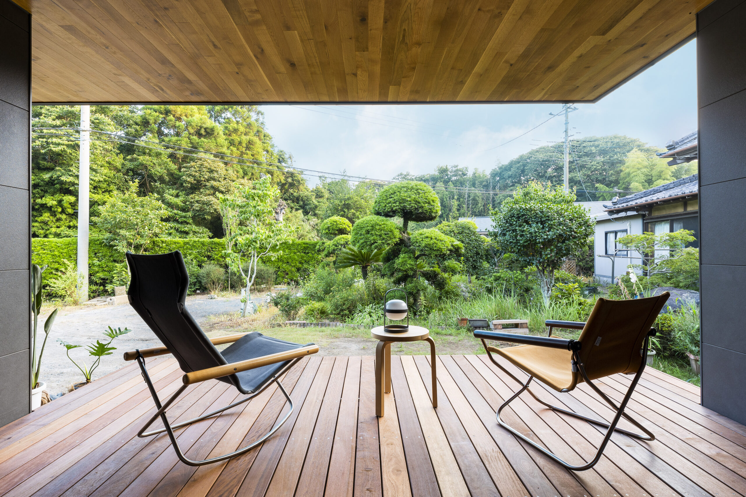 軒の出を約1.4m確保することで、深い庇の下に生まれた半屋外空間には、タイルデッキとウッドデッキを配置。