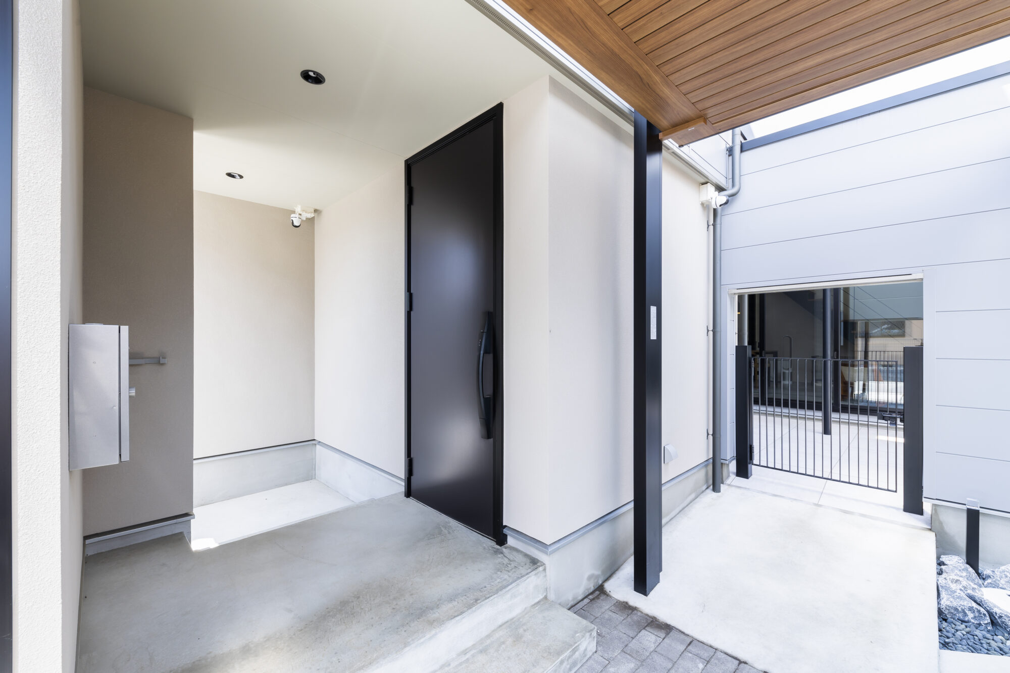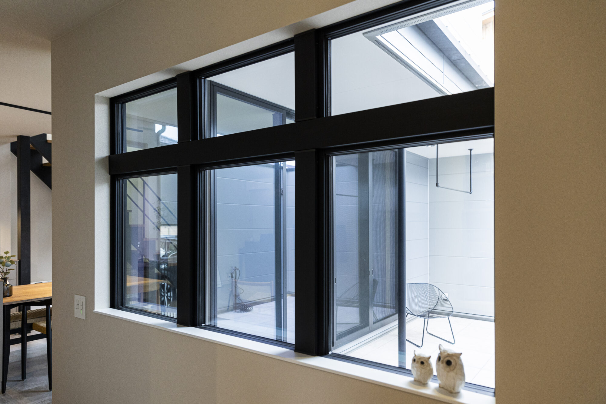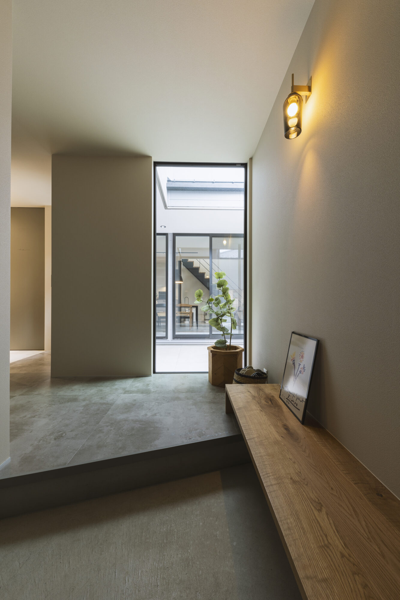 カーポートから玄関を抜け、その先に中庭を配する構成により、光と風を取り込みながらプライバシー性と開放感を両立。