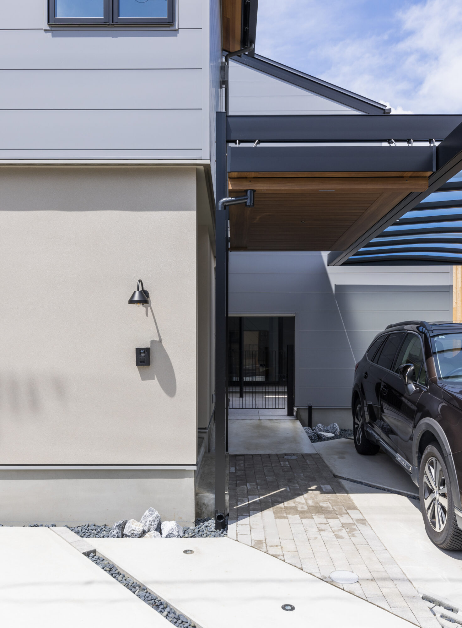 外構計画では斜めに割り付けた土間に、素材の質感を活かしたブリックやボーダーブロックをあしらい、景観との調和とデザイン性を高めています。
