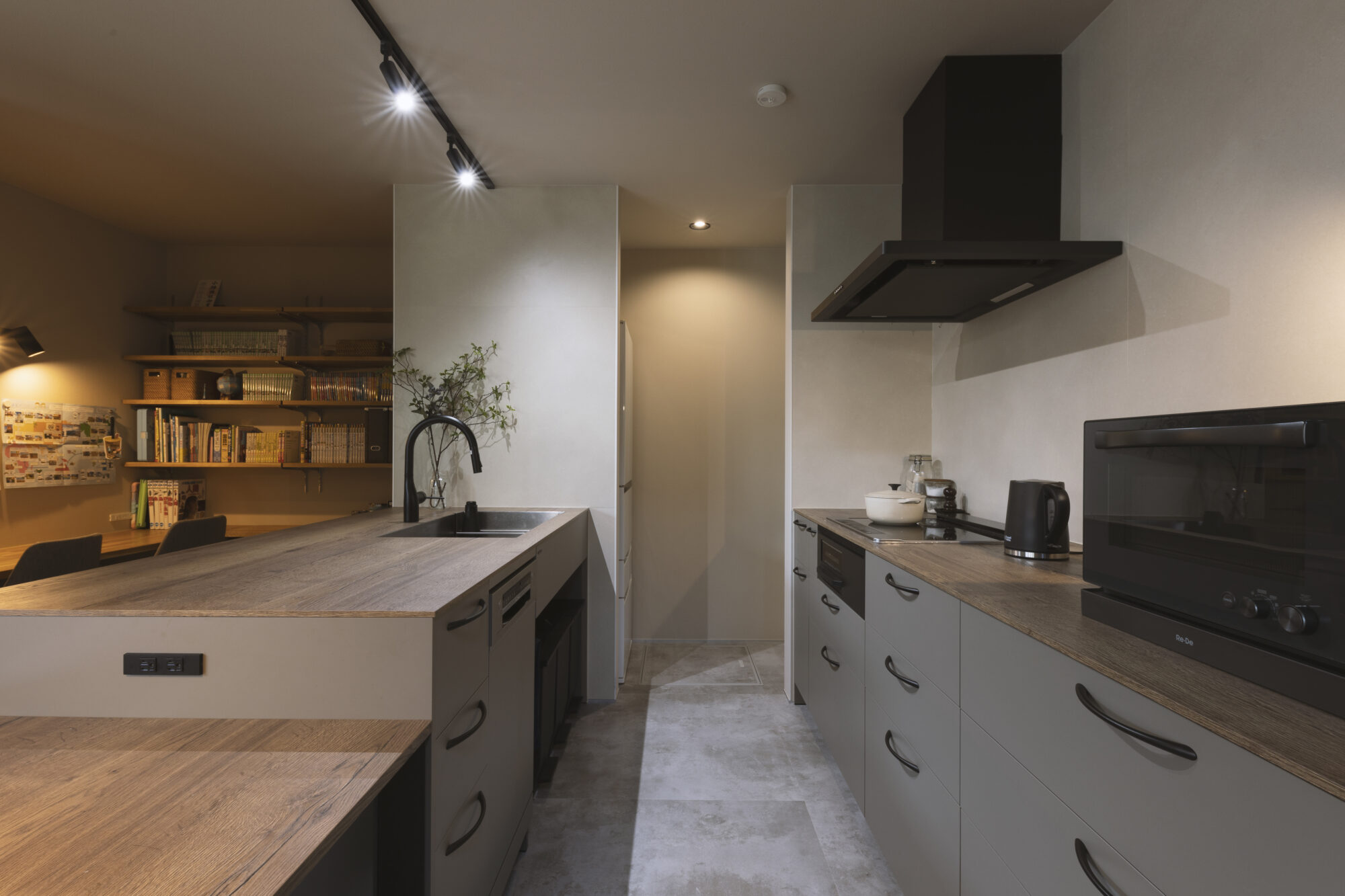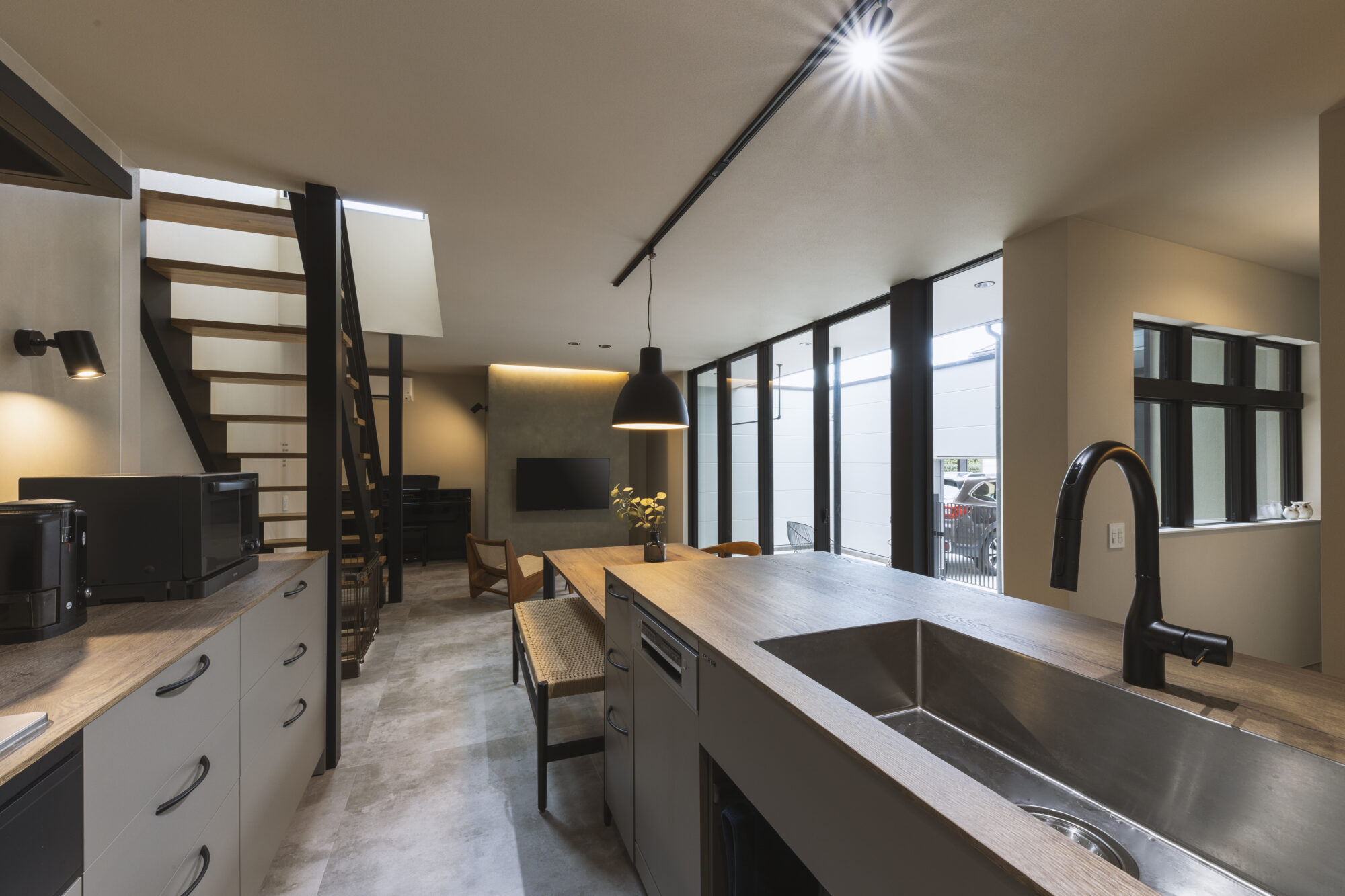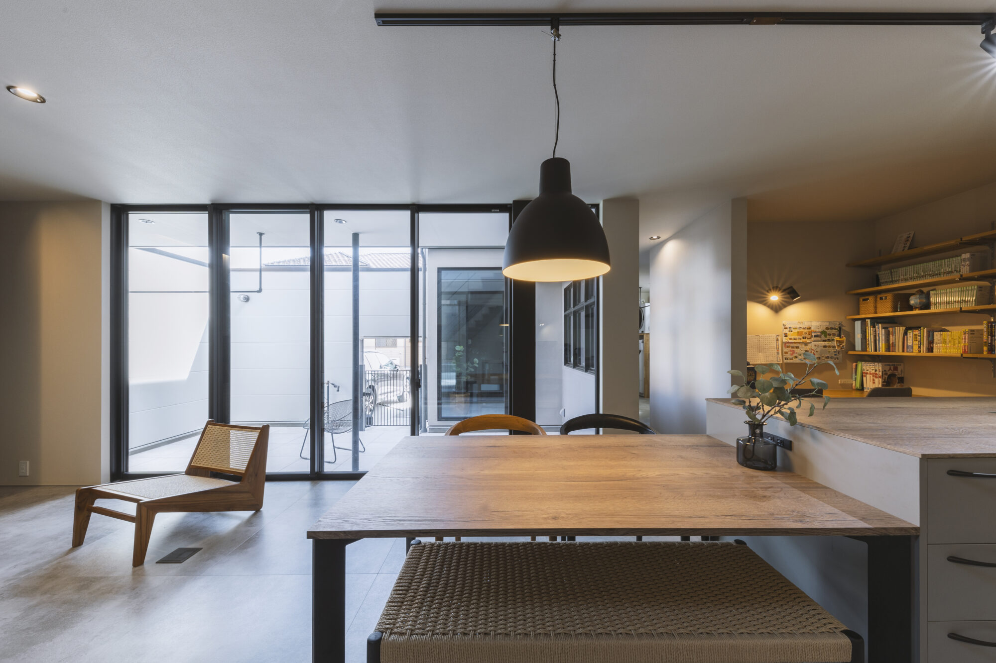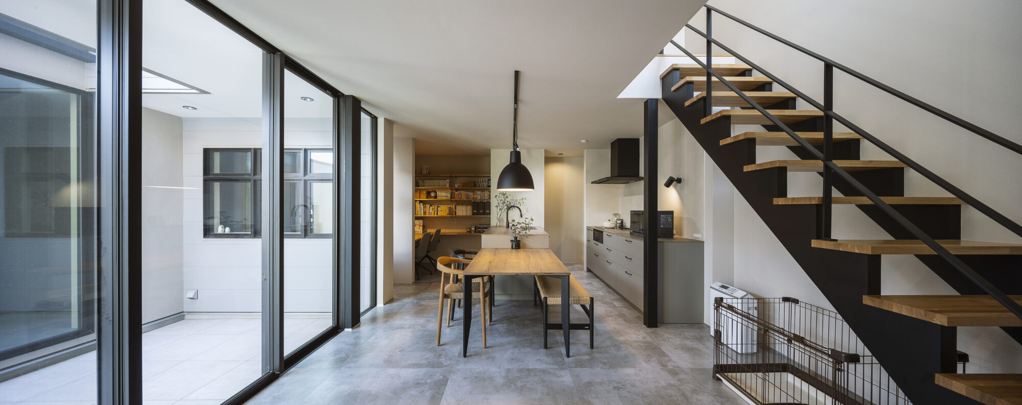 内部空間は、ダイニングとキッチンを暮らしの中心に据え、家族が自然に集い、日々の会話と時間を積み重ねていく場。