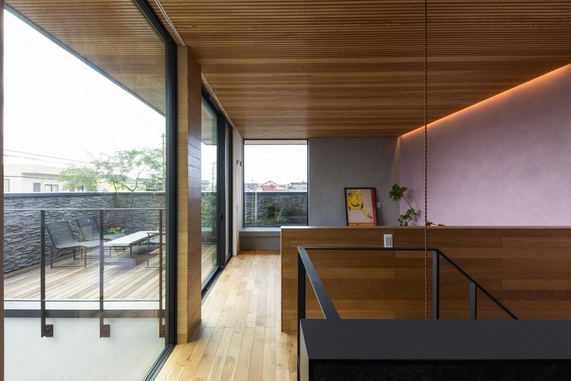 そしてこの住まいの中心には、ツバメが小枝を運び、空に巣を紡ぐように、二階のバルコニーに緑を楽しむ場を設け、リビングとフラットにつなげています。