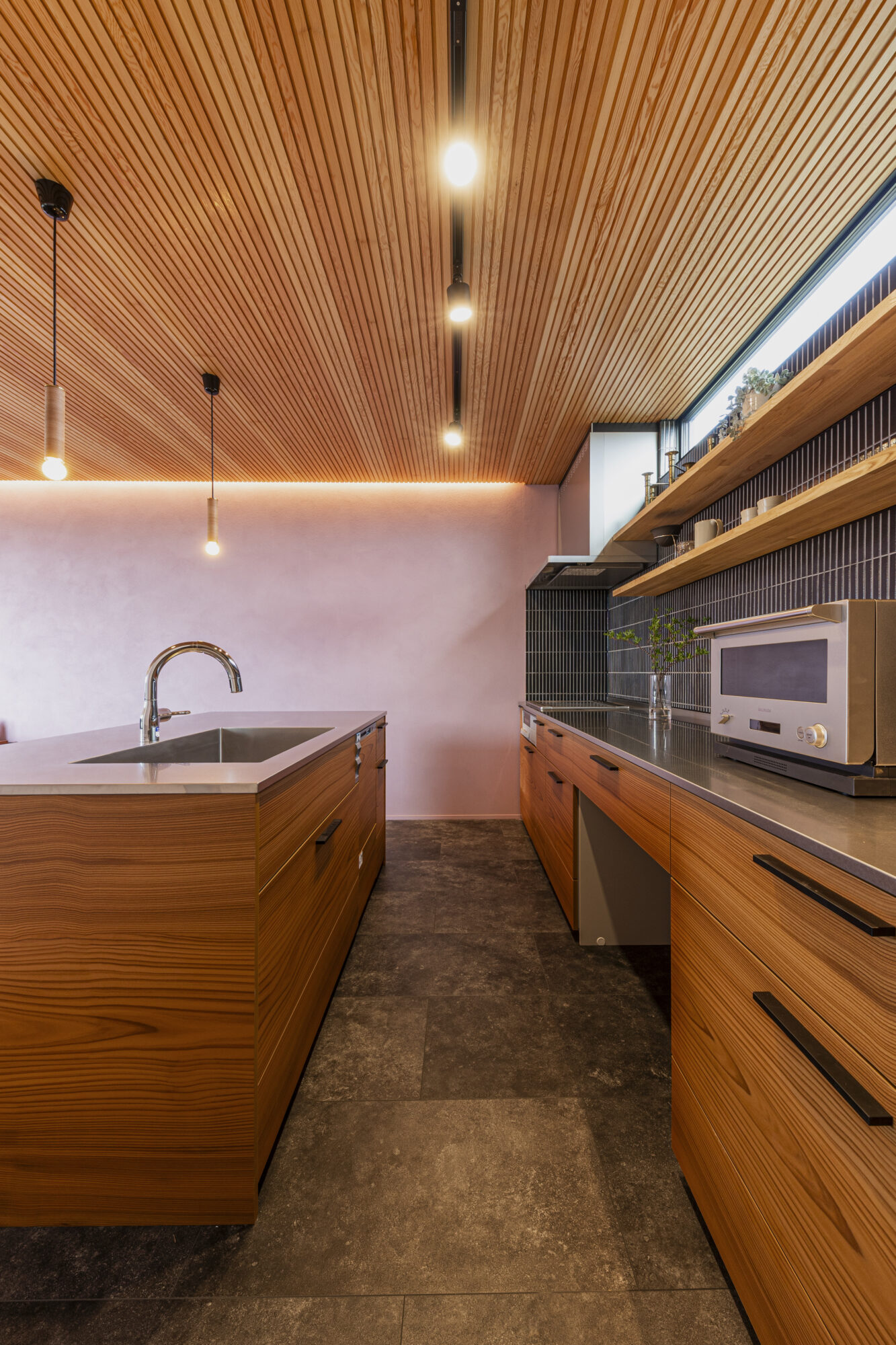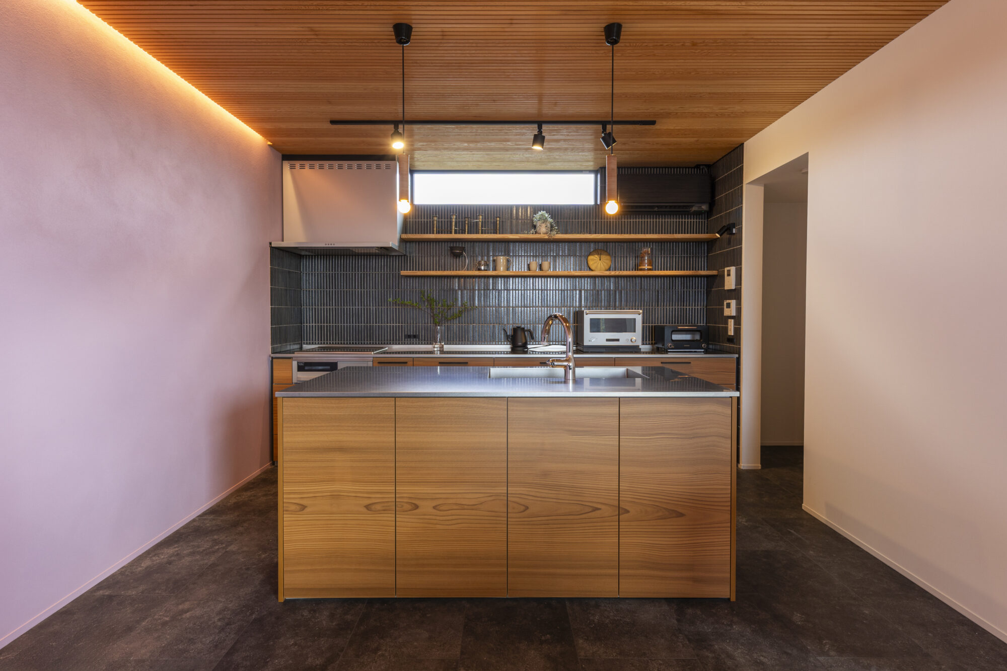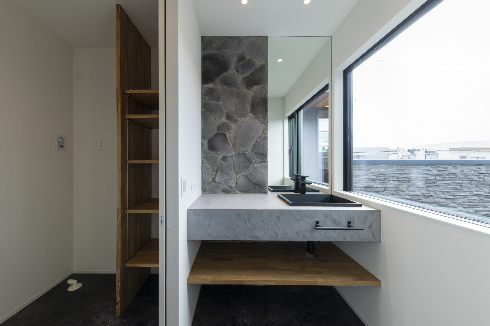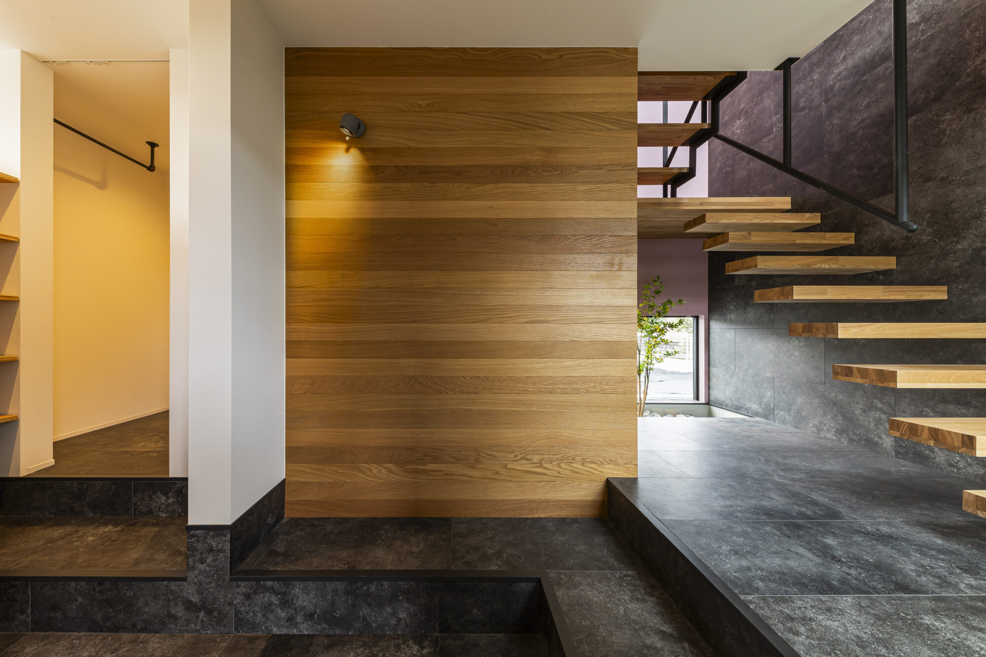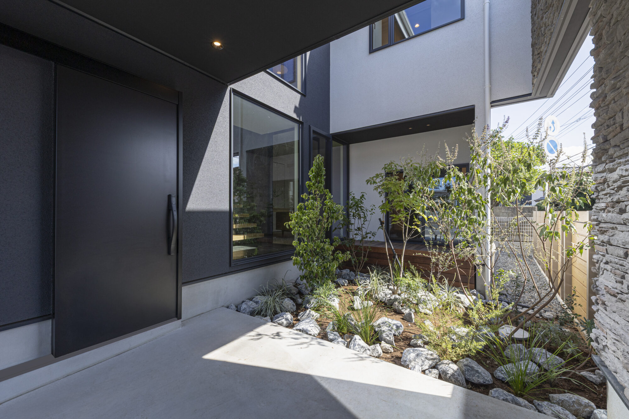 外観はグレーとブラックを基調に、石調タイルとピーラーリブで仕上げ、無骨さの中にも温もりを感じられる住まいの第一印象を形づくりました。