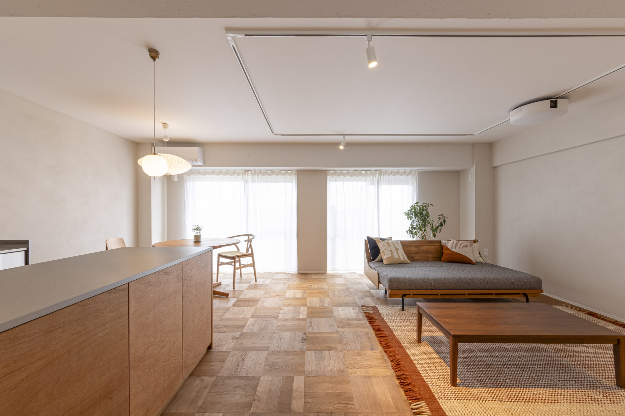 居室は用途に合わせてスケールを調整し、床は継ぎ目の少ない素材で統一。