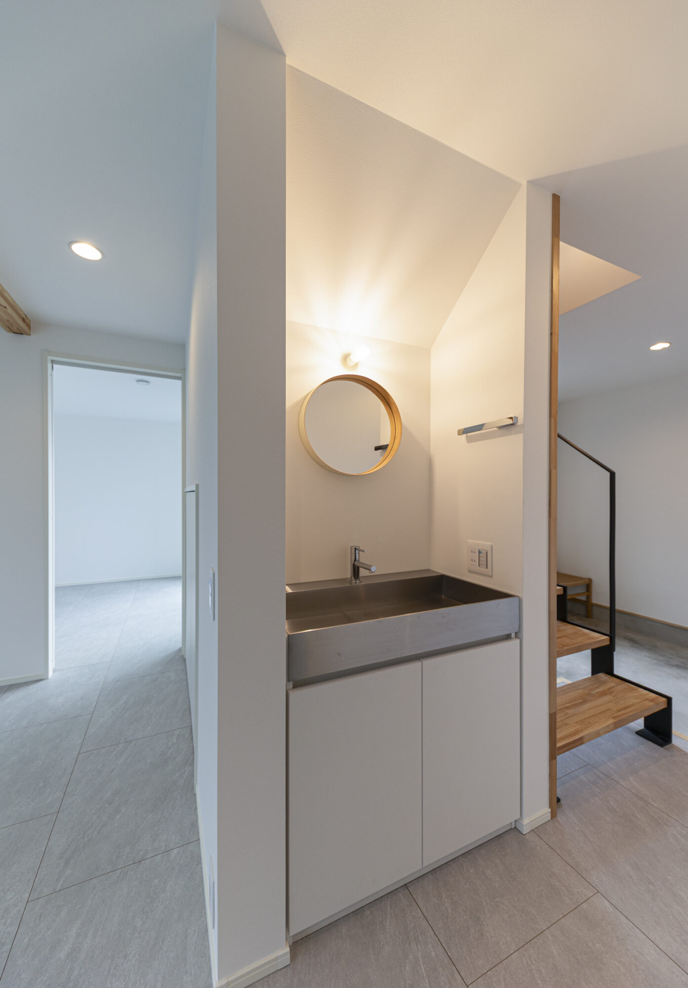 玄関には、力強さをもたらす鉄骨と、あたたかさを添える木の段板を組み合わせた階段。