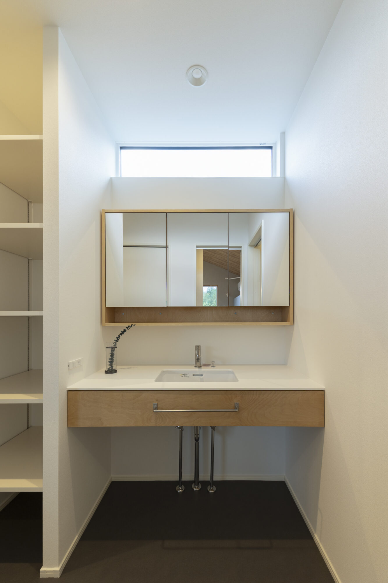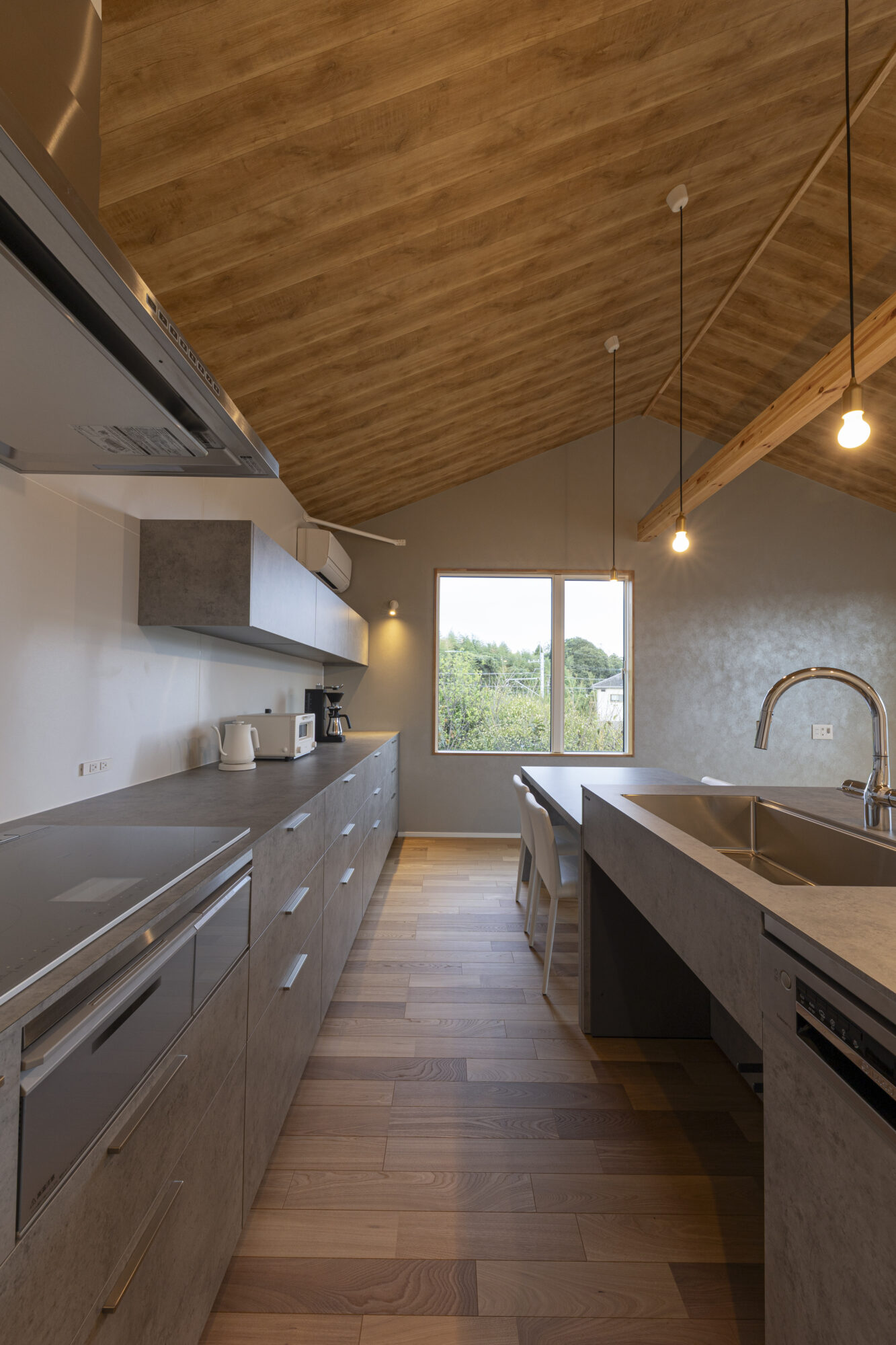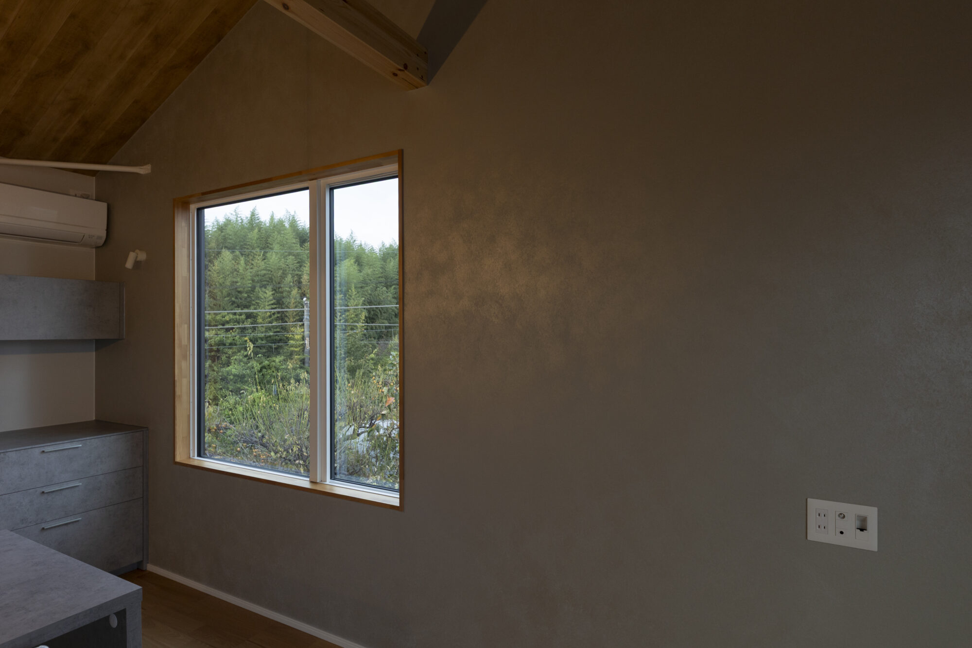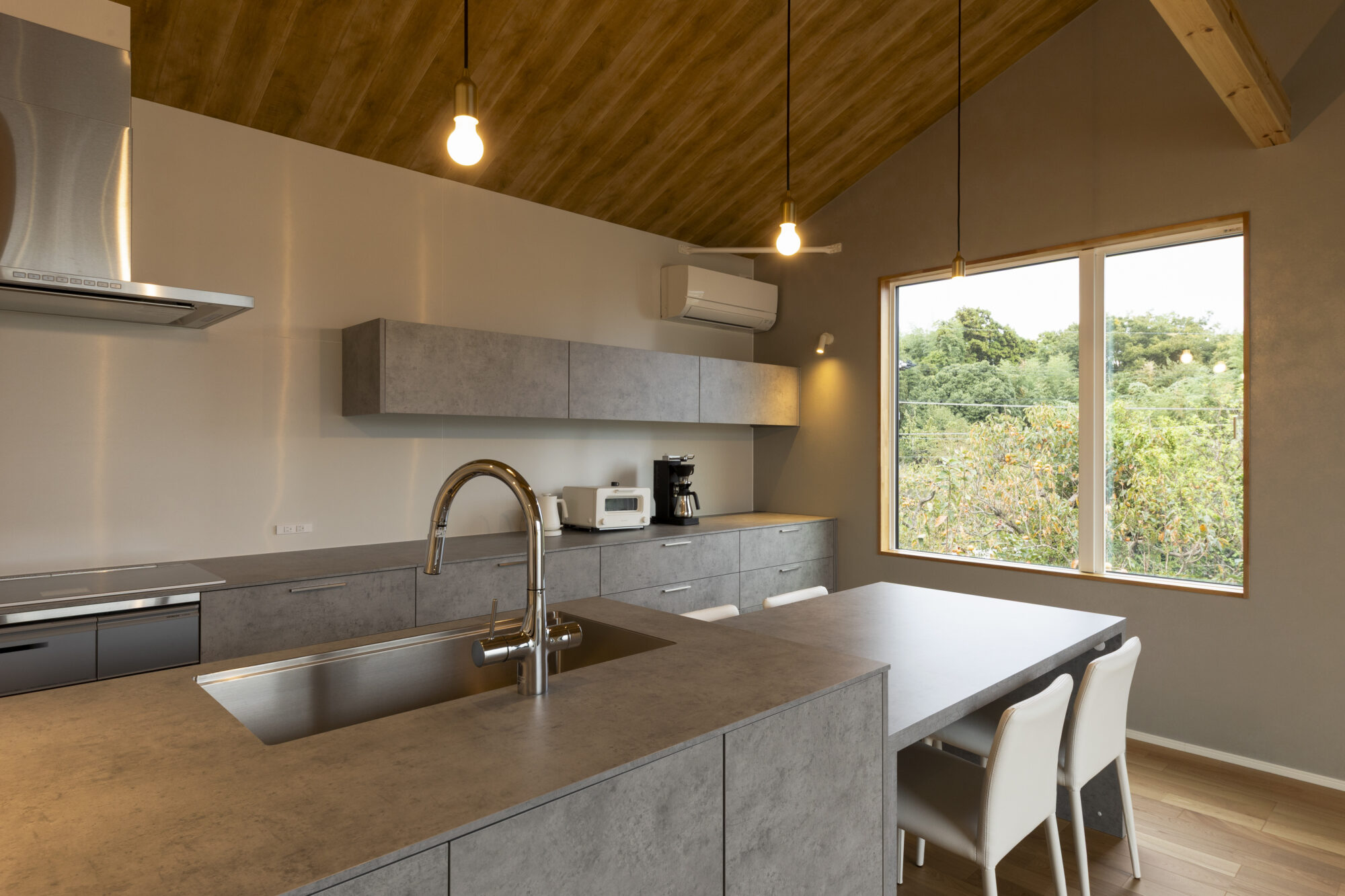 勾配天井の伸びやかな広がりと、大きな窓からの光に包まれ、コンパクトでありながら開放的です。